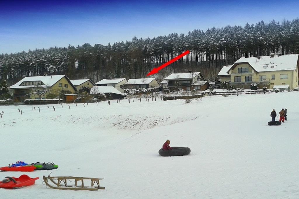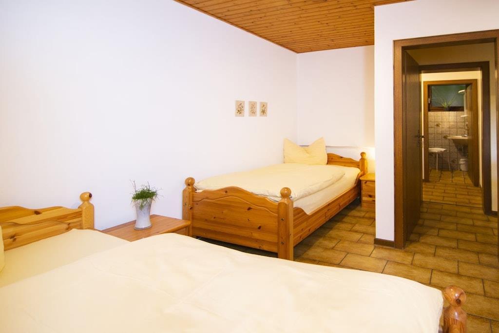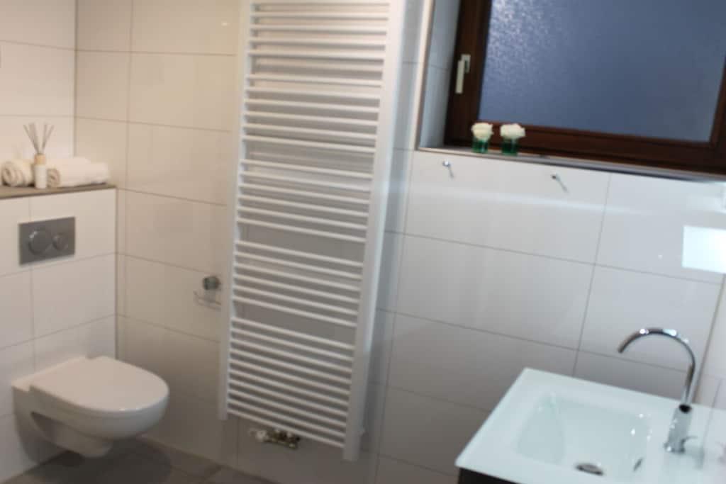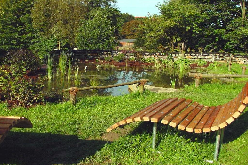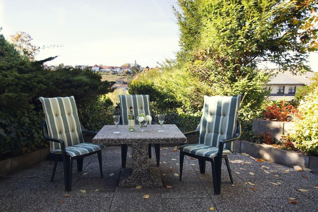 Das Ferienhaus Blumenhain liegt malerisch und ruhig direkt am heimischen Wald. Hier hören Sie noch die Vögel zwitschern und die Rehe kommen sogar bis ans Haus. Das Haus liegt unmittelbar am 144 km langen Sintfeldhöhenweg und wer die Natur liebt oder einfach mal die Seele baumeln lassen möchte, ist hier gut aufgehoben. Die Ferienwohnung "Kirchblick" im Erdgeschoss bietet auf 55qm Erholung für 4 Personen zuzüglich eines Kleinkindes im Babybett. Auf der eigenen Terrasse, die ebenerdig an den geräumigen und sehr gemütlichen Wohn-/Essbereich angrenzt, finden Sie Gartenmöbel mit bequemen Auflagen und einen Grill. Der große Wohn-/Essbereich lädt zu geselligen Kochabenden ein. Das Schlafzimmer mit Doppelbett wird durch eine große Holzschiebetür, die für ausreichend Privatsphäre sorgt, vom Wohnbereich abgegrenzt. Zusätzlich gibt es ein separates Schlafzimmer mit zwei Einzelbetten. Vor dem Badezimmer gibt es einen Garderobenbereich mit großer Schrankwand, wo Sie Ihre Koffer oder andere Reiseutensilien unterbringen können. Erholung bietet auch das moderne Bad mit Fußbodenheizung, ebenerdiger Regendusche, WC und Fenster. Im Küchenbereich finden Sie Kaffeemaschine, Wasserkocher, Herd, Backofen, Kühlschrank und Toaster. Der Geschirrspüler sorgt für Entlastung bei den Kochabenden. Im Wohnbereich können Sie es sich beim Fernsehabend auf Polstergarnitur oder im Sessel bequem machen. Im Smart-TV können Sie sich in Ihre eigenen Accounts der großen Streamingdienste einloggen. Erholen Sie sich nach einem ereignisreichen Wander- oder Wintersporttag durch die Fußbodenheizung der ganzen Wohnung in warmer, kuscheliger Atmosphäre oder genießen Sie die Abendsonne auf der Terrasse und den Panoramablick ins Aatal bzw. auf die Oberstadt. Spätabends oder gleich frühmorgens lohnt sich ein Spaziergang zum See, der dann einsam und verträumt in der Landschaft liegt. Vielleicht nutzen Sie Ihren Urlaub auch mal für ein schönes Picknick auf den Grünflächen um den See herum? Unsere Gäste brauchen nicht ihren halben Hausstand einzupacken. Bettwäsche, Handtücher und Geschirrtücher sind selbstverständlich gratis. Auch die Kosten der Kurabgabe übernehmen wir für Sie und sind im Preis bereits enthalten. Darüberhinaus ist die Benutzung von Waschmaschine und Trockner möglich. Wir sorgen dafür, dass alles da ist, was Ihren Urlaub zu einem unvergesslichen Erlebnis werden lässt. Schon bei der persönlichen Begrüßung halten wir manchen Tipp für Sie bereit und beantworten sehr gerne alle offenen Fragen. Direkt vor dem Haus stehen Ihnen ausreichend kostenlose Parkplätze zur Verfügung. Kinder werden im Winter von dem Rodelhang direkt unterhalb des Hauses begeistert sein. Wasserratten vergnügen sich im 500 Meter entfernten Frei- und Hallenbad. Im Sommer lockt der nur 1 km entfernte Familypark mit See, Bootsverleih, Angelmöglichkeit, Tierpark, Streichelzoo, Wasserspielplatz und als besonderes Highlight der beliebte Barfußpfad mit Kneipp-Oase. Action verspricht die neue Mountainbike Downhillstrecke im Bikepark Bad Wünnenberg. Ruhe und Erholung hingegen versprechen der Kurpark mit seinen Sommerkonzerten und das naturnahe Aatal an dessen Ende die grandiose Aatalsperre mit einem großen Wandergebiet aufwartet. Rund um die Talsperre gibt es auch eine ebenerdige 9km lange Inlineskaterbahn. Sehenswürdigkeiten bieten sich direkt in Bad Wünnenberg mit dem historischen Wehrturm und Speicher sowie dem Spankenhof an. In beiden historischen Stätten können auch Trauungen vorgenommen werden. Im Ortsteil Fürstenberg sind das alte Gericht am Schloß mit Kerker zu besichtigen und im Ortsteil Bleiwäsche der Steinbruch mit Aussichtsplattform. In Bad Wünnenberg finden Sie selbstverständlich eine große Auswahl an Restaurants, Cafés, Supermärkten, Apotheke, Tankstelle und eine Tourismusinformation mit E-Bike und Fahrradverleih.