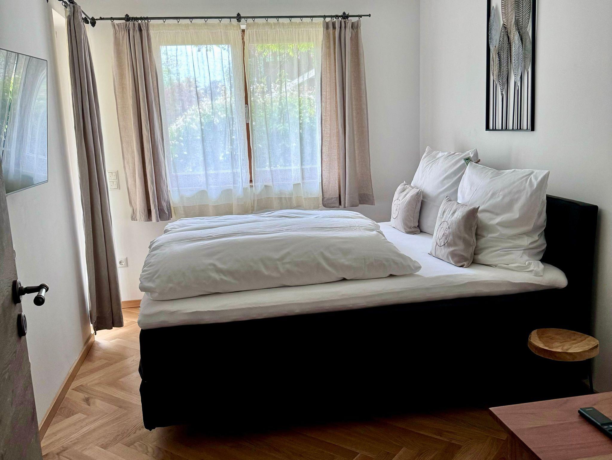 Alpine Lebensart gepaart mit schlichter Eleganz, bodenständig und luxuriös zugleich. Im Erdgeschoß gelegen, private Garten-Sauna, Parkettfußboden, Smart-TV, Nichtraucherwohnung, Fußbodenheizung,Panoramafenster mit Südost Gartenterrasse, eingezäunter Garten (110 qm), Boxspringbetten 180x200 cm und 160x200 cm, 2.WC extra, hochwertige, komplett ausgestattete Küche,Highspeed Internet, ebenerdige Rainshowerdusche und Leihbademantel. Neubau in Seenähe. Ruhige Lage in einer Sackgasse gelegen.