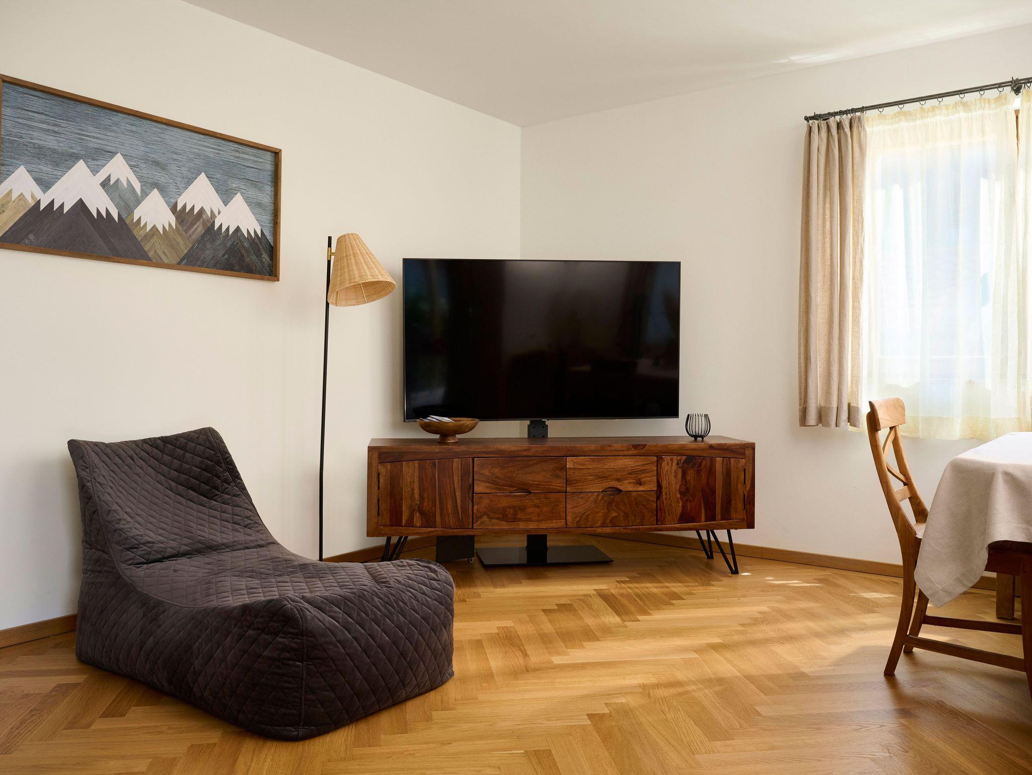 Alpine Lebensart gepaart mit schlichter Eleganz, bodenständig und luxuriös zugleich. Im Erdgeschoß gelegen, eigene Garten-Sauna, Parkettfußboden, Smart-TV, Nichtraucherwohnung, Panoramafenster mit Gartenterrasse, Boxspringbetten 180 x 200,Doppelbett 160x200 cm im zweiten Schlafzimmer, WC extra, hochwertige Küche, voll ausgestattet, Leihbademantel, Pflegeprodukte, Objekt in einer ruhigen Sackgasse.