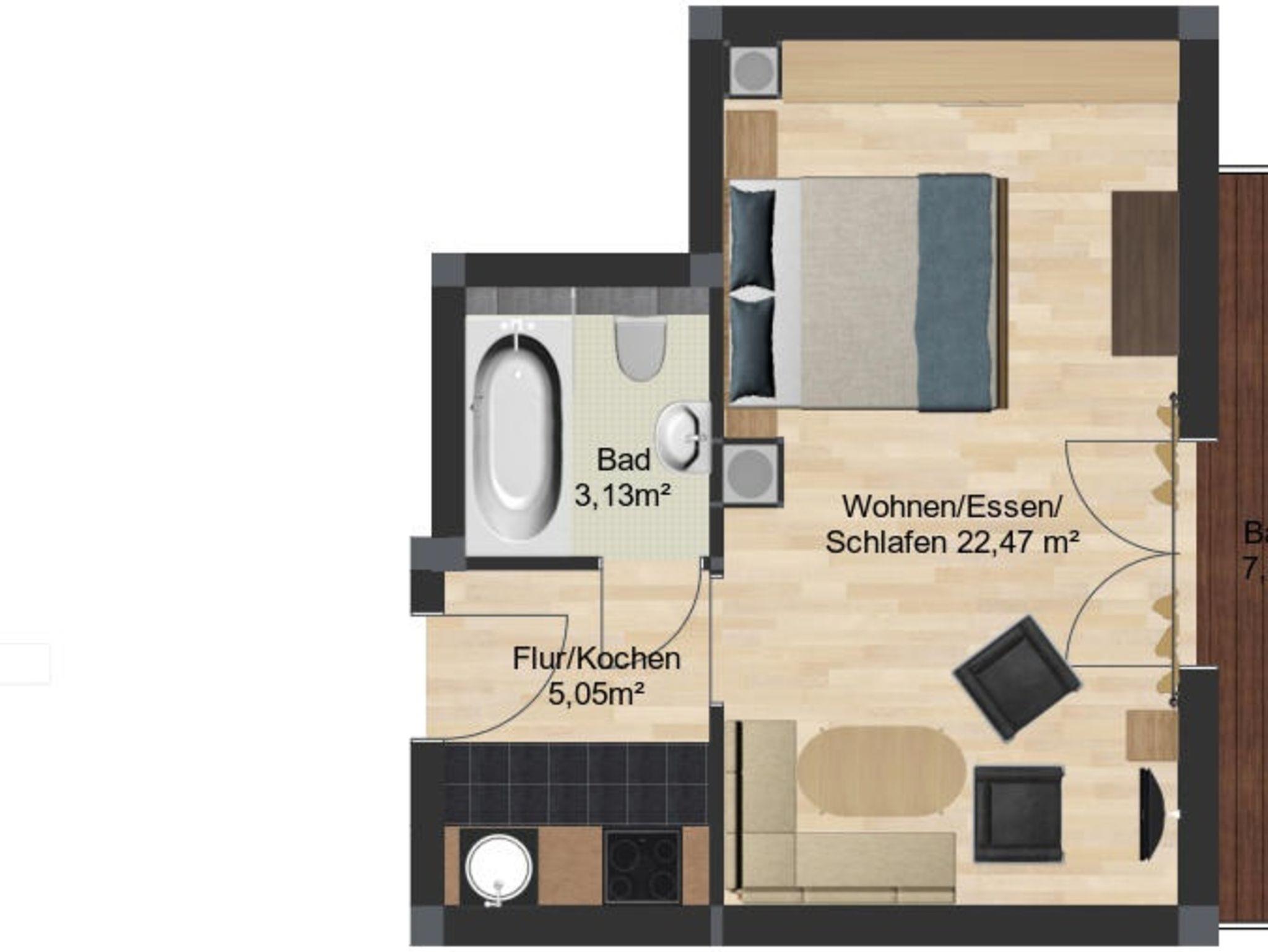 Die 1-Zimmer-Wohnung hat eine Größe von 33qm und ist ideal für 1 bis 2 Personen.