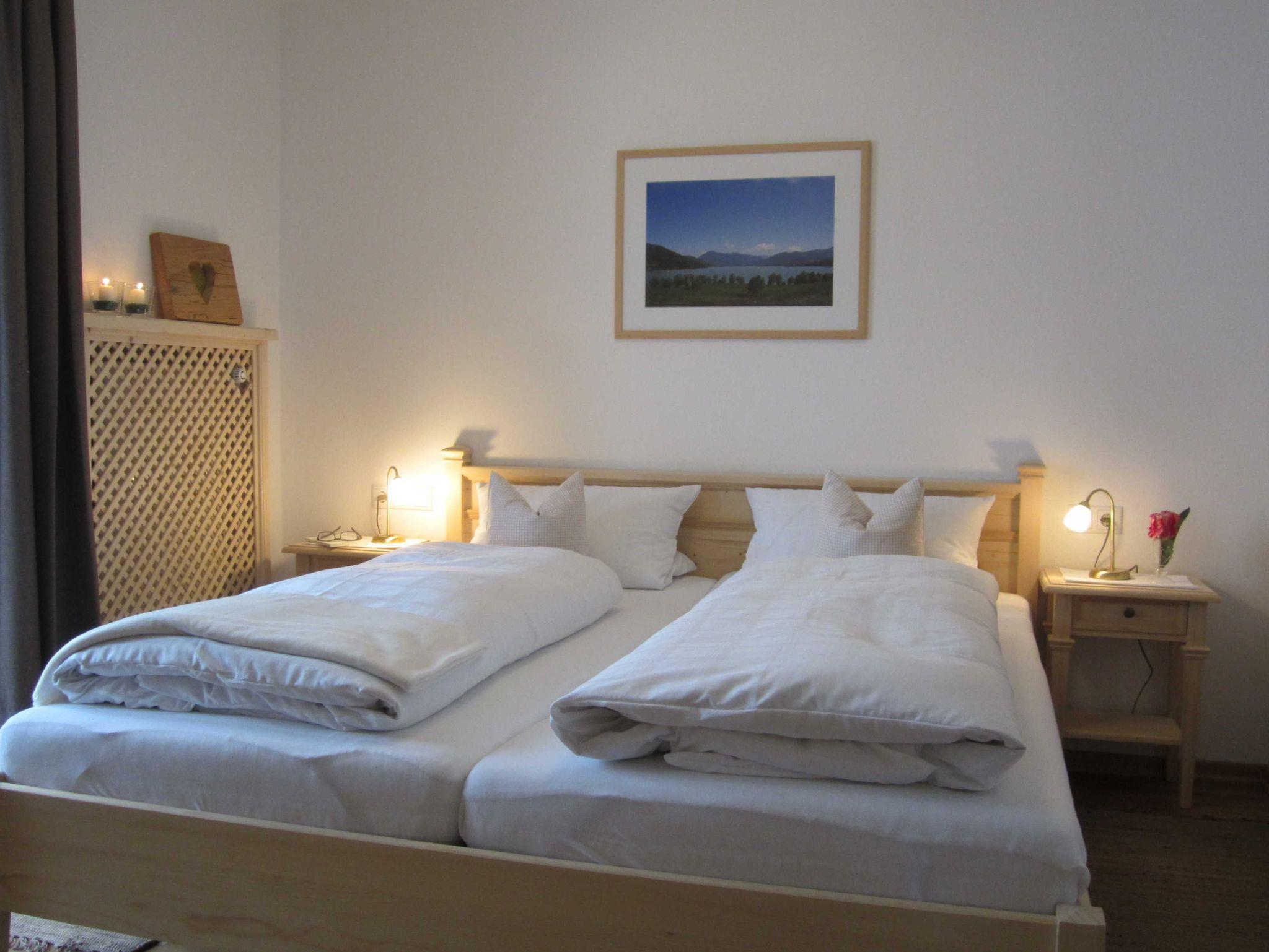 Frisch möbliert und gut ausgestattet ist diese Wohnung. Wohnzimmer mit LCD-Fernseher, CD-Radio, Küche mit Mikrowelle, Cerankochfeld, Gefrierfach und ein Schlafzimmer mit kleinem Bad (Dusche/WC). Die Wohnung liegt im Haupthaus im Hochparterre. Wer mag, kann von der großen Süd-Ost Terrasse eben schnell hinunter zum See laufen, die Füße abkühlen, wieder zurücklaufen und dann ganz und gar seine Ruhe genießen. Der Blick darf dann über den Tegernsee und die Tegernseer Bergwelt schweifen...