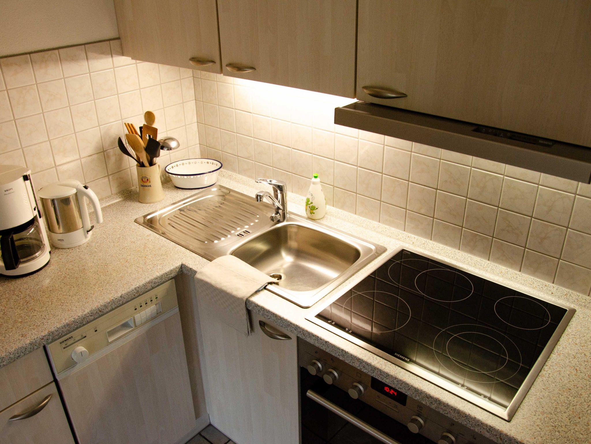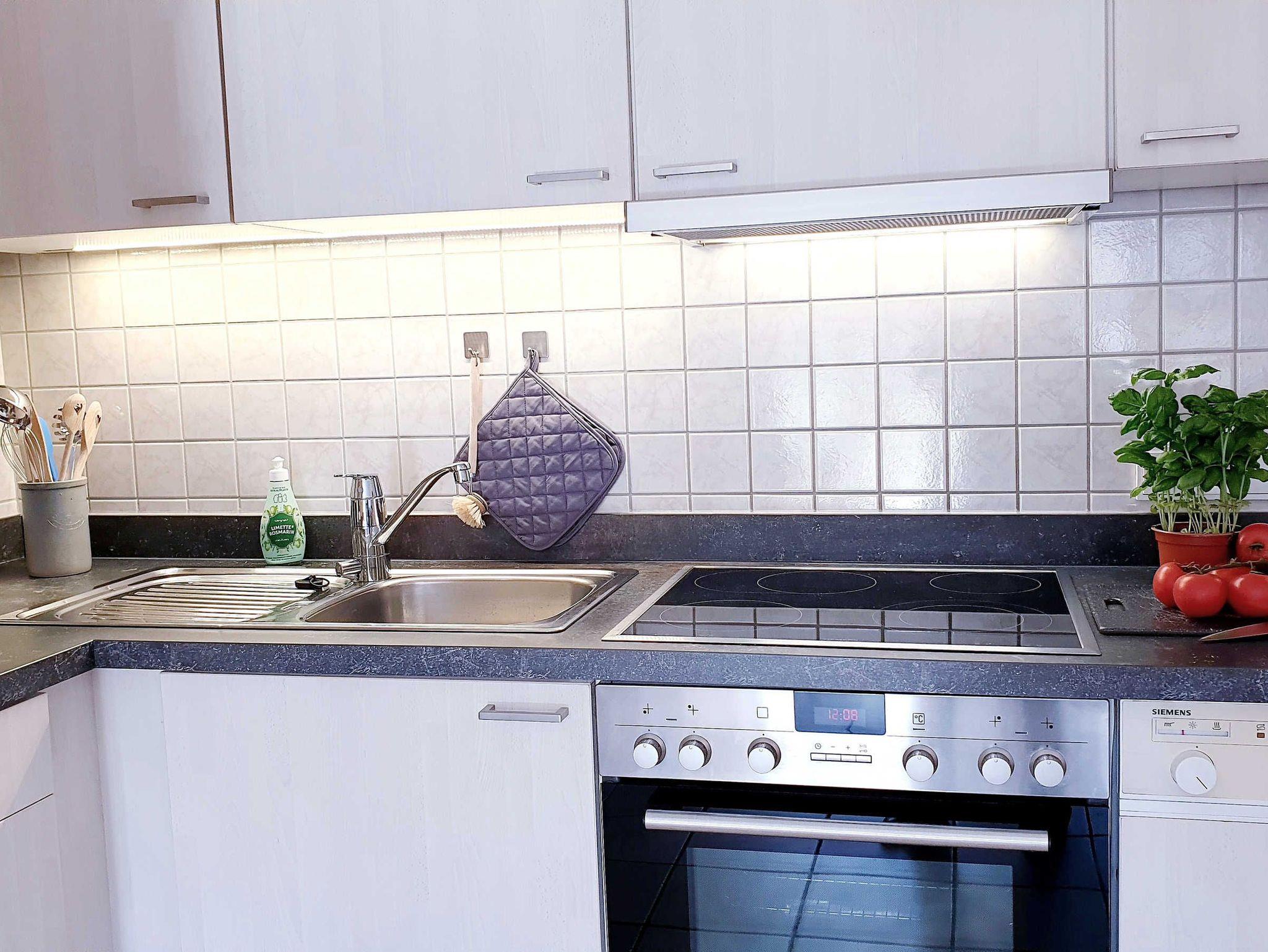 • Komplett und modern ausgestattete Küchenzeile mit Spülmaschine, Backofen,
