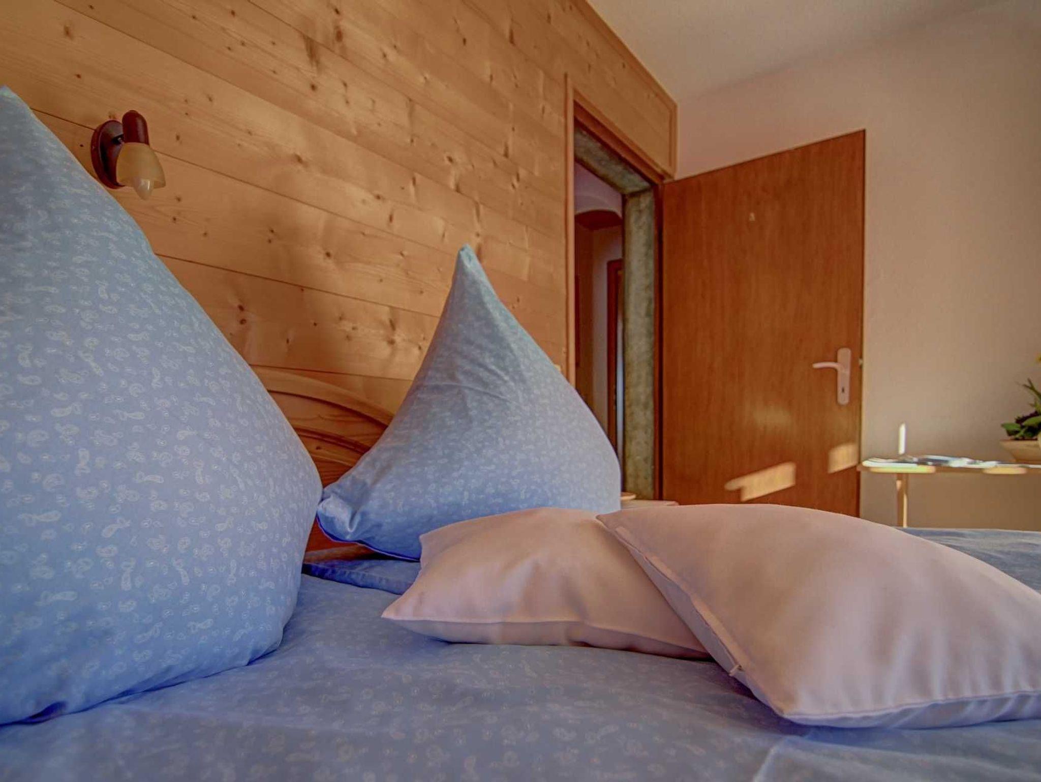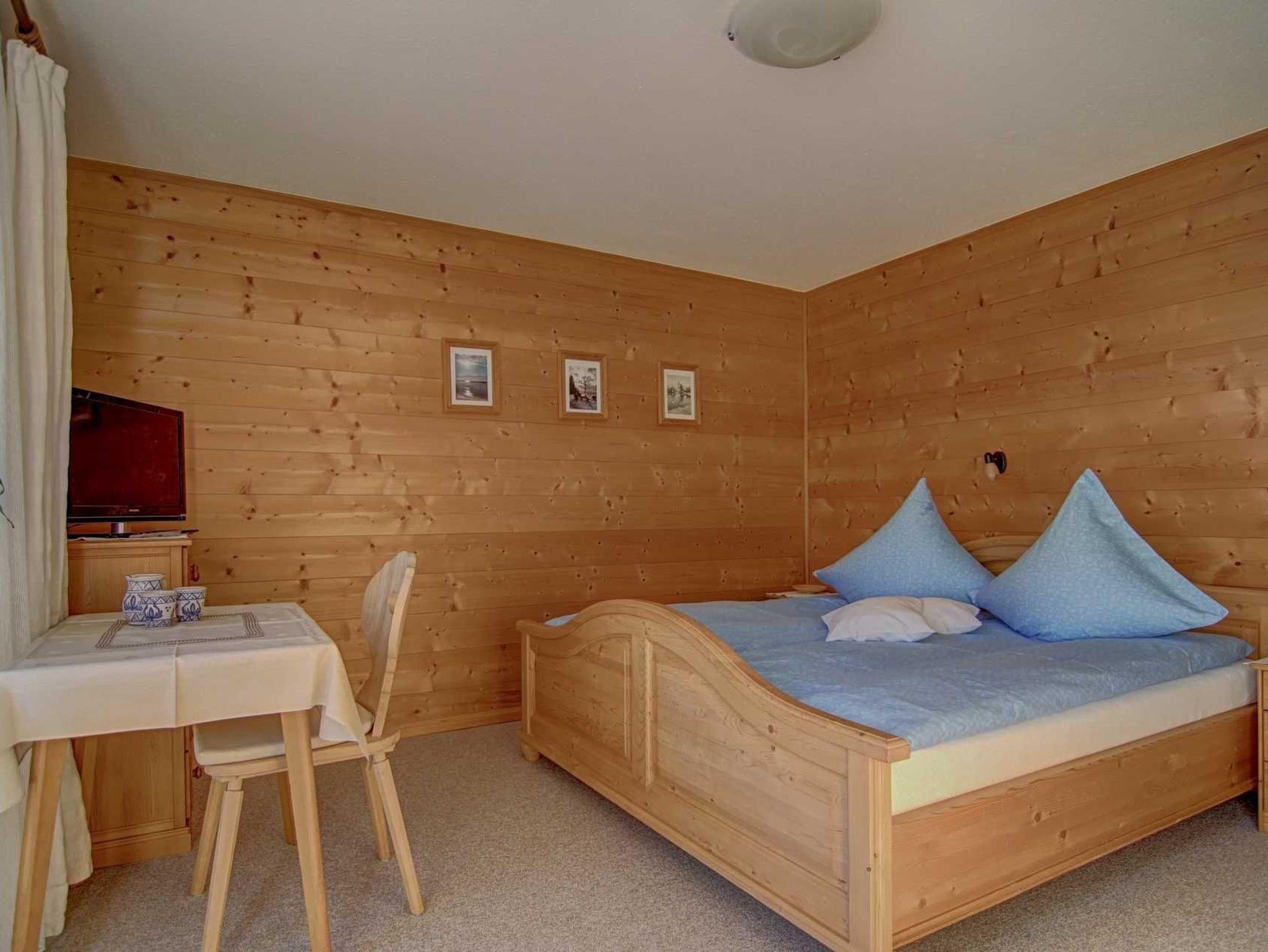 Schlafraum mit Doppelbett sowie Bad mit WC und separater Küche.
