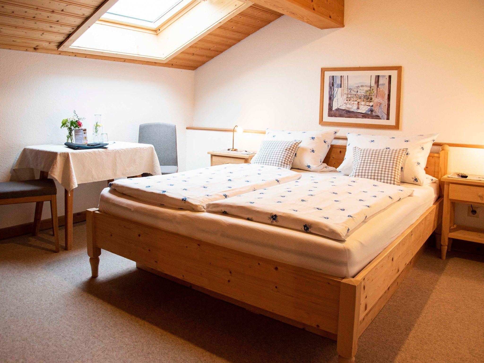 Unser gemütliches Mansarden-Doppelzimmer befindet sich im 2. Obergeschoss und bietet mit Dachflächenfenster einen einmaligen Ausblick in den Sternenhimmel. Es verfügt über einen Flachbild-TV mit Satellitenanschluss, Wlan und über ein Etagenbad zur alleinigen Nutzung.