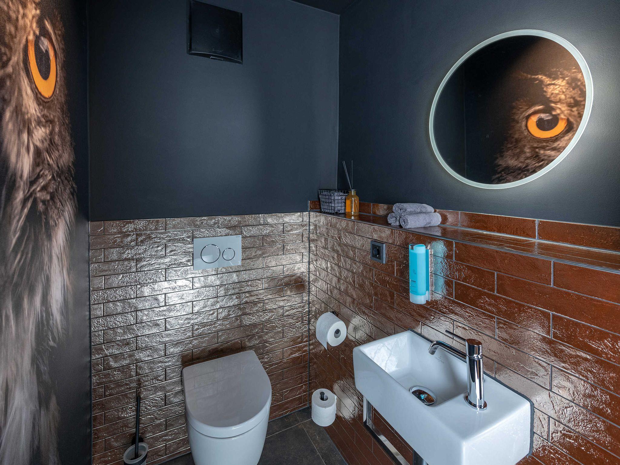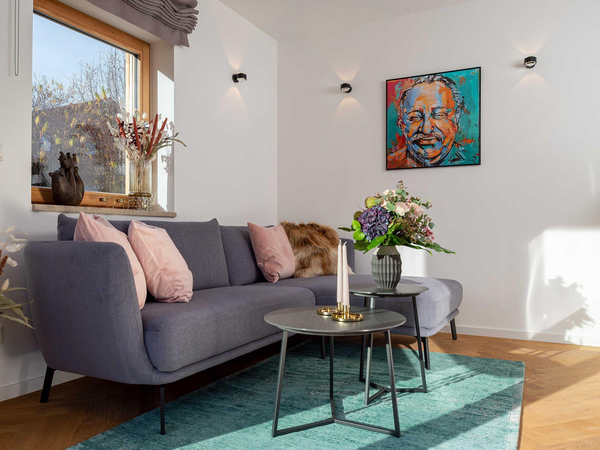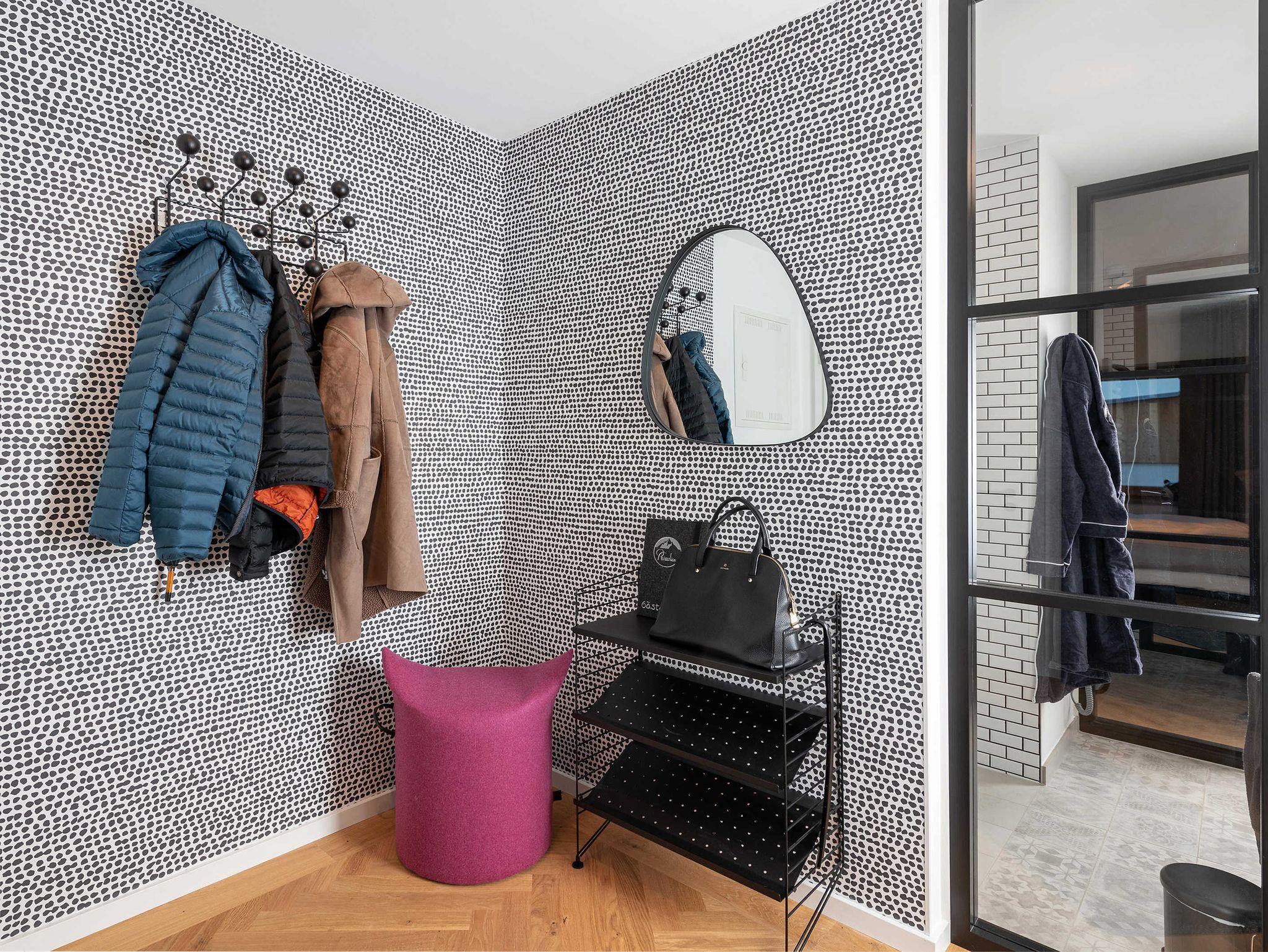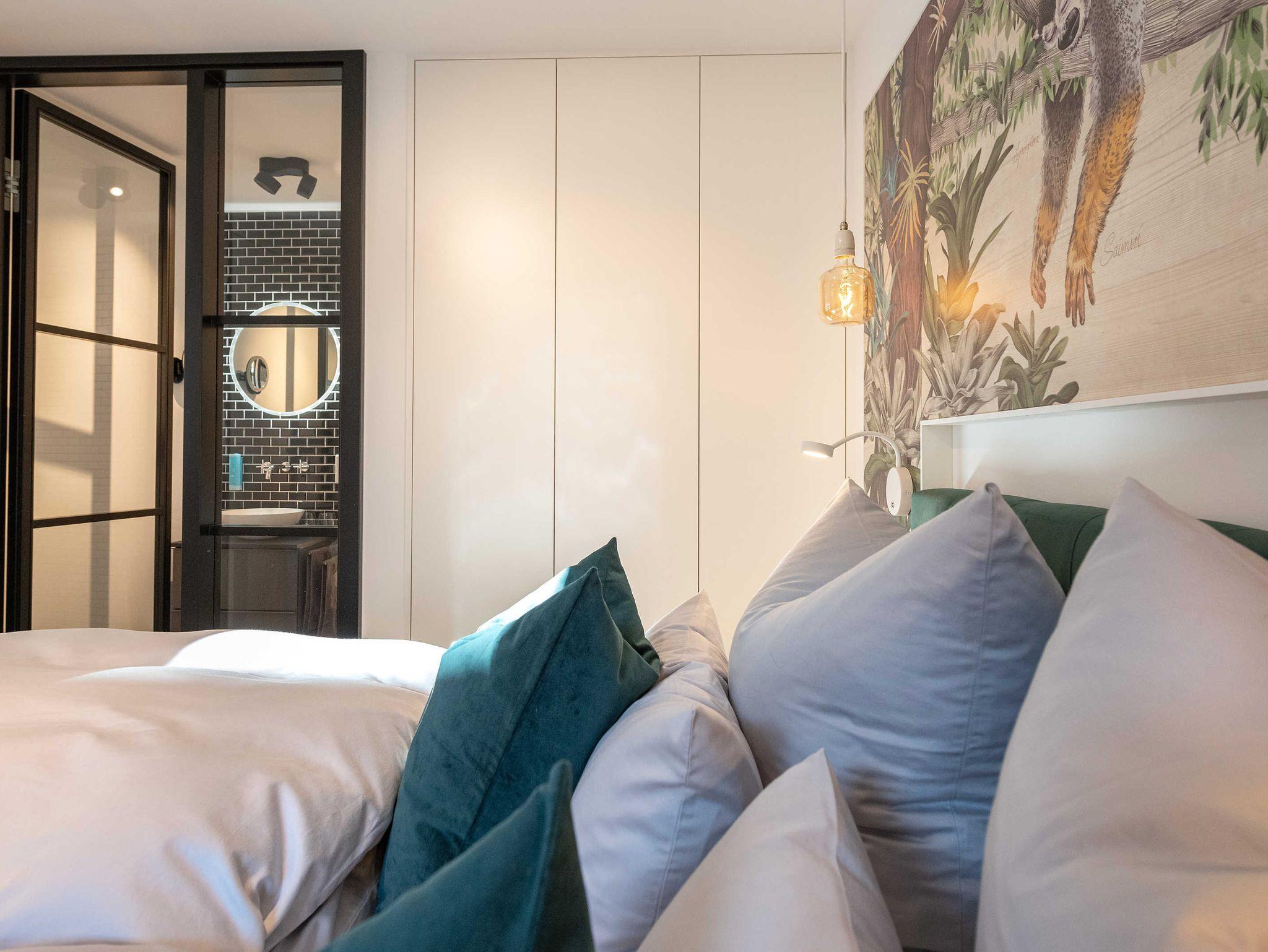 Italienische Designerlampen von Foscarini und weitere Designklassiker von Vitra und String sowie die Designmöbel aus der Schöner Wohnen Collection erfreuen Ihr Auge und Ihre Sinne ebenso wie das gemütliche Boxspringbett mit besten Matratzen, dass aussergewöhnliche Duschbad und die vollständige Ausstattung die keine Wünsche offen lässt.