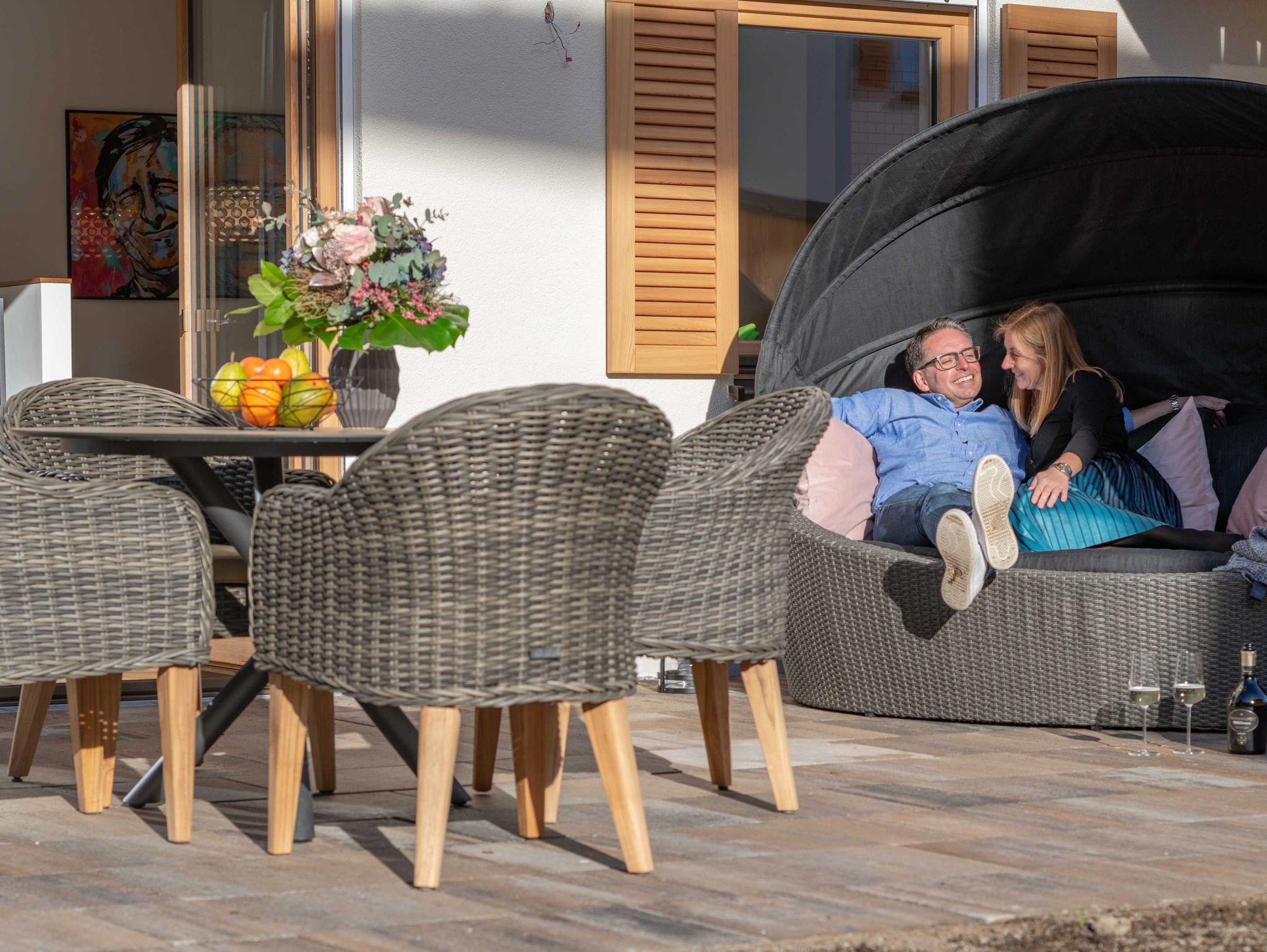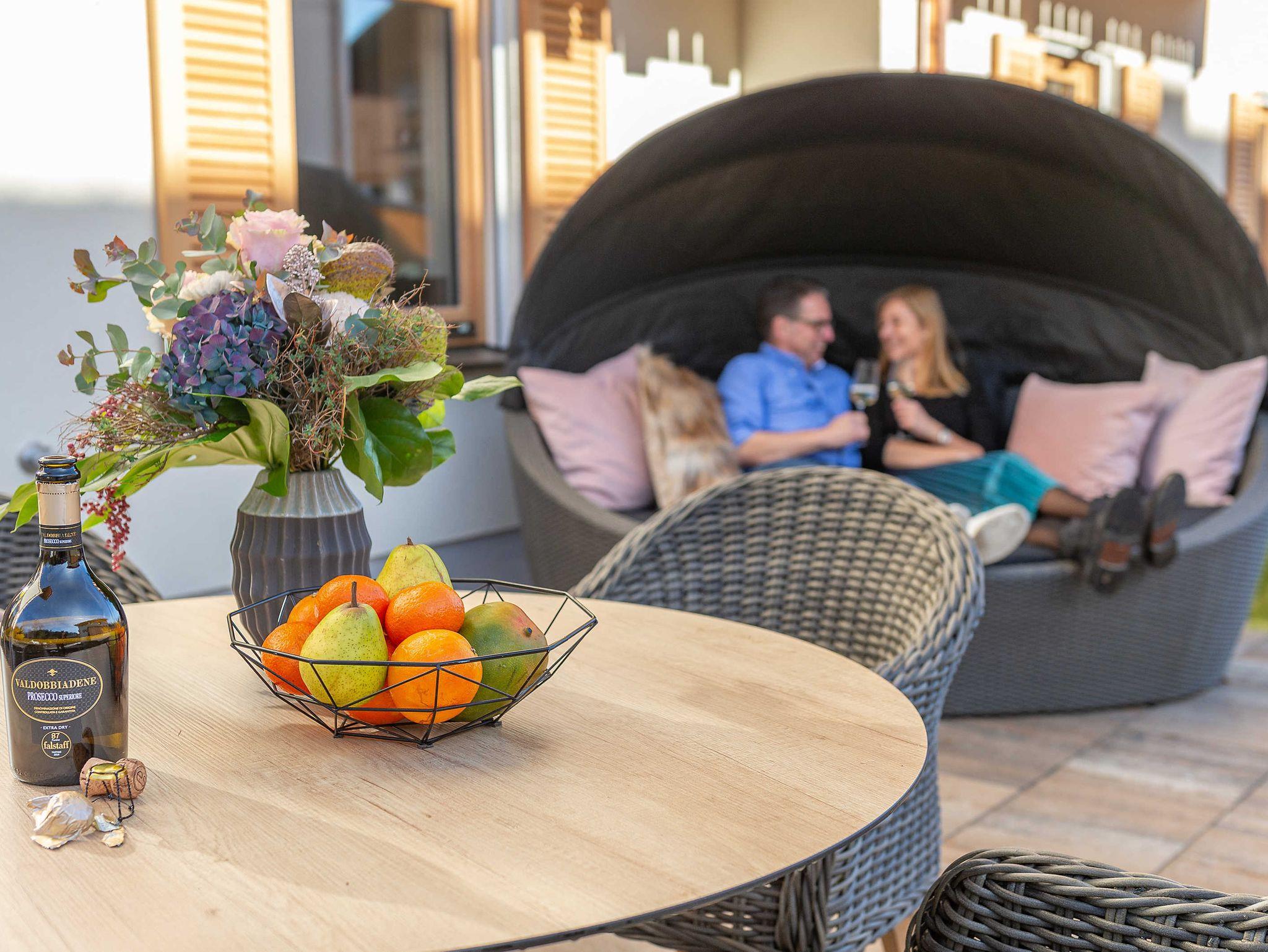 Mit einer Wohnfläche von rund 55 m² und mit dem privaten Garten in Süd-Westausrichtung bietet die Ferienwohnung mehr als genug Platz für zwei Personen. Auf der zur Wohnung gehörenden Sonnenterrasse mit Grill und den schönen Loungemöbeln genießen Sie Ihre Zeit zu Zweit. Es wird Ihnen an nichts fehlen.