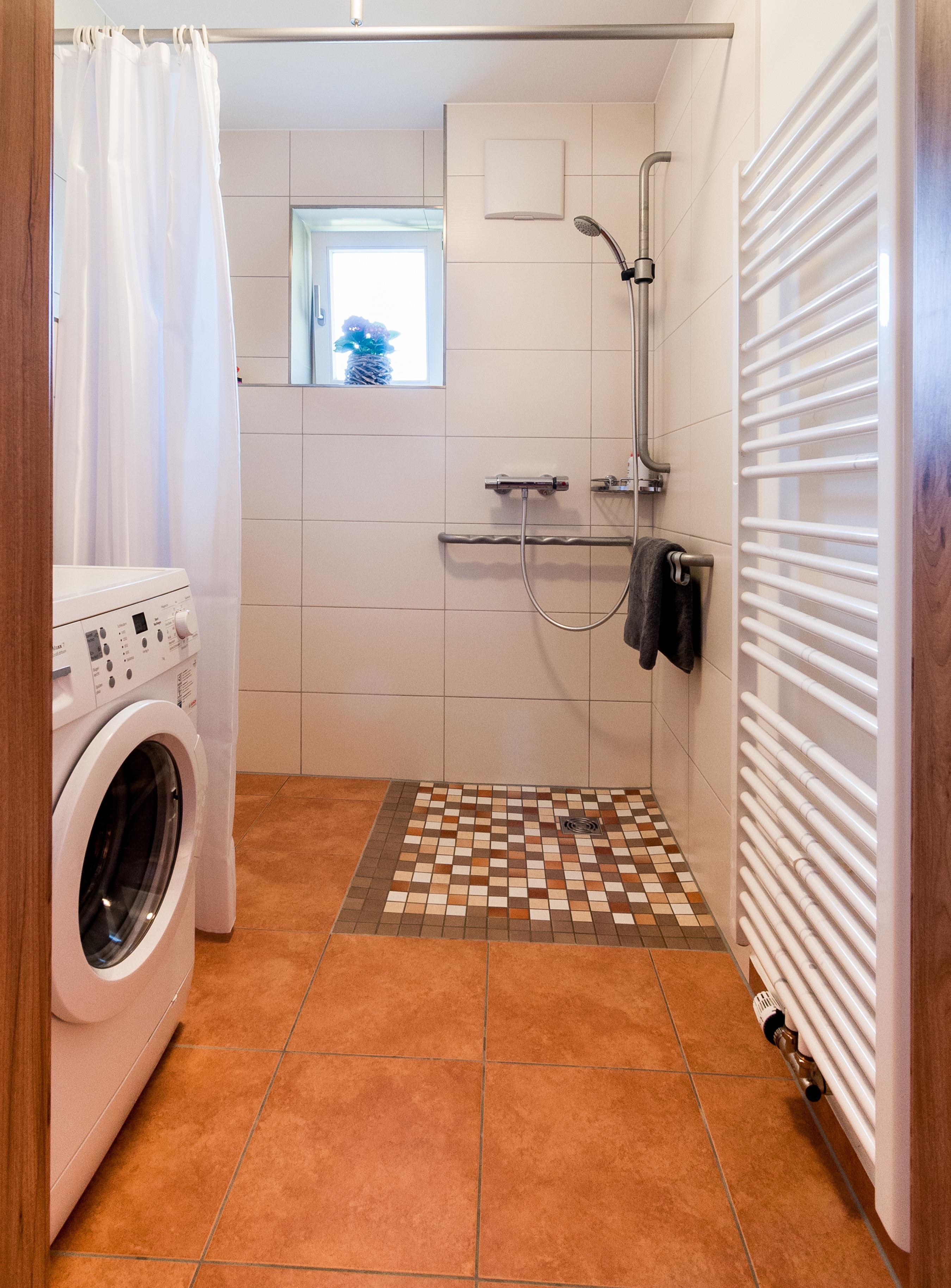 In dem Duschbadezimmer hat die Wohnung eine Waschmaschine, welche mit einem Münzzähler funktioniert. (Kosten pro Waschladung 5€)