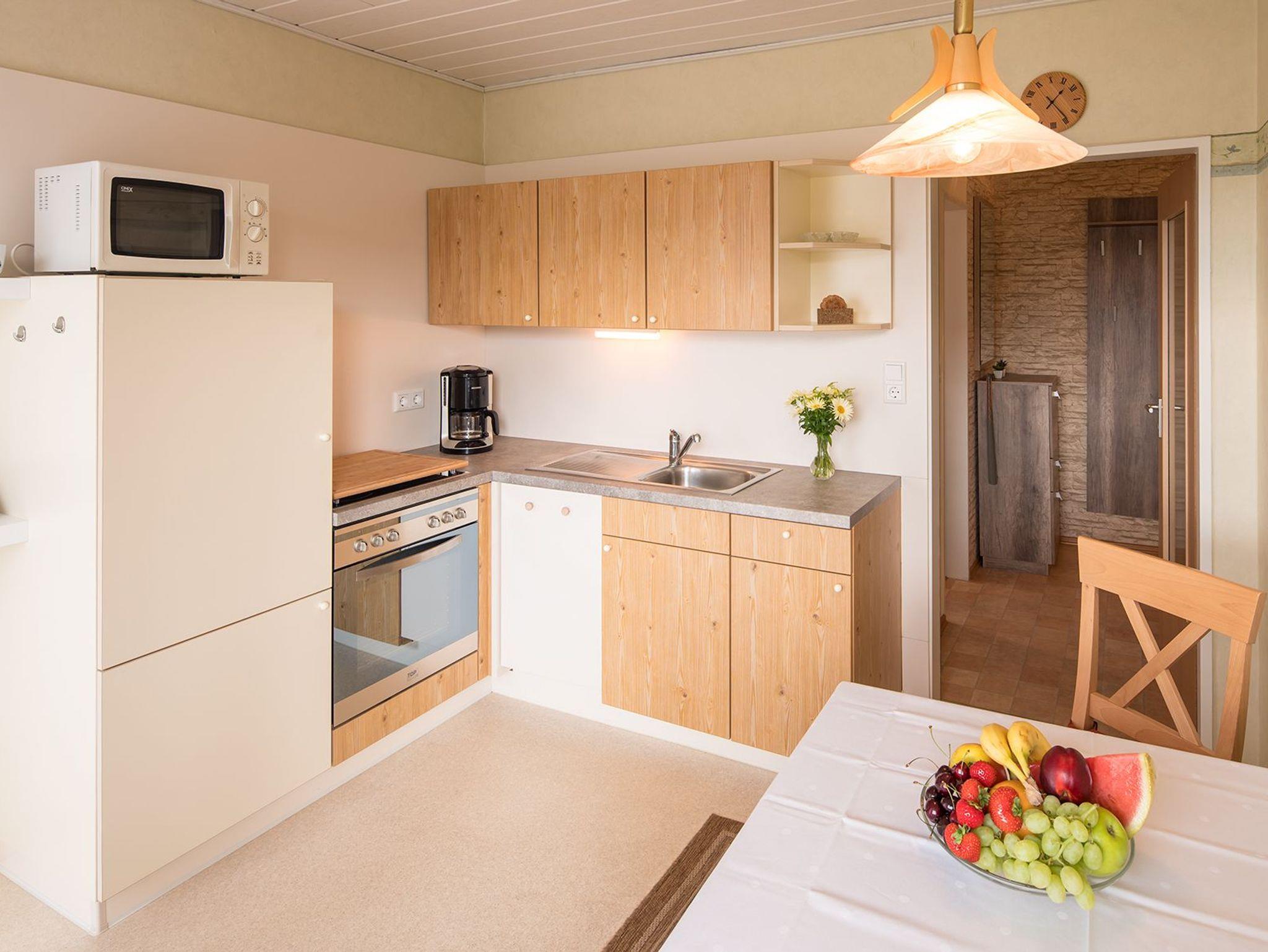 Die Ferienwohnungen Margerite und Tulpe bestehen aus einem Wohn-/Schlafraum und einer komplett eingerichteten Küche mit Sitzecke. In der Küche befindet sich eine Spülmaschine, Mikrowelle, ***Kühl-/Gefrierkombination und ein Herd mit Backofen.