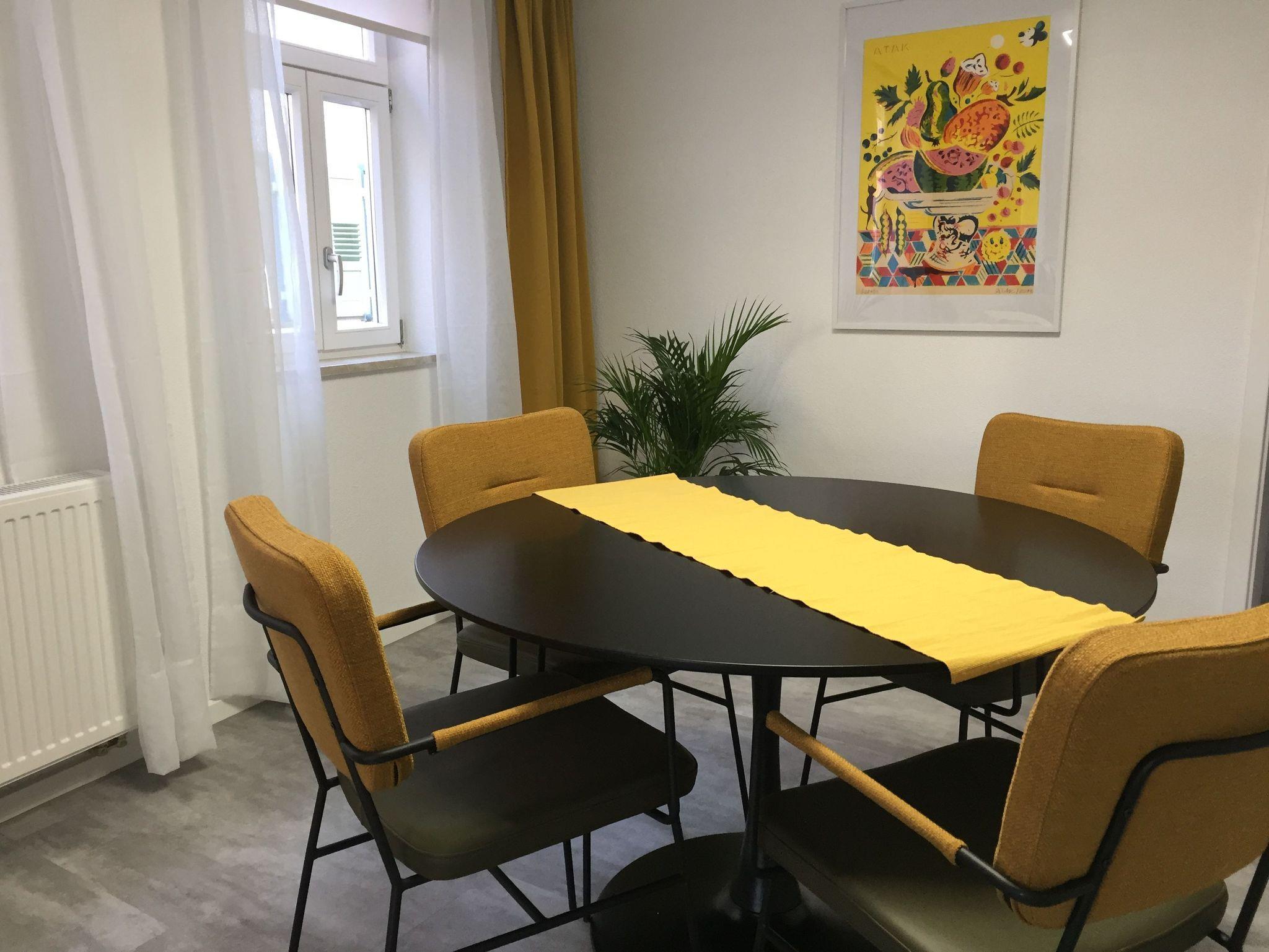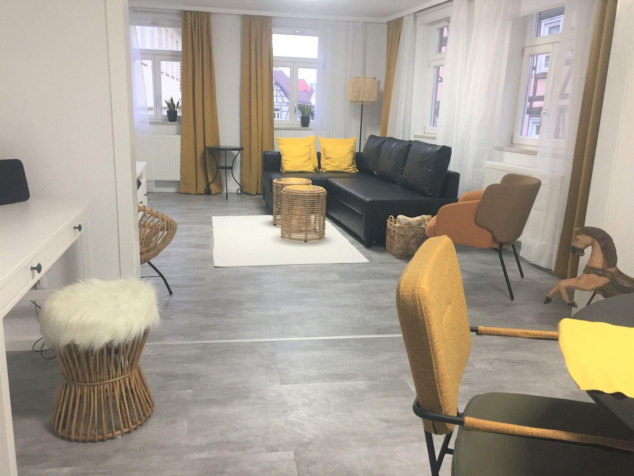 Große Ferienwohnung in einem historischen Denkmalhaus! Diese neu angebotene Ferienwohnung (78 qm) befindet sich in der ersten Etage des historischen Denkmals, Hauptstraße 60 in der Fußgängerzone. Im hellen, großzügigen Wohn-Esszimmer gibt es eine Eckcouch mit Schlaffunktion, Sessel und Ablagetische sowie einen Magenta-TV mit allem Fernsehkomfort, eine Stereoanlage mit BlueRay, der Essbereich weist einen großen Esstisch mit vier Design Sitzmöbeln auf. Hier befindet sich auch der Schreibtisch mit Hocker.