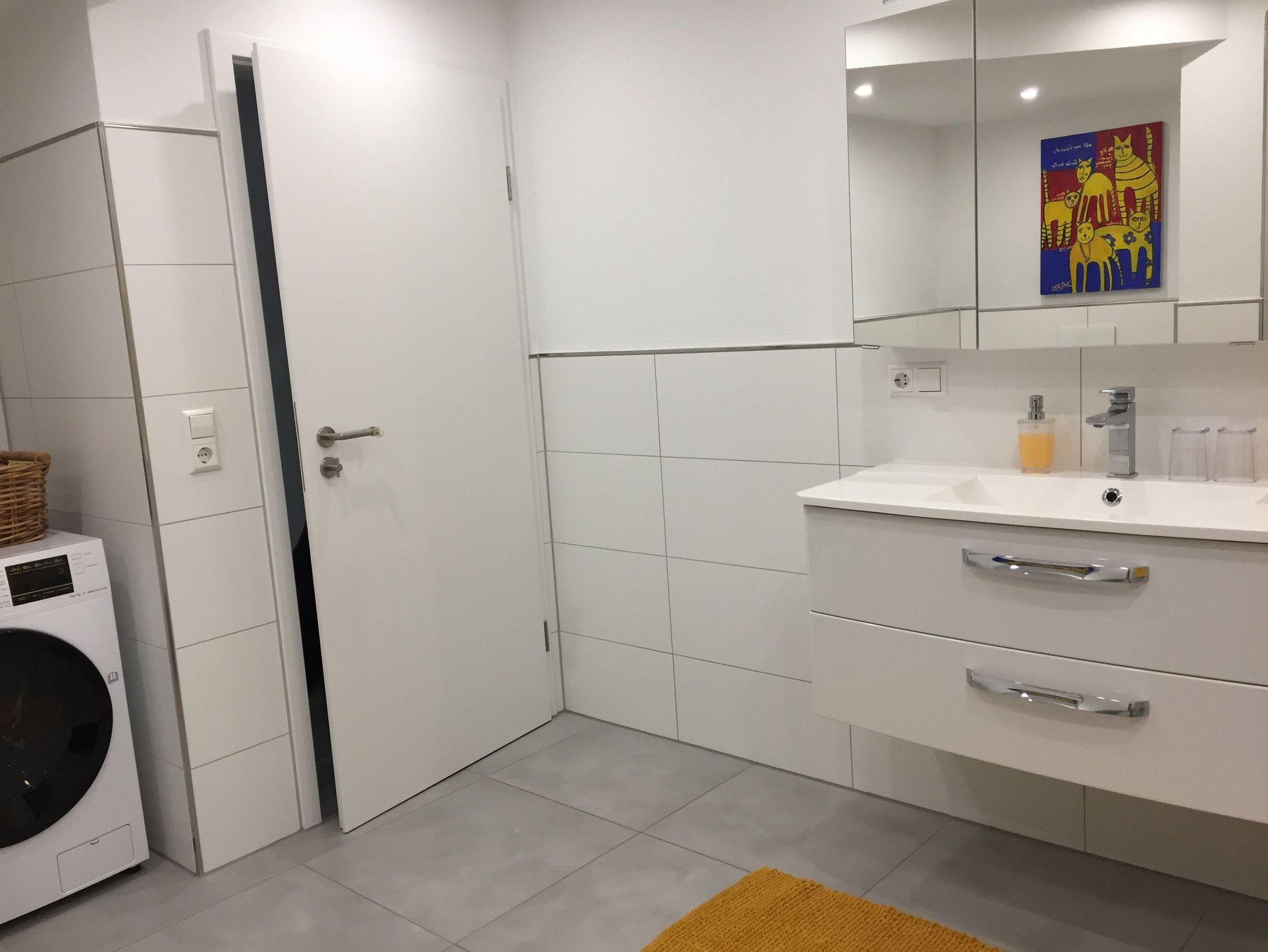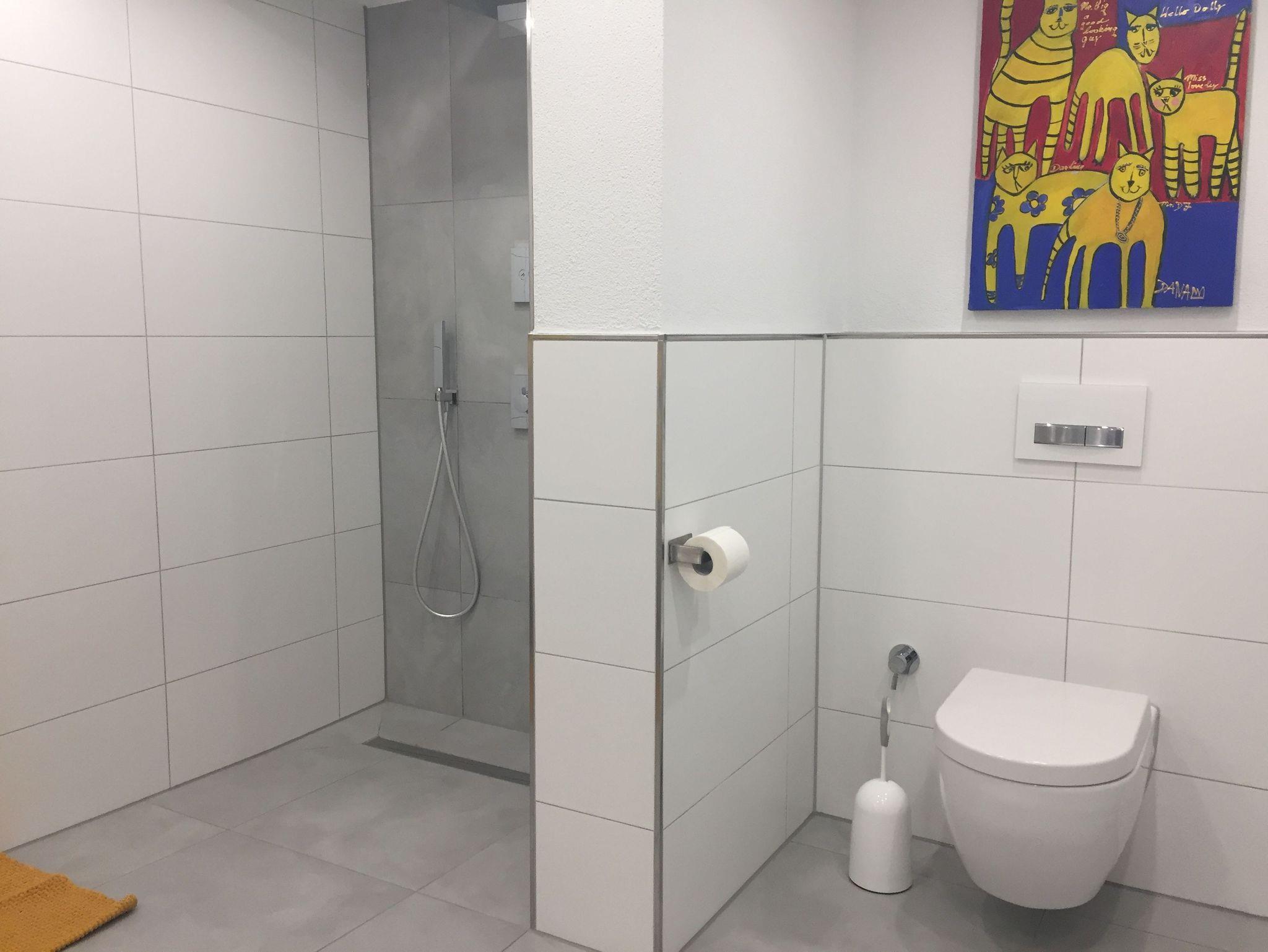 Das große moderne Badezimmer verfügt über eine begehbare Regendusche, ein großes Waschbecken mit Waschbecken, Toilette. Im Bad findet man auch den Waschtrockner (waschen und trocknen in einem Gerät).