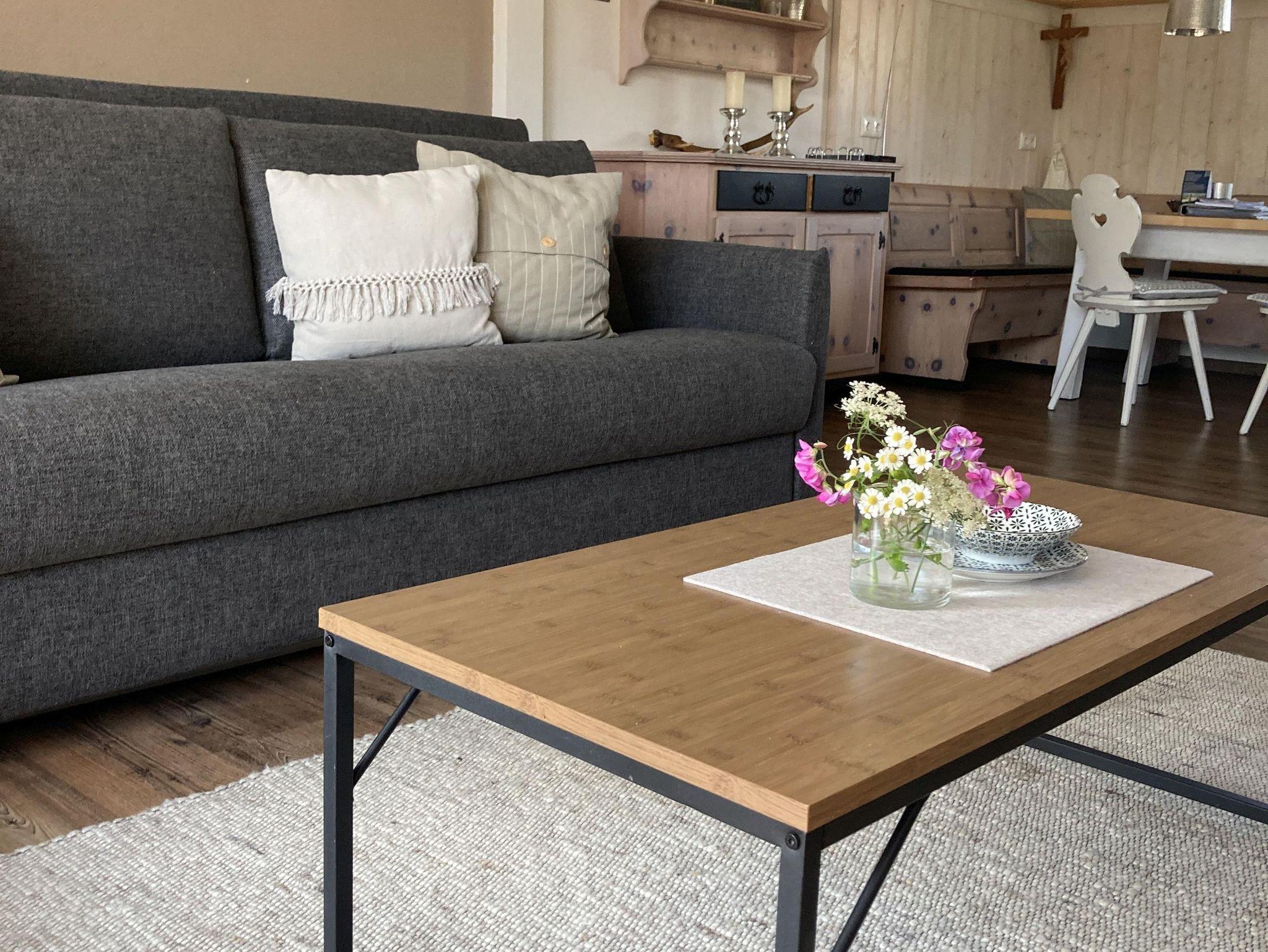• Wohnzimmer mit neuem Schlaf-Sofa, dieses ist mit einer integrierten Matratze 1,80 x 2 m ausgestattet und mit ein paar leichten Handgriffen in ein gemütliches Bett zu verwandeln.