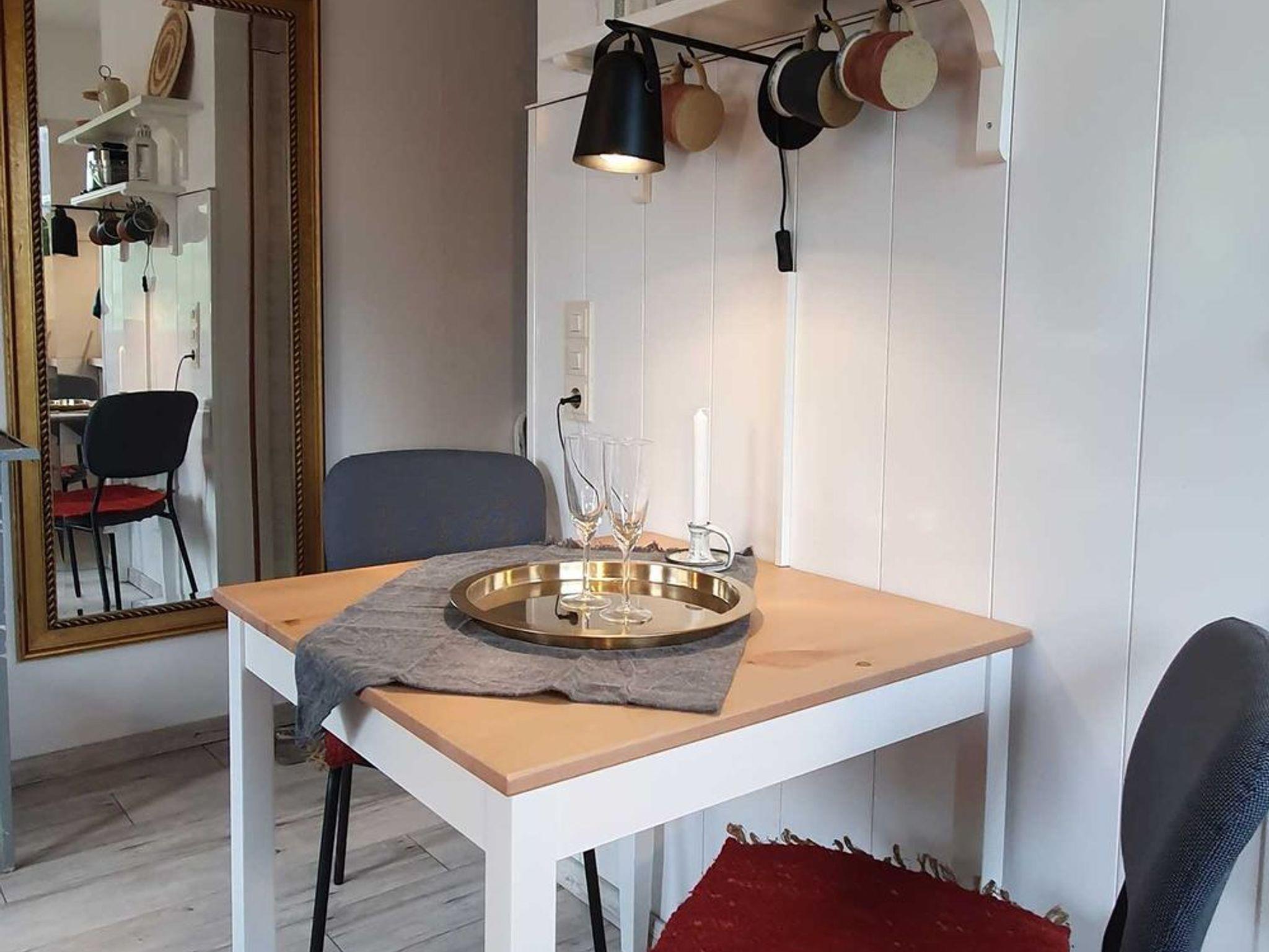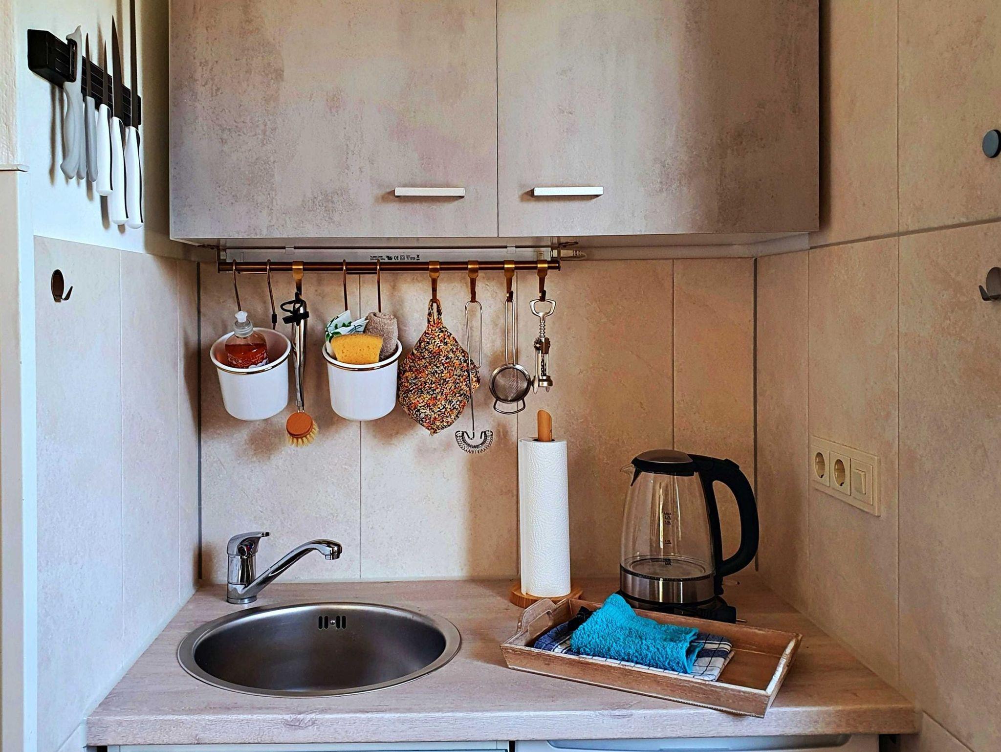 Voll eingerichtete Miniküche mit Kühlschrank (inkl. Eisfach), 2-flammiger E-Herd, Mikrowelle, Toaster, Wasserkocher, Kaffeemaschine und Geschirr aus unserer Töpferei. Balkon Richtung Südwesten mit Sitzmöglichkeit und Sonnenschirm, Fest eingebaute Fliegenschutztür.