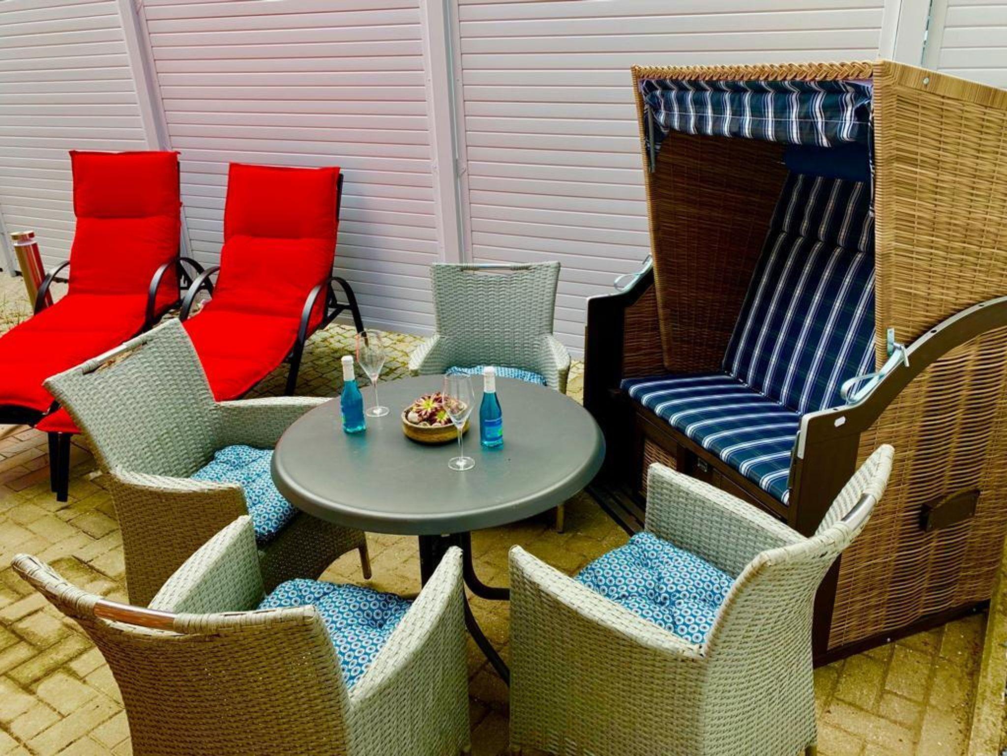Eine Terrasse, ausgestattet mit Liegestühlen, Strandkorb und Sitzecke, lädt zur Entspannung ein.