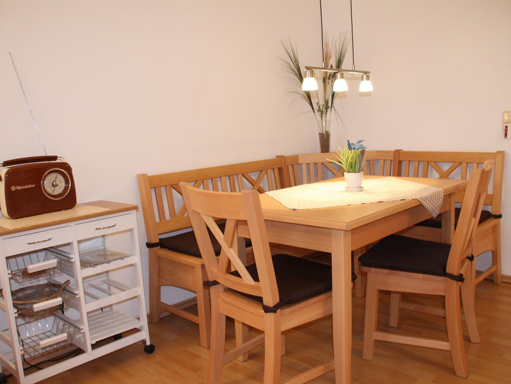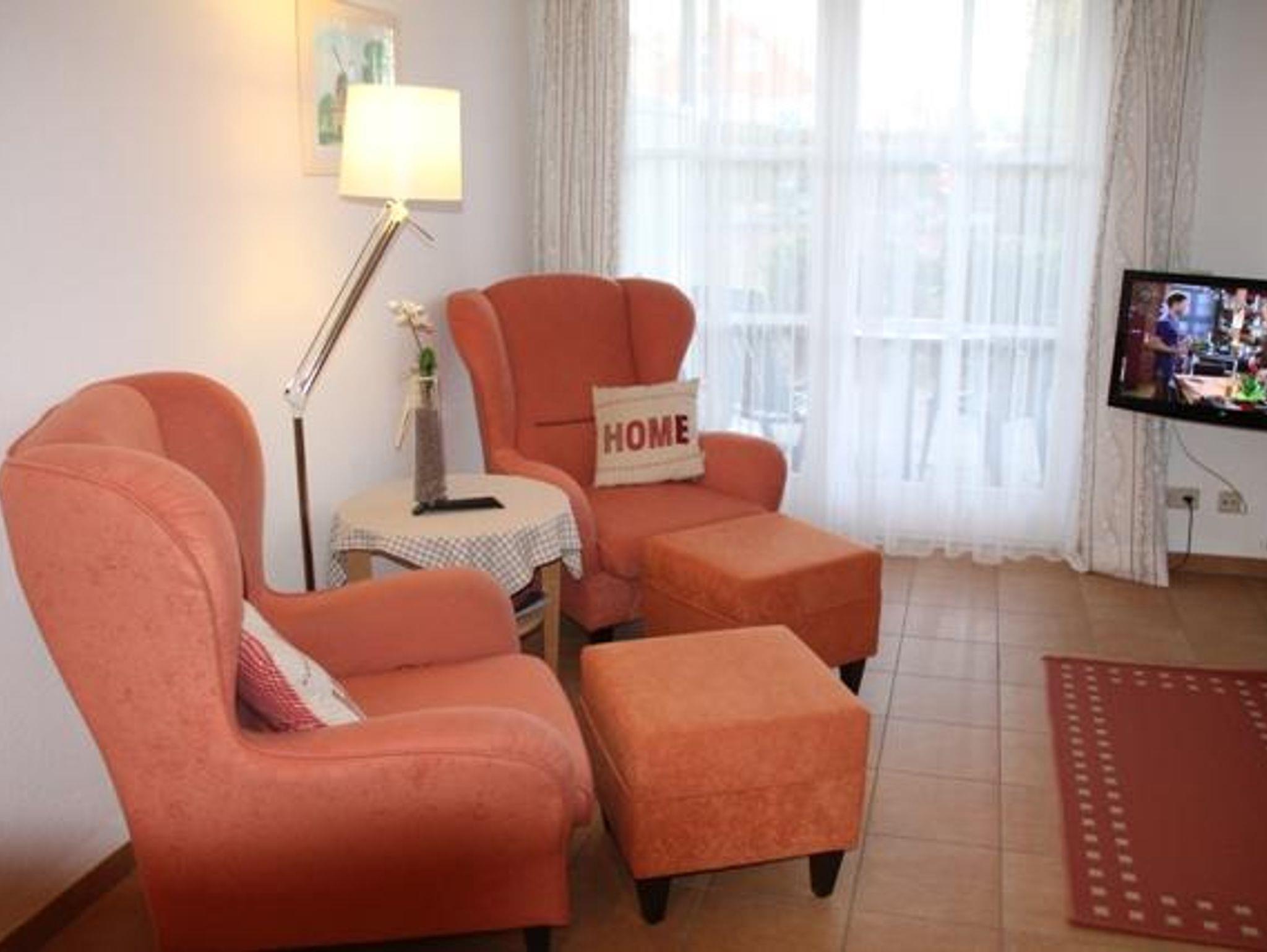Der Fernseher, 80 cm breit, ist schwenkbar an die Wand montiert und ermöglicht Ihnen, sowohl von den bequemen Sesseln mit Fußhockern, als auch von der Essecke oder dem Bett Ihre Lieblingssendung zu schauen. Ein Radio versorgt Sie mit Musik und Nachrichten. Internetzugang über WLAN.