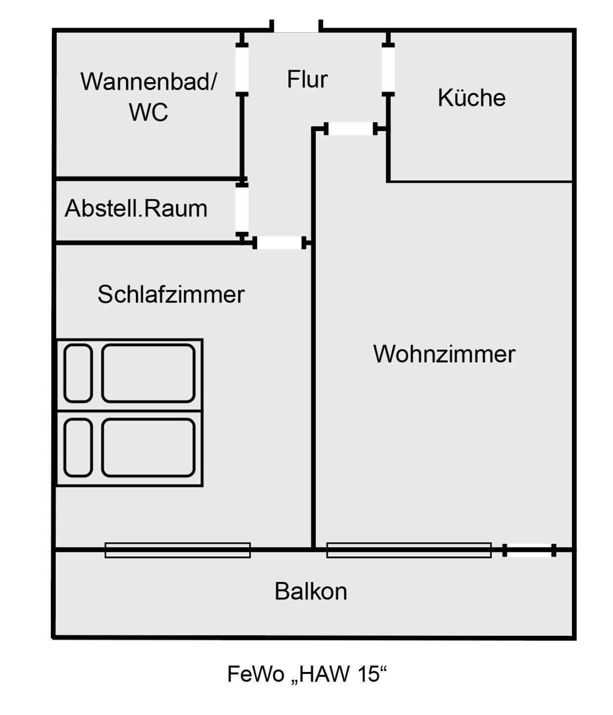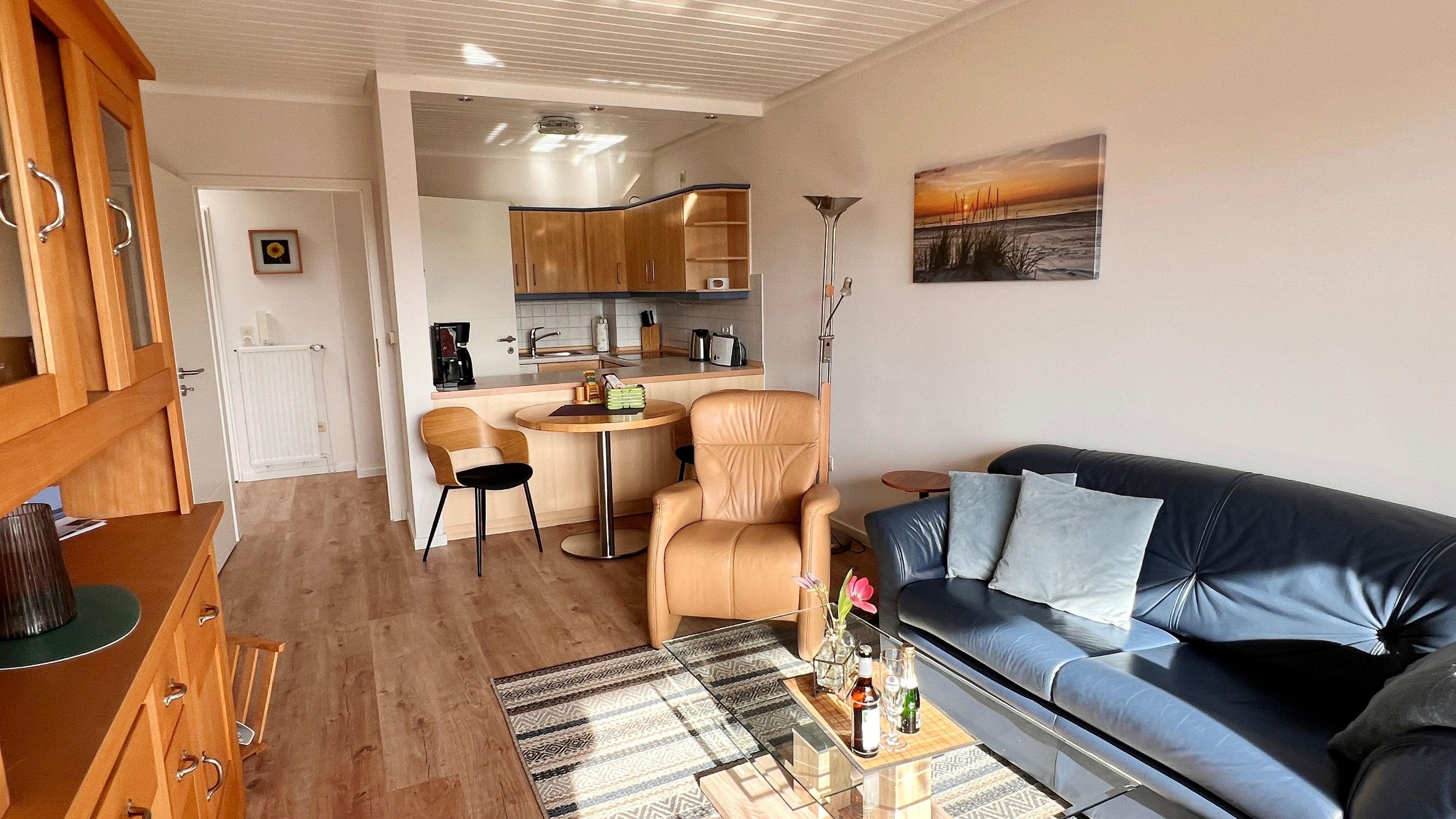 Auf einer Wohnfläche von 50qm stehen Ihnen ein Wohzimmer mit Essecke, eine zum Wohnraum offene Küche, ein separates Schlafzimmer mit bequemen Doppelbetten sowie ein Wannenbad/WC zur Verfügung.