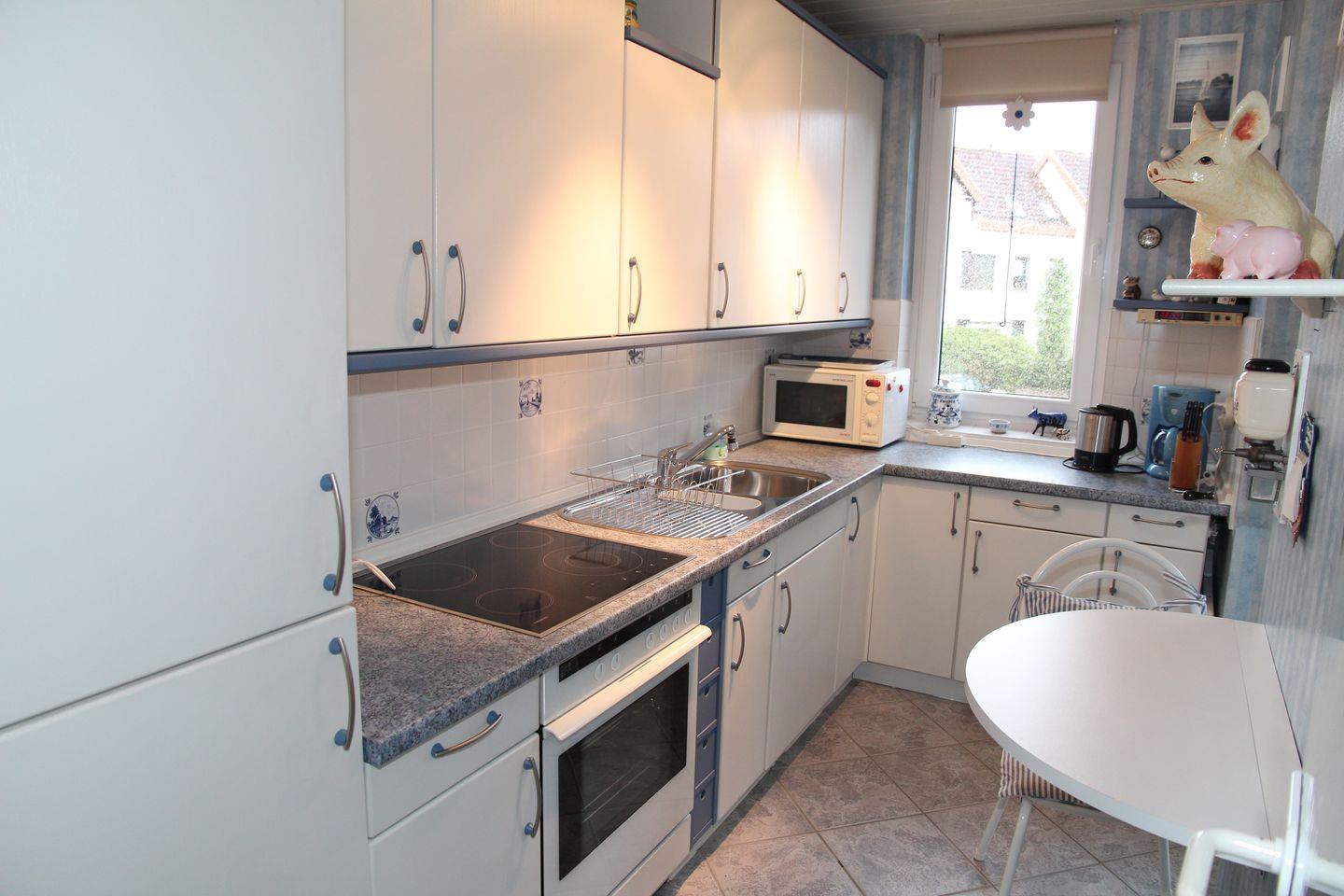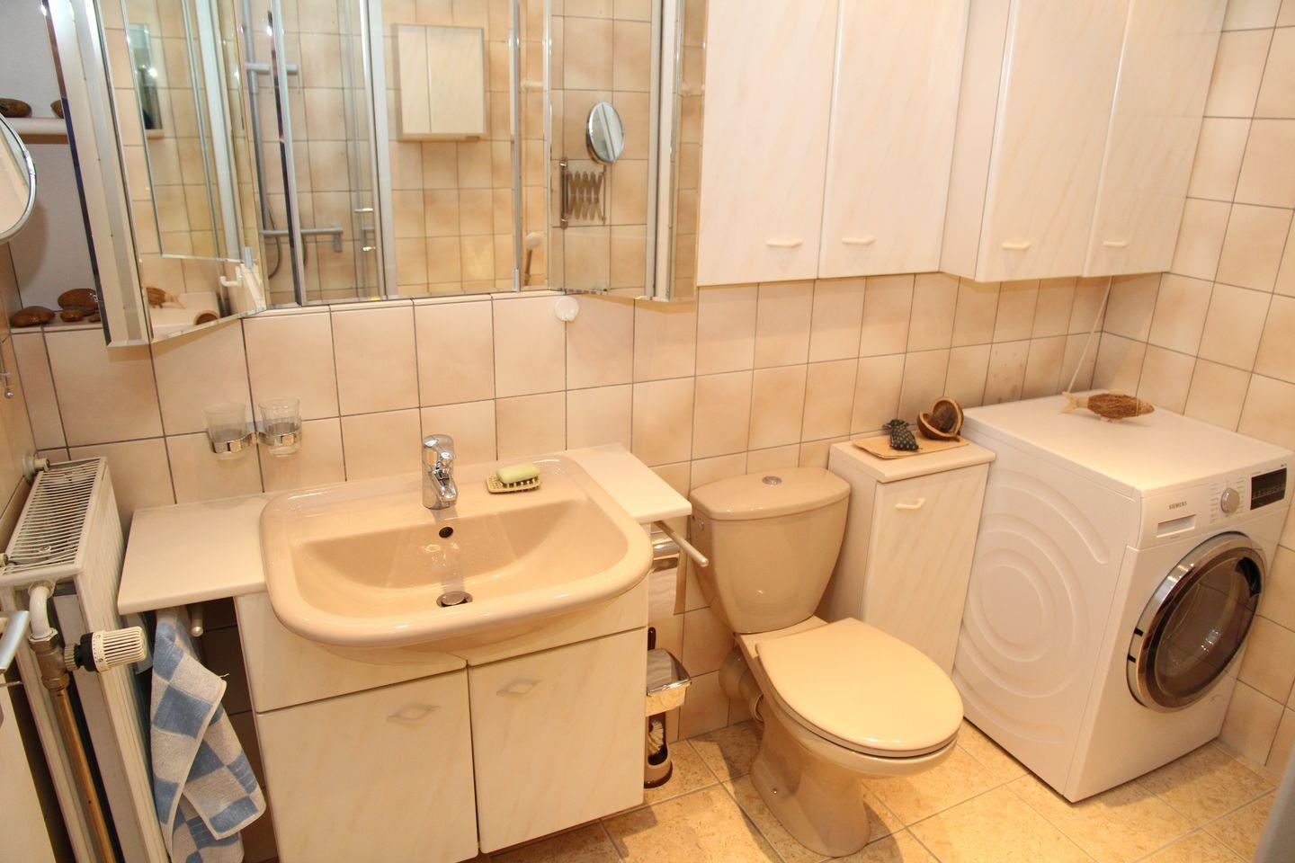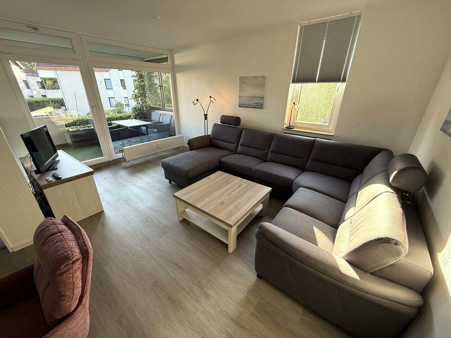 Die Wohnung befindet sich in einem Mehrfamilienhaus im 1. OG in ruhiger Lage. Hier finden Sie ein Schlafzimmer mit Doppelbett (2 Matratzen mit je 0,90x2m) und Kleiderschrank, Flur, 2. Schlafzimmer mit 2 Einzelbetten und Kommode, Badezimmer mit Dusche, Badewanne, Waschtrockner und das großzügige lichtdurchflutete Wohn- und Esszimmer mit gemütlichem U-Sofa, Fernseher und Esstisch für 6 Personen. Angrenzend ist die separate Küche mit Kühl- und Gefrierschrank, Ceranfeld mit Backofen, Mikrowelle, Geschirrspülmaschine, Wasserkocher, Toaster, Kaffeemaschine, Mixer uvm.