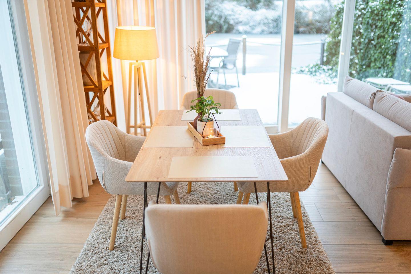 Du kannst deinen Tag mit leckerem Kaffee beginnen und all die schönen Annehmlichkeiten dieses Apartments genießen, inklusive der großen Terrasse mit exklusivem Seeblick, großzügigem Sitzbereichen für 4 Personen, einem Grill und einer Sauna auf der Anlage sowie einer tollen Aussicht in die Natur.