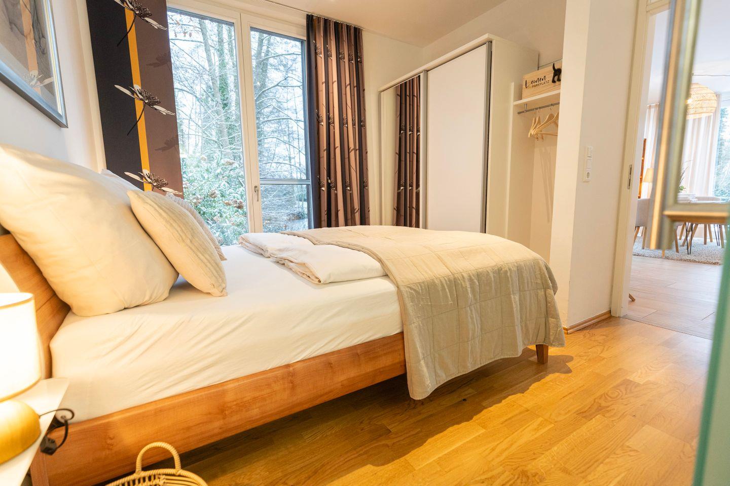 Das Schlafzimmer verfügt über ein gemütliches 1,80m Doppelbett. Im Wohnzimmer findest Du nicht nur hochwertige Schlafcouch, die sich perfekt für Familienbesuche eignet, sondern ebenso einen großen Essbereich für 4 Personen sowie einen gemütlichen Sitzbereich mit Sofa und einem TV. Hier ist sowohl Raum für einen gemütlichen Fernsehabend, wie auch die Möglichkeit eines Spieleabends mit deinen Liebsten.