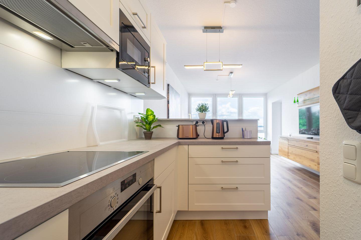Diese großzügige 2-Zimmer-Wohnung hat alles, was Du für einen unvergesslichen Aufenthalt benötigst. Komm herein und lass Dich von der offenen und modernen Küche im Wohn- und Esszimmer begeistern. Der Blick auf den See vom Esstisch aus schafft eine einladende Atmosphäre, während das gemütliche Sofa zum Entspannen einlädt.