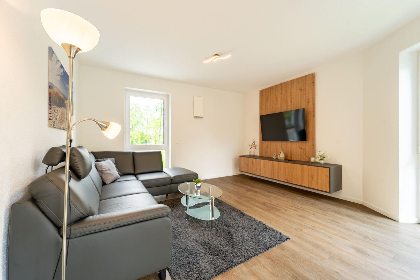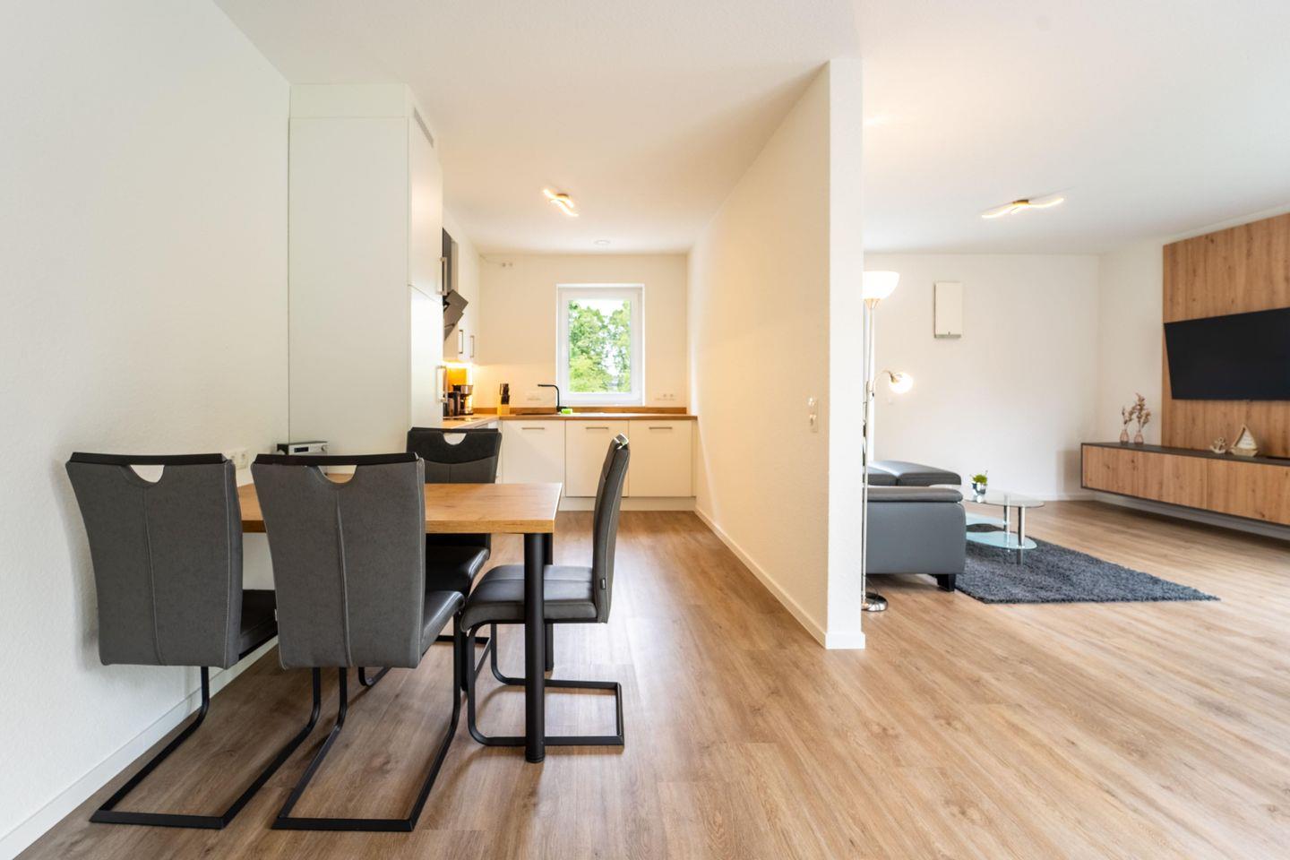 Die Ferienwohnung „Weißer Weg“ bietet auf 81 qm modernen Komfort und viel Platz für bis zu vier Personen. Der offene Wohnbereich mit großer Fensterfront und Zugang zum Balkon ist hell und freundlich gestaltet. Hier befinden sich eine gut ausgestattete Küche mit Ofen, Geschirrspüler, Herd, Kühlschrank und Gefrierschrank, ein Essbereich und ein gemütliches Wohnzimmer mit großem Smart TV. Die Wohnung verfügt über zwei Schlafzimmer – eines mit einem komfortablen Doppelbett und das andere mit zwei Einzelbetten – sowie ein modernes Badezimmer mit bodengleicher Dusche.
