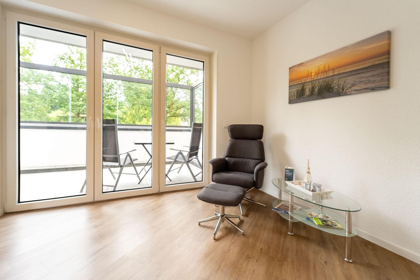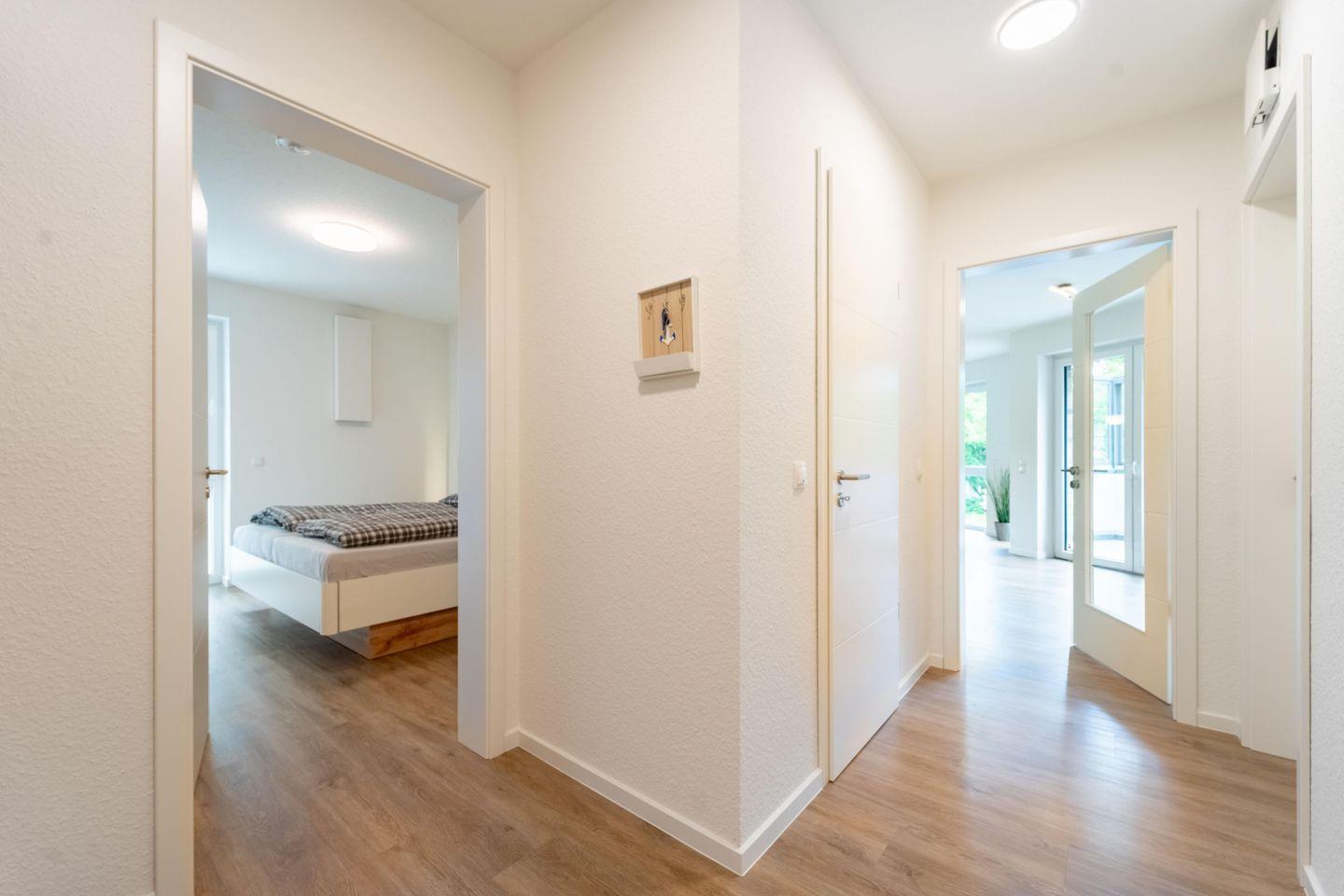 Die Ferienwohnung „Weißer Weg“ bietet auf 81 qm modernen Komfort für bis zu vier Personen. Der offene Wohnbereich mit Balkonzugang, große Fensterfront, gut ausgestatteter Küche, Essbereich und Wohnzimmer mit Smart TV ist hell und freundlich. Zwei Schlafzimmer und ein modernes Badezimmer mit bodengleicher Dusche runden das Angebot ab. Highlights sind der windgeschützte Balkon, ein Kabuff für Fahrräder und kostenfreie SUP-Boards.