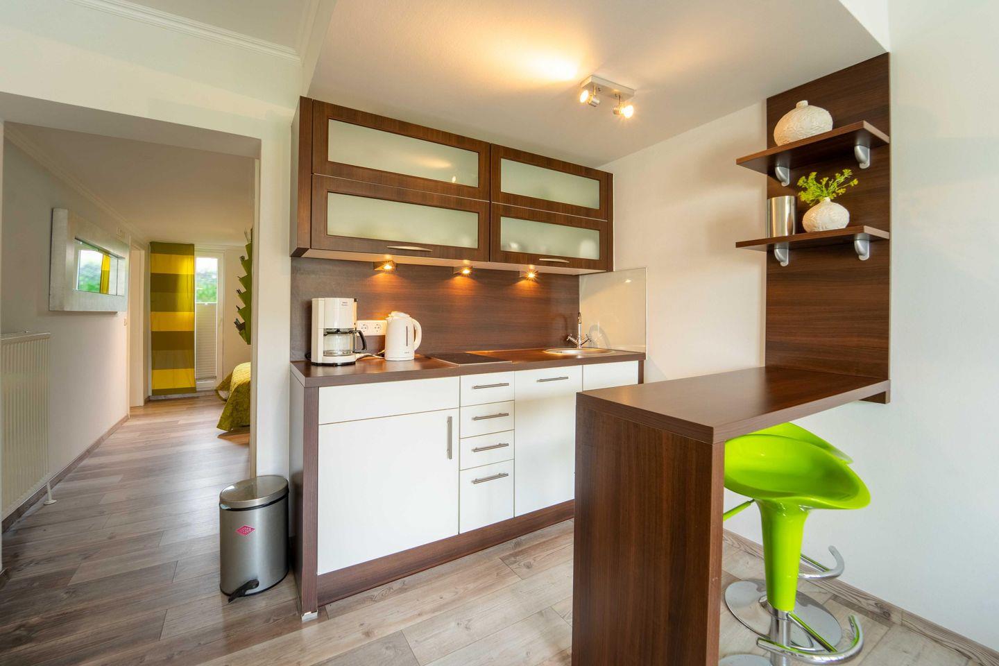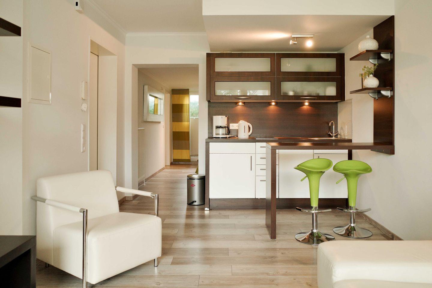 Erlebe den Komfort und die Gemütlichkeit unseres Appartements 1 Engel & Co. Ferienwohnungen in Bad Zwischenahn. Die moderne und offene Gestaltung dieser 50 qm großen, behinderten- und rollstuhlgerechten Unterkunft sorgt für ein Wohlfühlambiente. Die Wohnung liegt im Erdgeschoss und ist weitestgehend ebenerdig, jedoch befindet sich am Eingang eine Stufe. Genieße Deine Zeit auf der privaten Terrasse mit bequemen Sitzmöglichkeiten und erkunde die wunderschöne Umgebung, die zu Wanderungen und Radtouren einlädt.