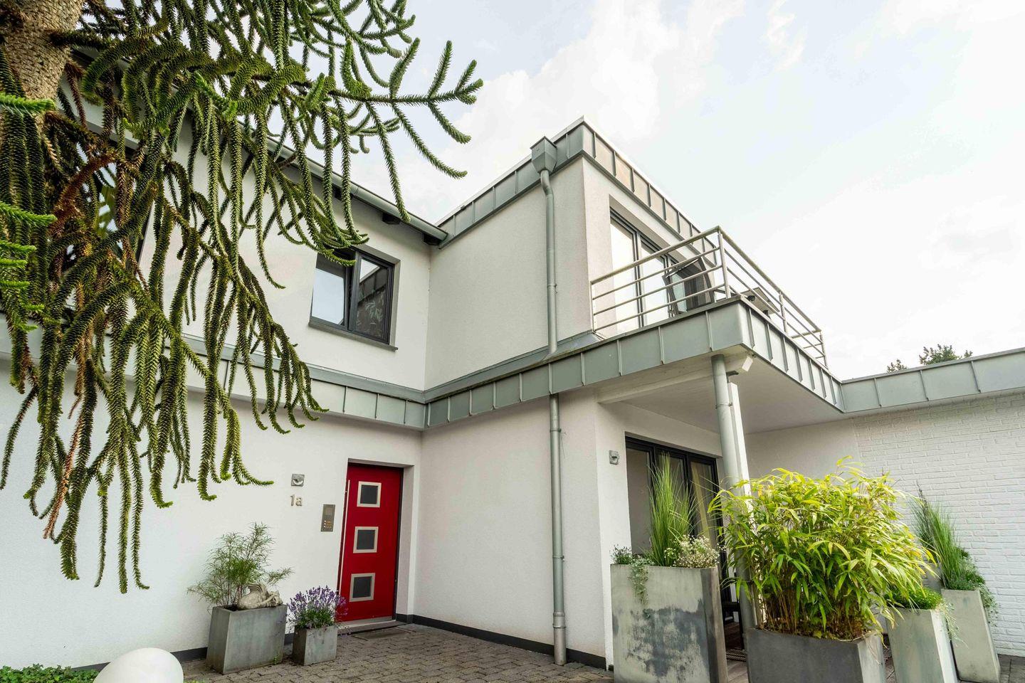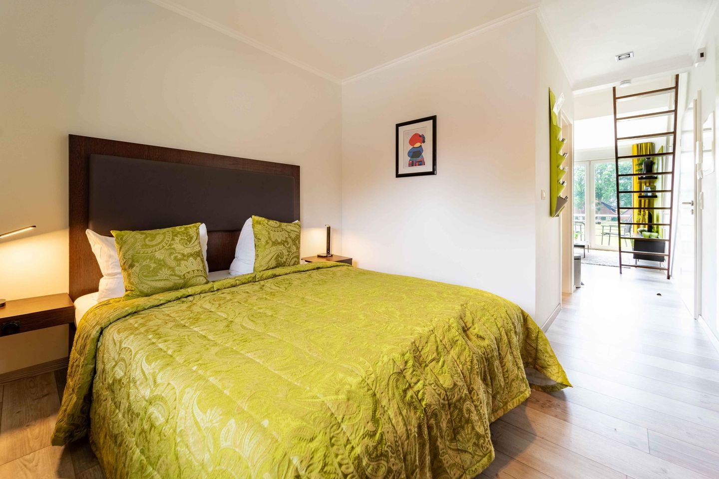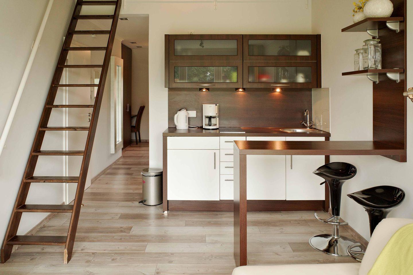 Moderne 58 qm große Ferienwohnung im ersten Obergeschoss. Ein Schlafzimmer, offener Wohnbereich mit Empore und weiterem Bett. Voll ausgestatteter Küche, modernes Badezimmer und privater Balkon. WLAN, TV und Parkplatz direkt vor der Tür inklusive. Großer gemeinschaftlicher Garten, sichere Abstellmöglichkeit für Fahrräder. Ideal für ältere Gäste und Paare. Keine Partys oder Junggesellenabschiede erlaubt. Flexible Anreise per Schlüsselbox.