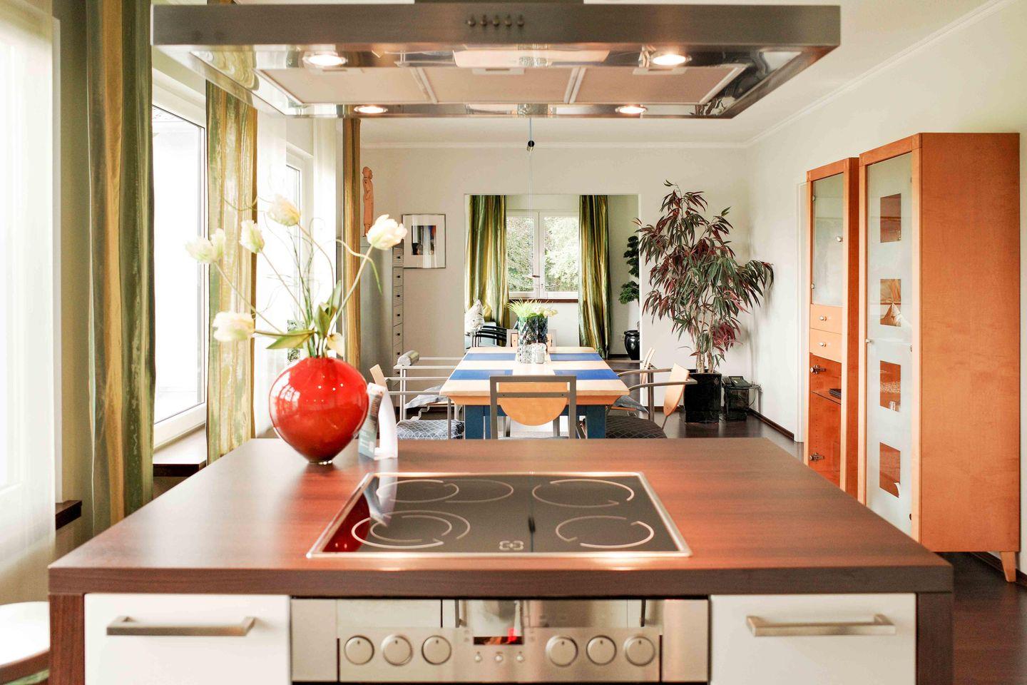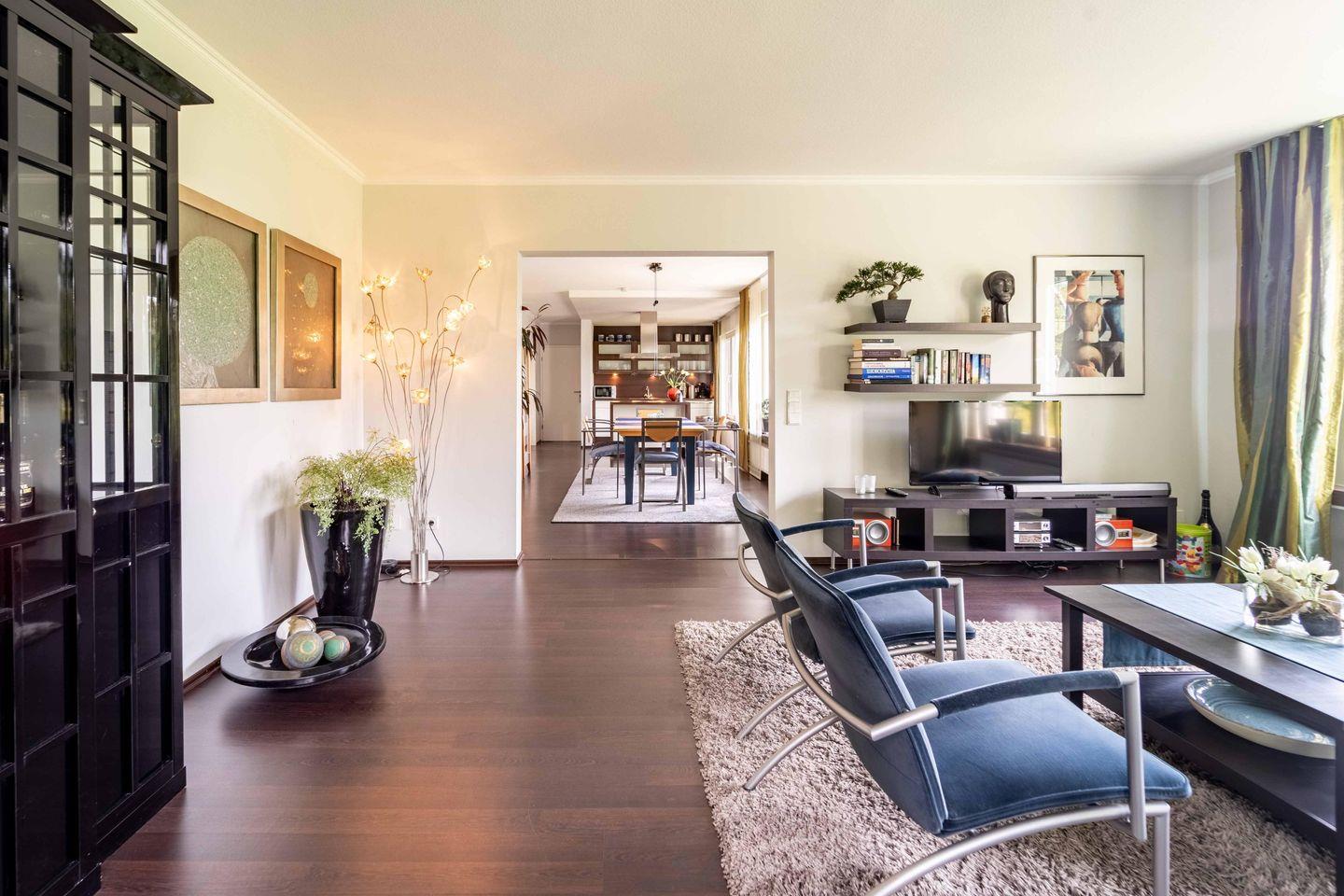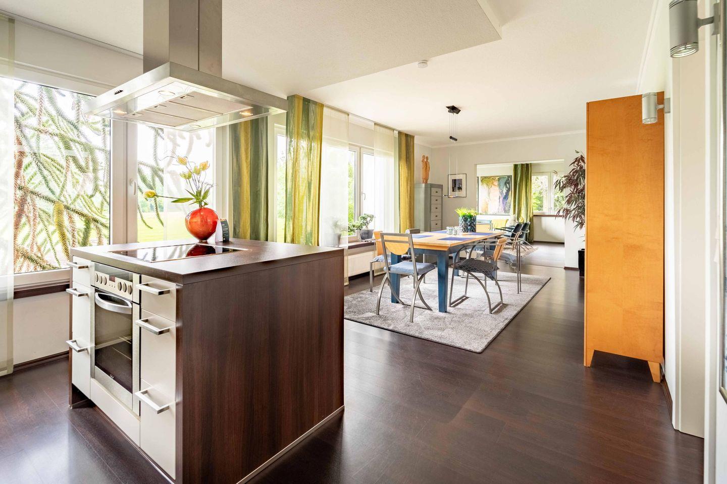 Die Suite bietet einen großzügigen Wohnbereich mit gemütlichen Sitzgelegenheiten für vier Personen. Die voll ausgestattete Küche mit Kochinsel, Geschirrspülmaschine, Kühlschrank, Mikrowelle, Töpfen, Schneidwerkzeugen, Porzellangeschirr, Kristallgläsern und hochwertigem Besteck lässt keine Wünsche offen. Der angrenzende Essbereich bietet Platz für sechs Personen und ist perfekt für gemeinsame Mahlzeiten.