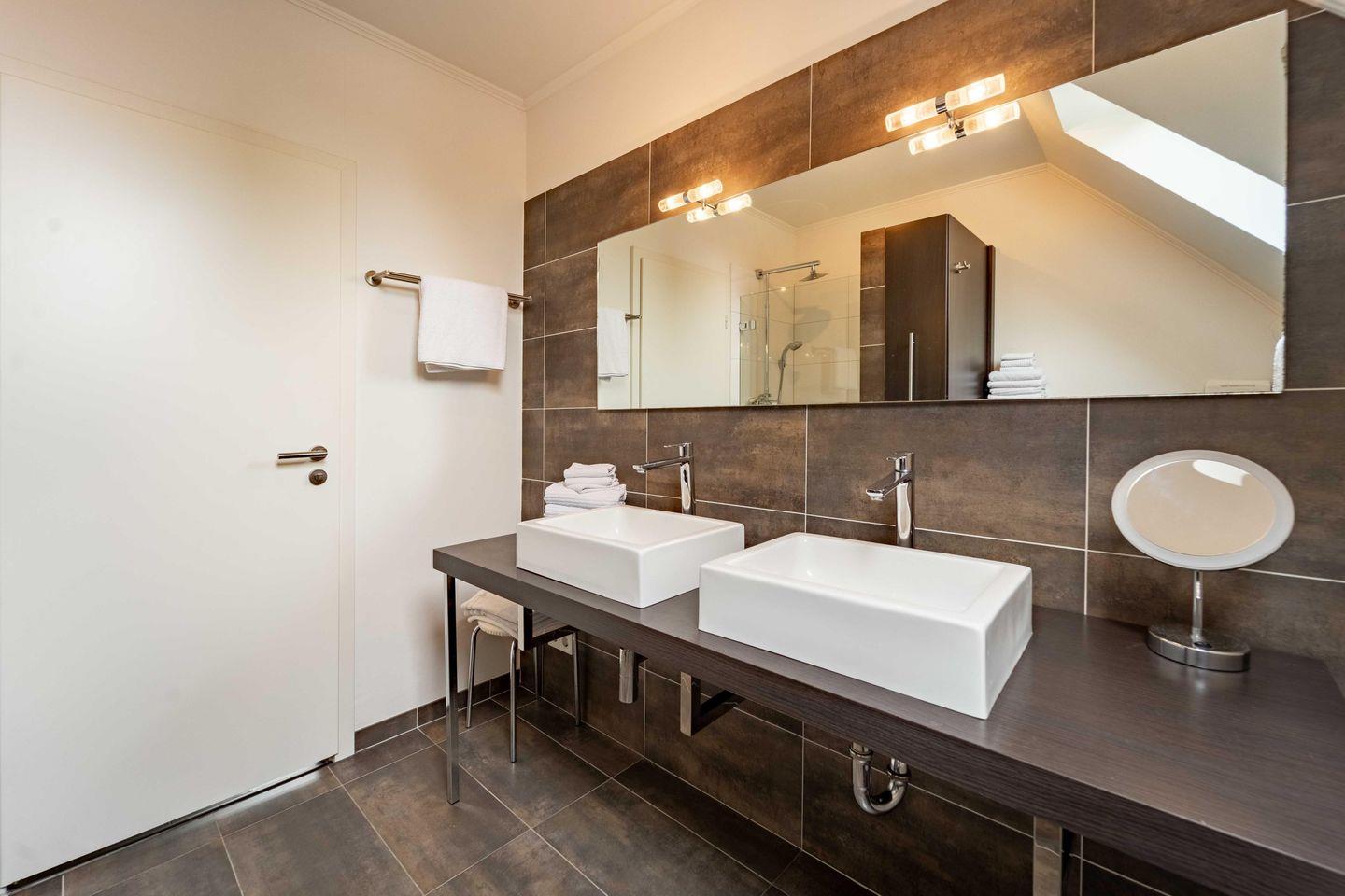 Unsere Grand Suite verfügt über zwei Schlafzimmer und bietet Schlafgelegenheiten für bis zu vier Personen. Das Superior-Schlafzimmer ist mit zwei Boxspringbetten (je 90 x 200 cm) und überlanger Mako-Damast-Allergiker-Bettwäsche ausgestattet. Ein zweites, separates Schlafzimmer bietet ein bequemes Futonbett (140 x 200 cm). Das komfortable Duschbad ist mit reichlich Badwäsche für zwei Personen ausgestattet und verfügt über eine Luxusdusche mit übergroßem Duschkopf, WC, Bidet, Waschbecken, Haarfön und Kosmetikspiegel.