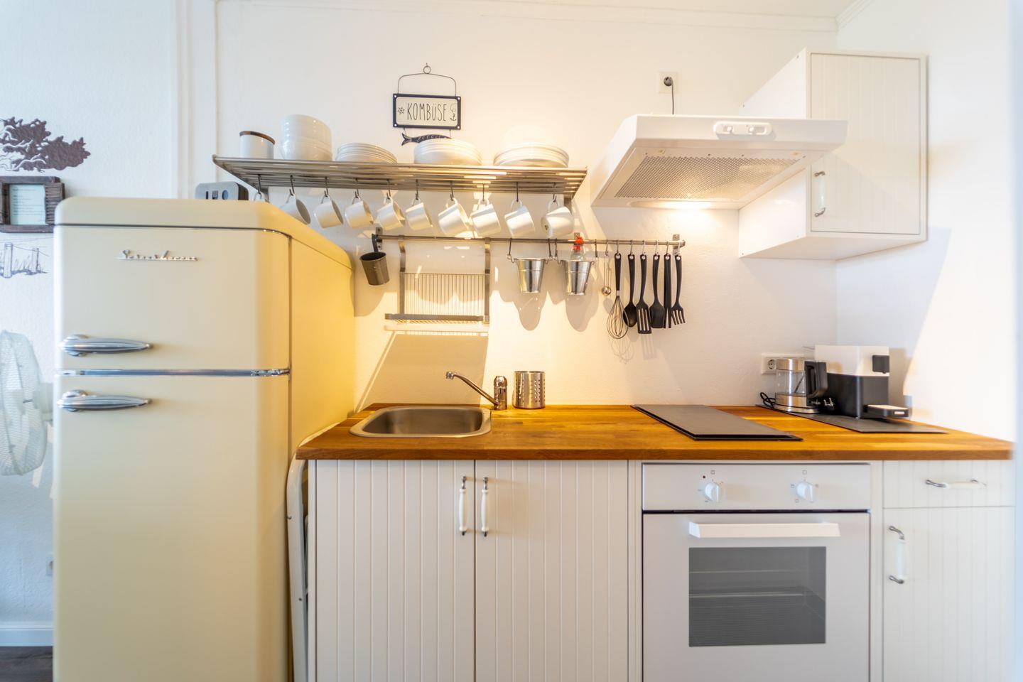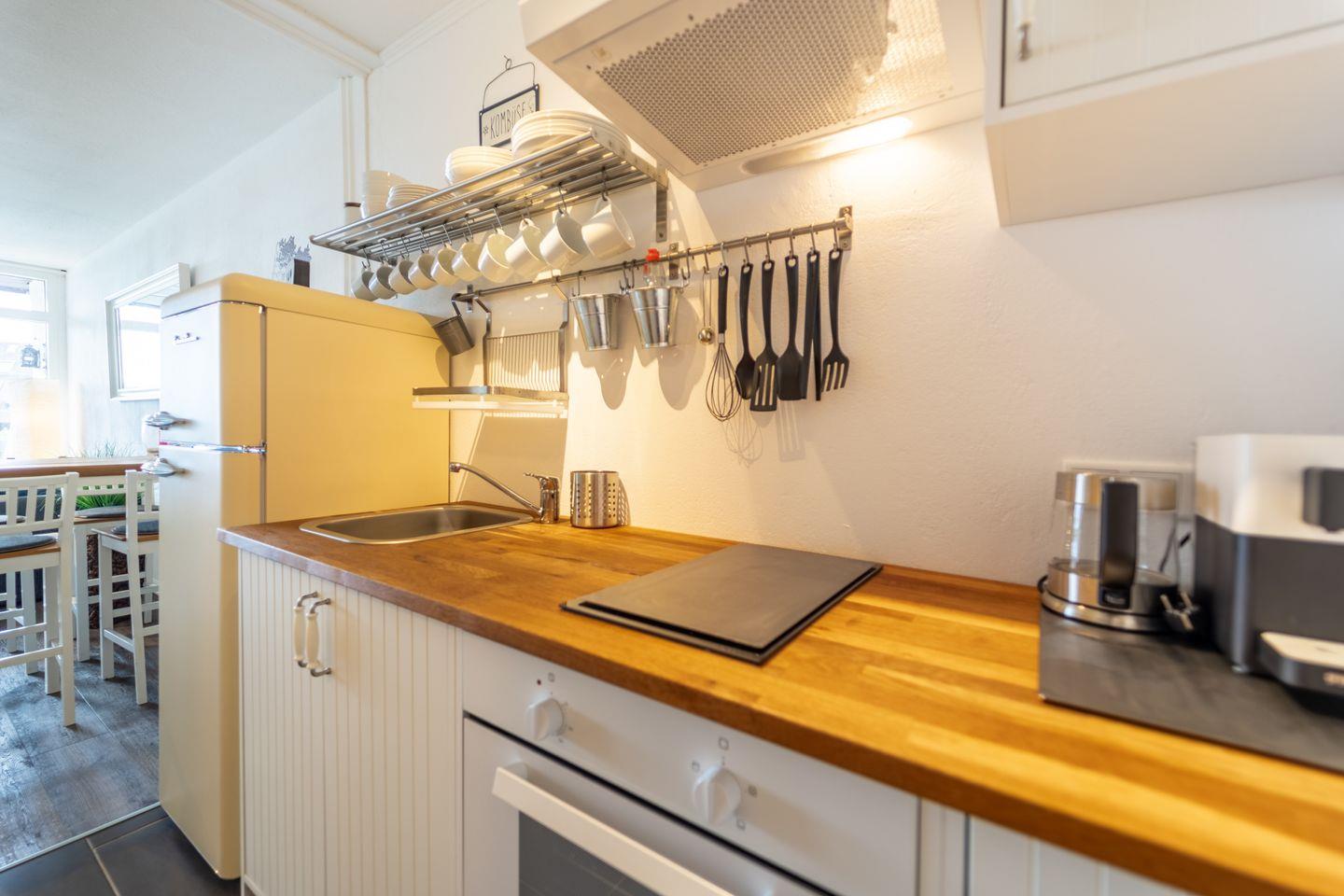 Die Küche ist gut ausgestattet mit Backofen, Herd, Kühlschrank, Kaffeemaschine, Wasserkocher, Toaster und allem, was du zum Kochen brauchst.