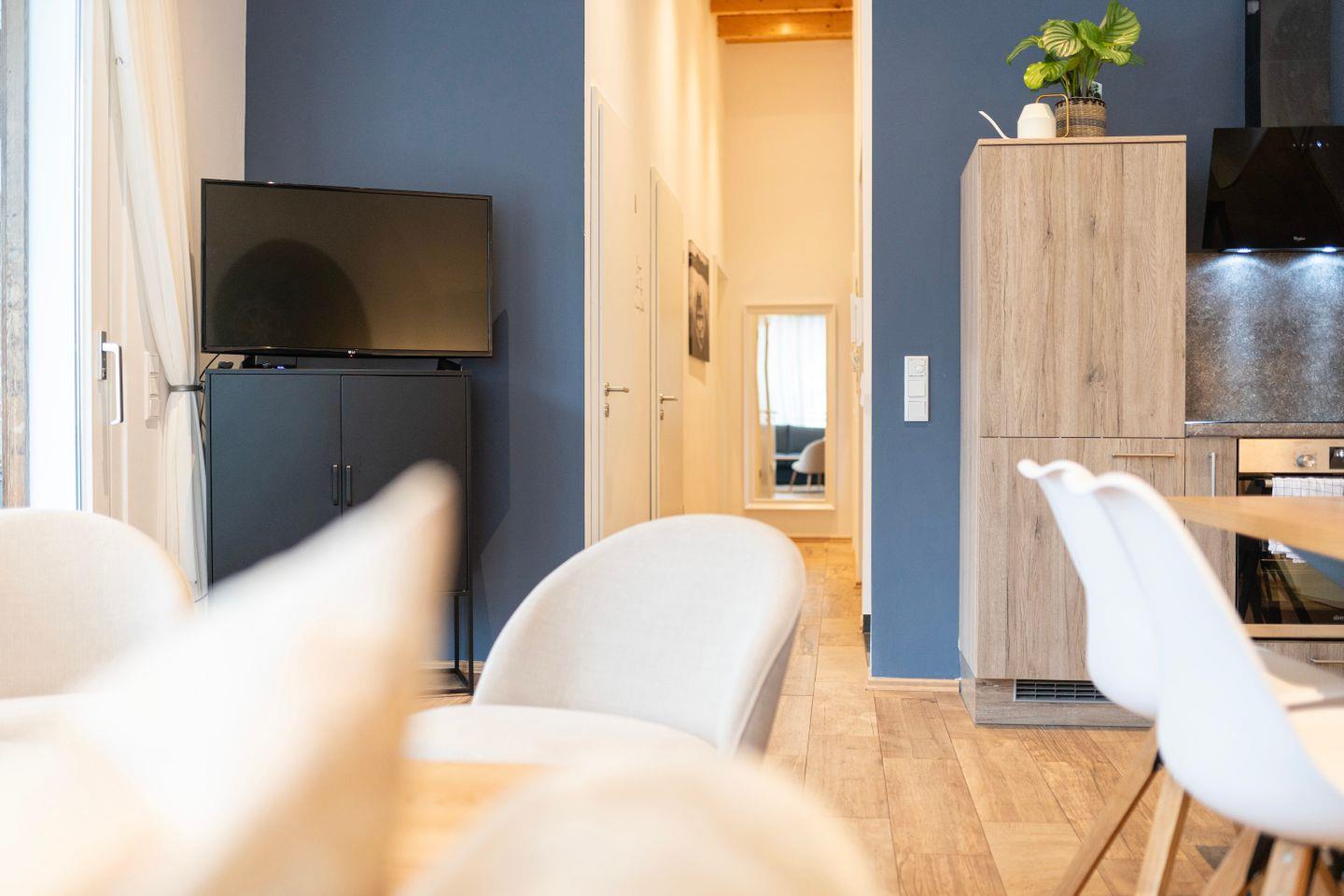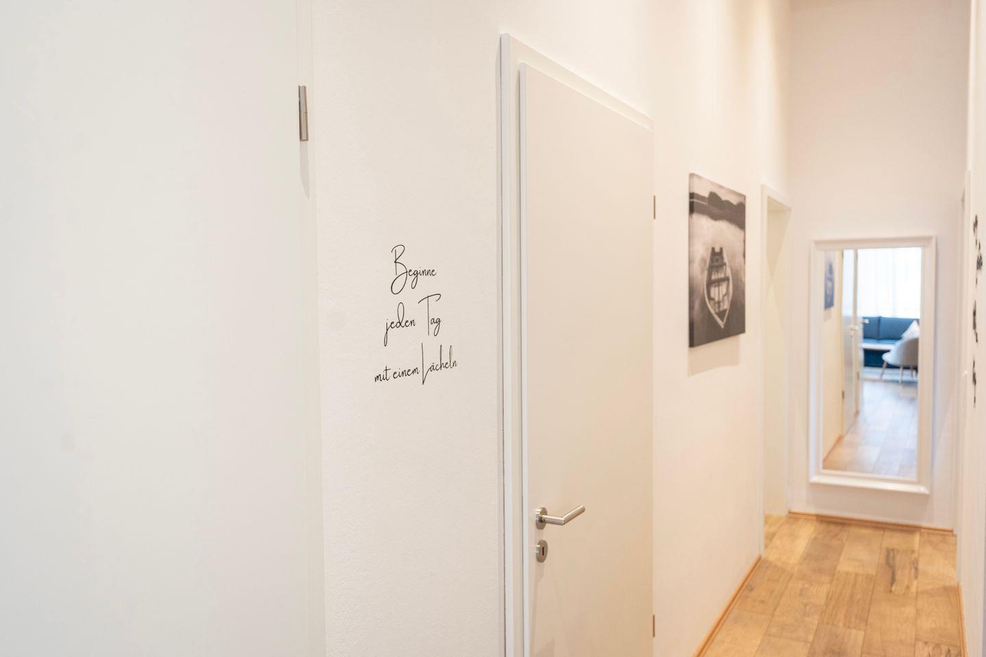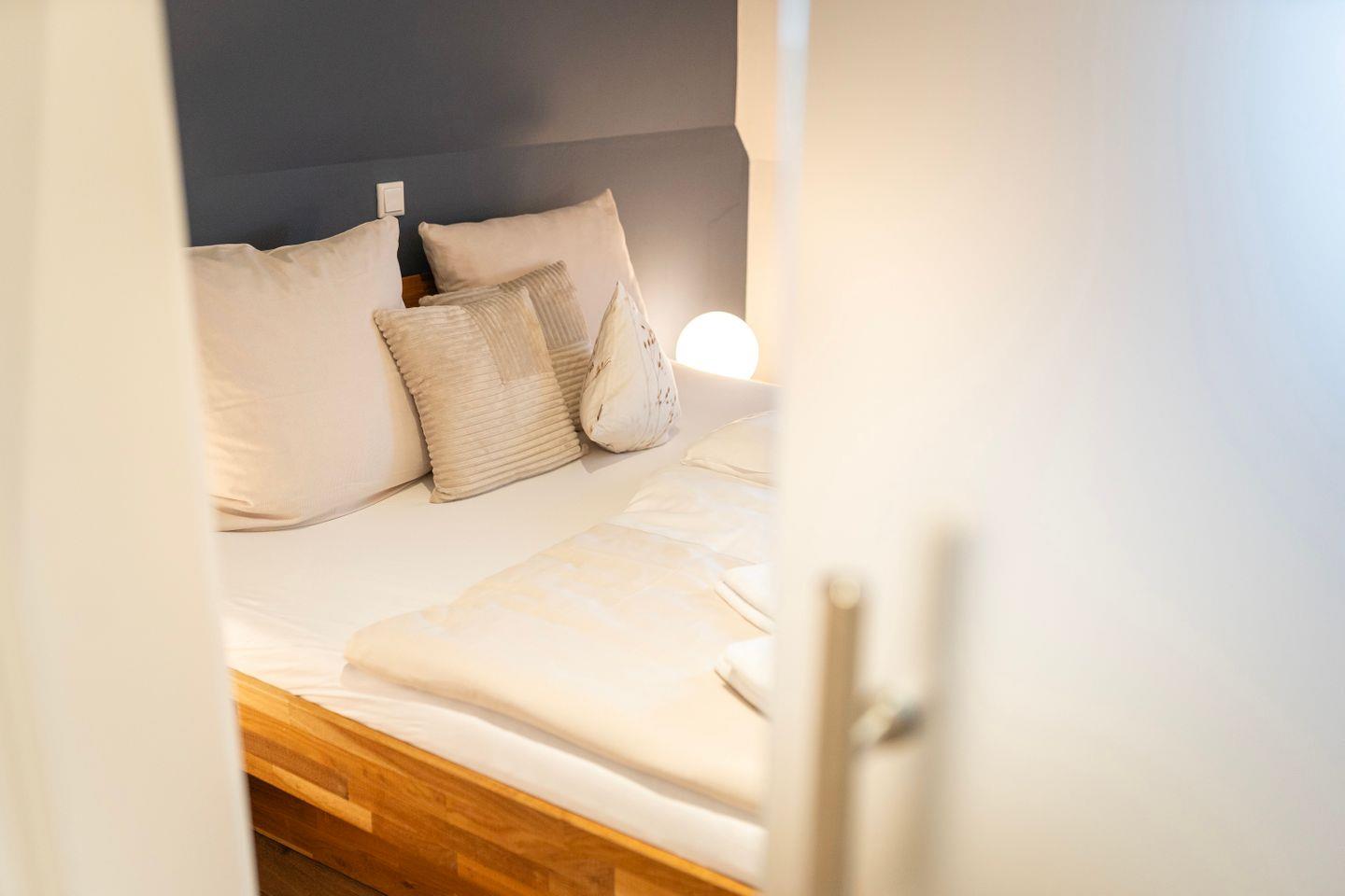 Das erste Schlafzimmer bietet ein gemütliches 1,80m Doppelbett. Im zweiten Schlafzimmer findest du ein bequemes queensize Bett. Im Wohnzimmer befindet sich ebenfalls noch eine Schlafcouch. Hier erlebst Du, ideal für Familienbesuche, einen großen und bequemen Sitzbereich mit Sofa und TV. Zusätzlich gibt es einen Arbeitsplatz mit Schreibtisch und schnellem Internet, perfekt für produktive Stunden oder als Homeoffice.