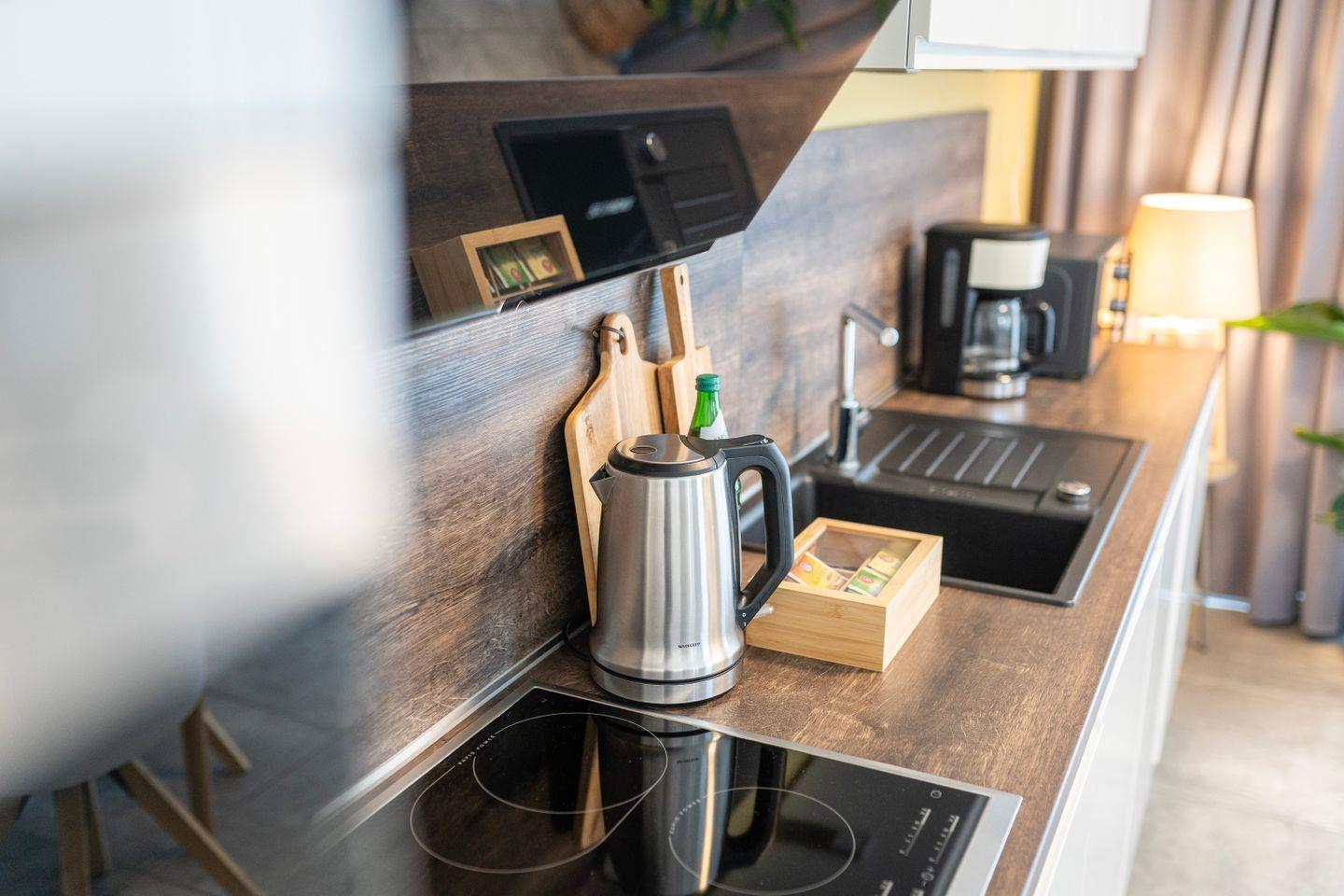 Die Küche ist natürlich voll ausgestattet mit Herd, Kühlschrank, Backofen, Spülmaschine, Mikrowelle und allem was Du sonst brauchst um lecker zu kochen. Das Apartment verfügt ebenso über eine Waschmaschine.