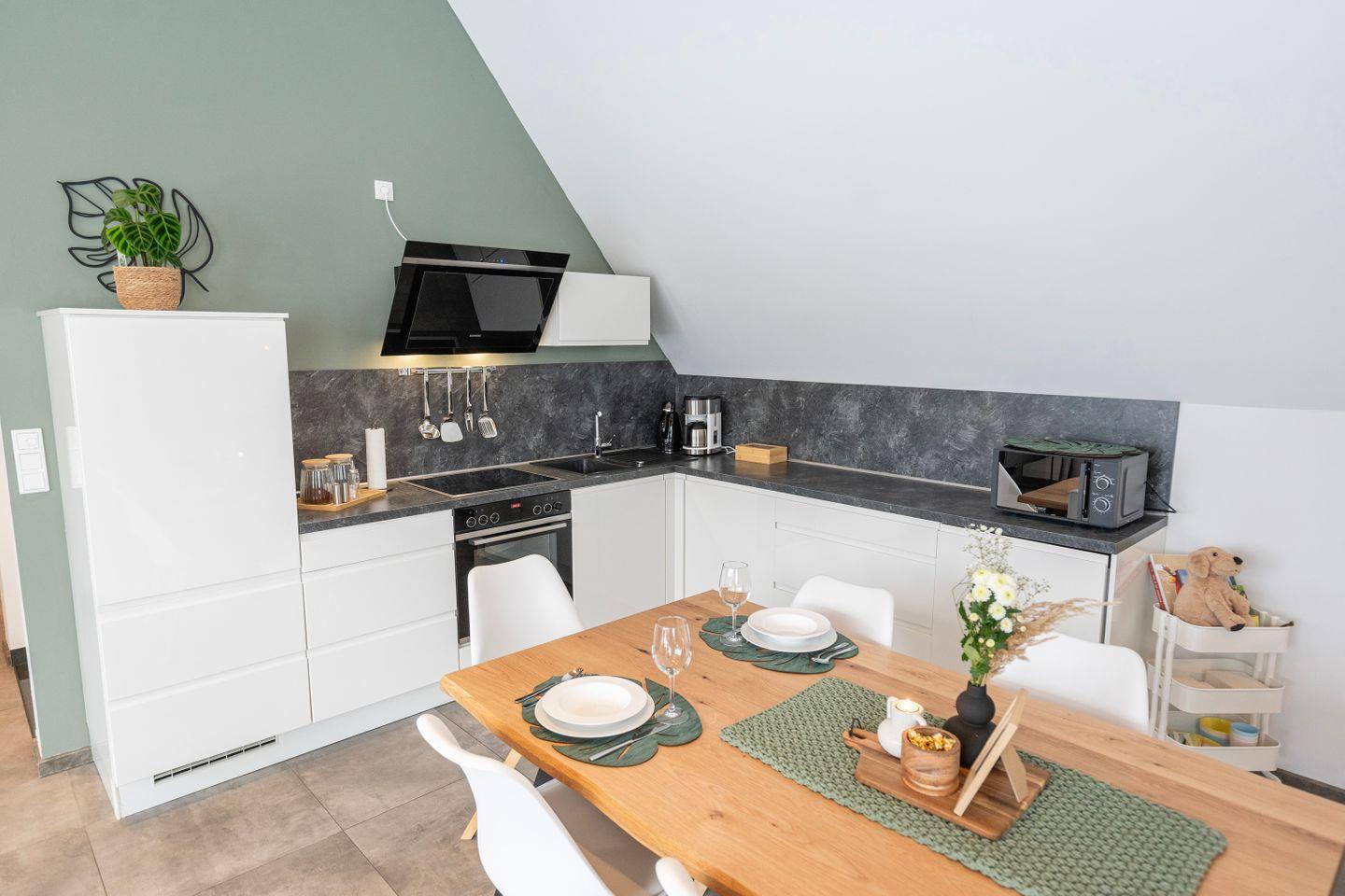 Die Küche ist voll ausgestattet mit Herd, Kühlschrank, Backofen, Spülmaschine, Mikrowelle und allem, was Du zum Kochen brauchst. Zusätzlich steht eine Waschmaschine zur Verfügung.
