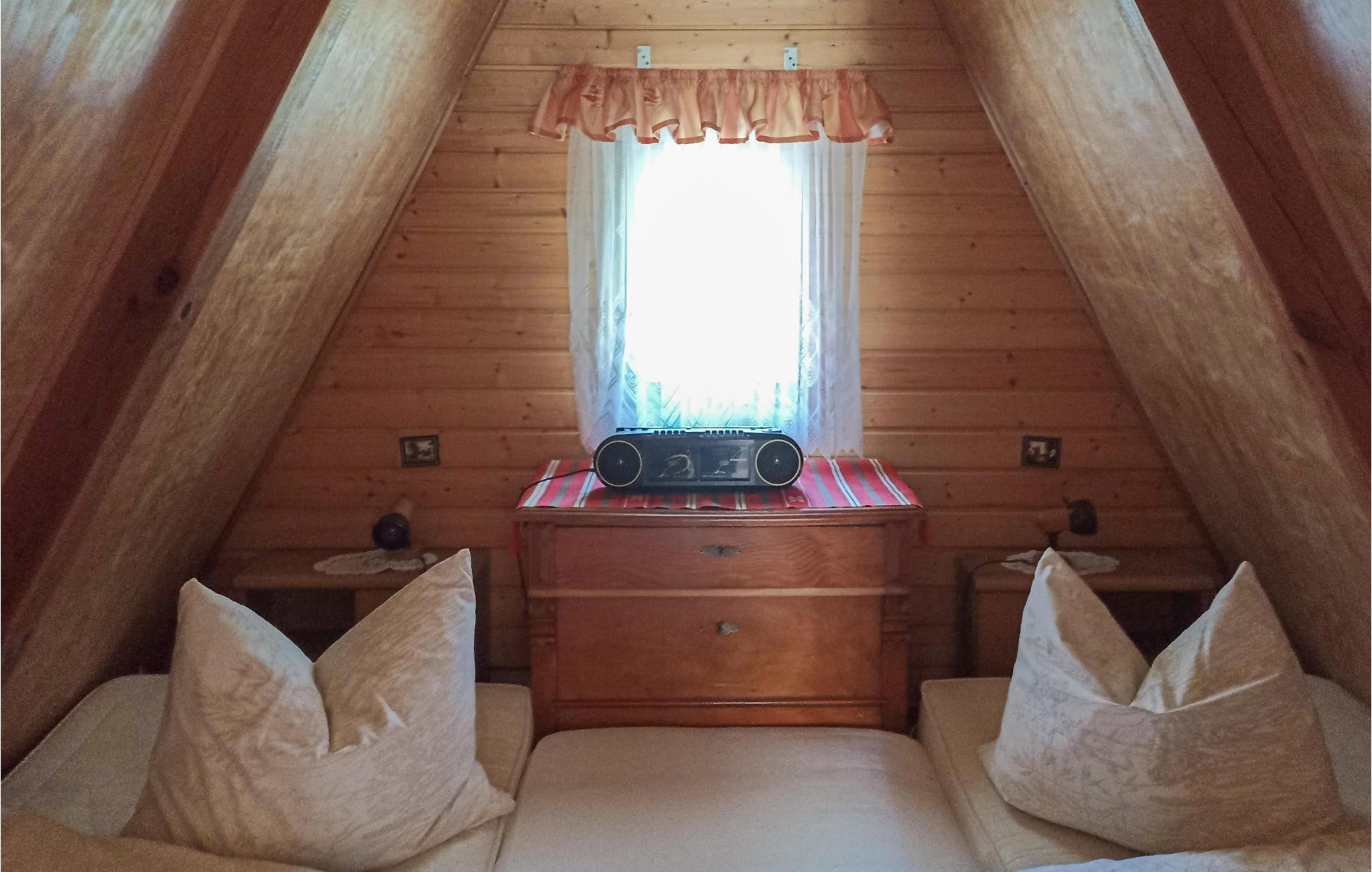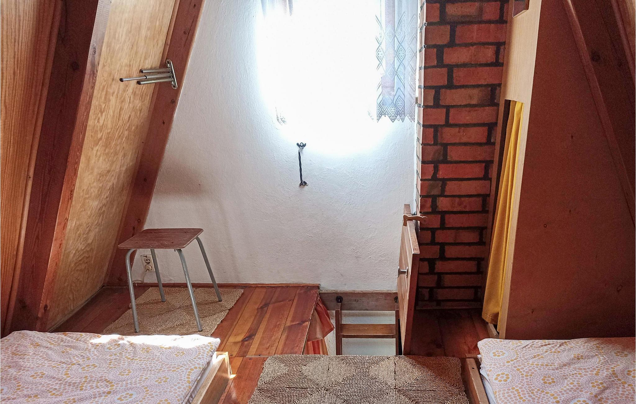 På den åbne terrasse står grillen og havemøblerne til rådighed til hyggeligt samvær. Her er også både gynge, bordfodbold og badminton til sjov for hele familien. Der er adgang til soveværelserne under det spidse tag via en stejl stige. I begge soveværelser er der enkeltsenge. Det ene soveværelse er gennemgangsrum til det andet. Tal med ejer og lej to cykler.