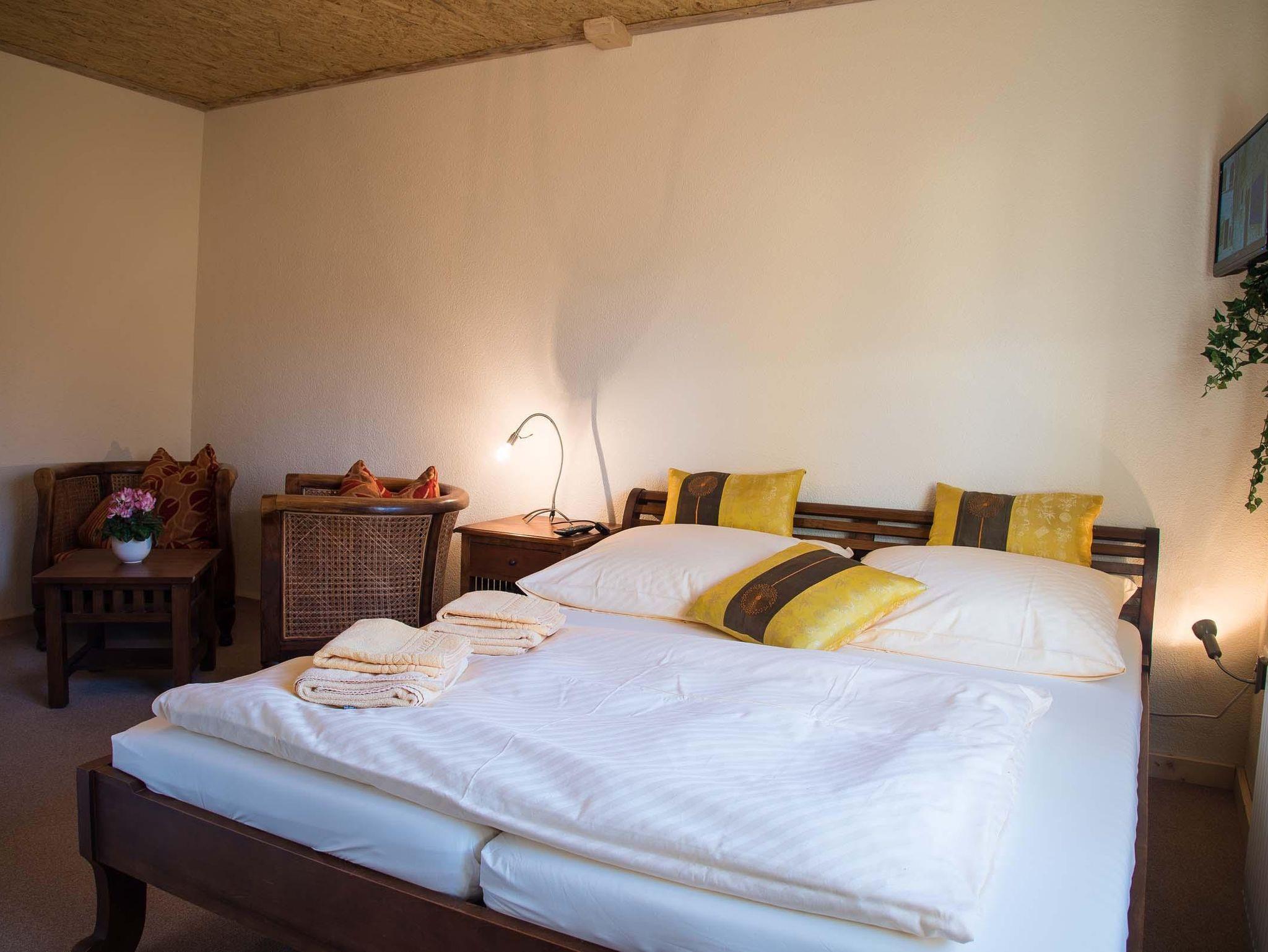 Das Zimmer Gamrig ist mit einem Doppelbett und einer kleinen Sitzecke sowie Dusche und WC eingerichtet.