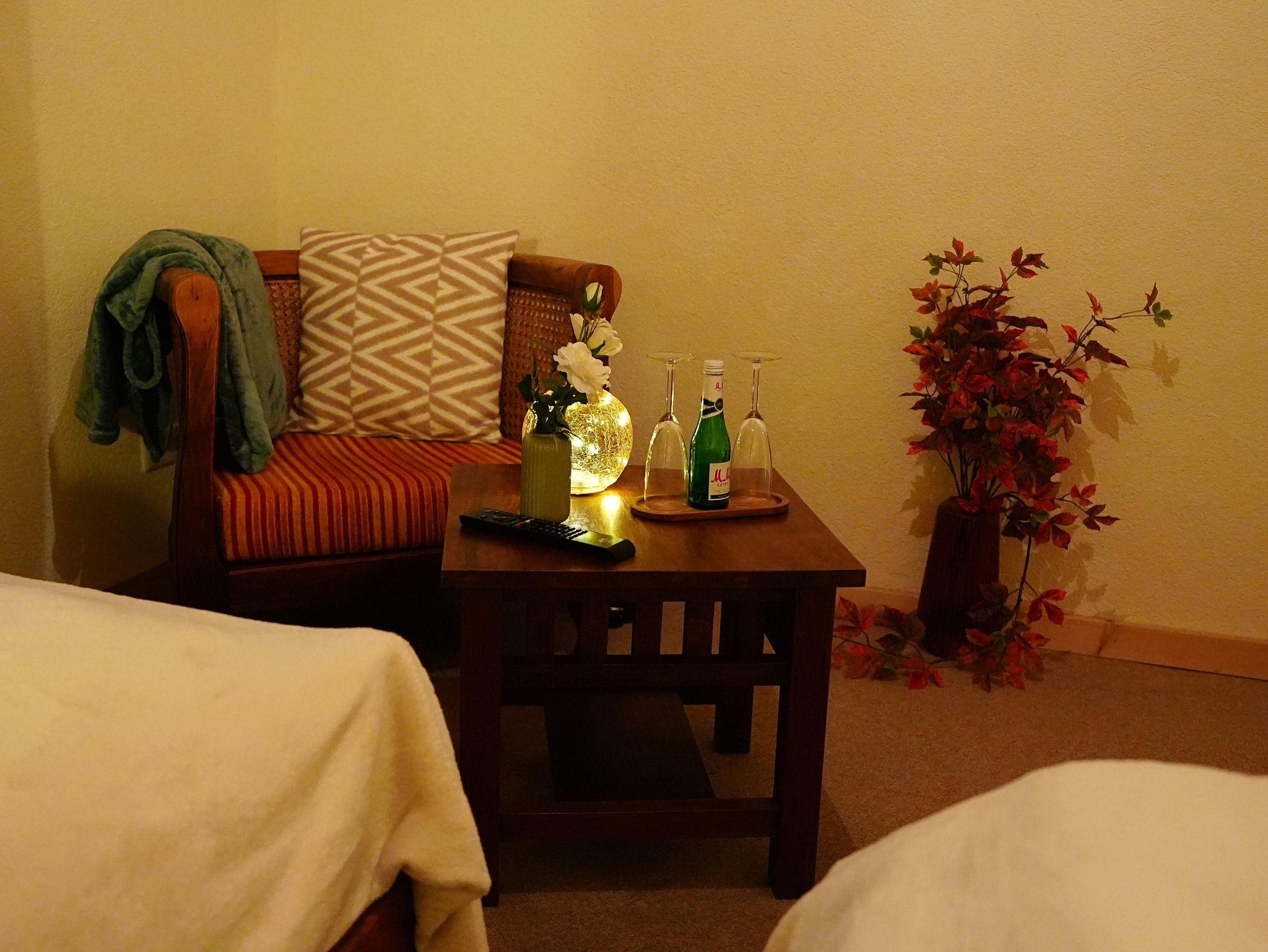 Das Zimmer Zwergenhöhle ist mit zwei Einzelbetten und einer kleinen Sitzecke eingerichtet. Die Dusche und WC befindet sich auf dem Flur und wird auch von anderen Gästen genutzt.