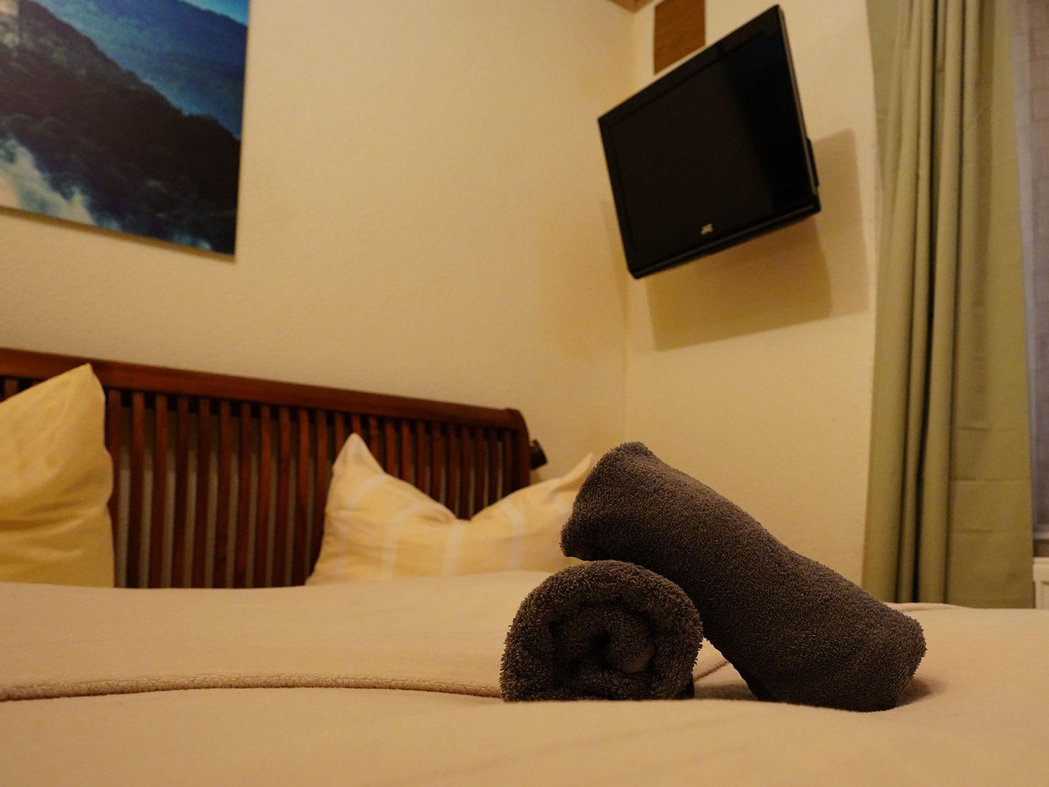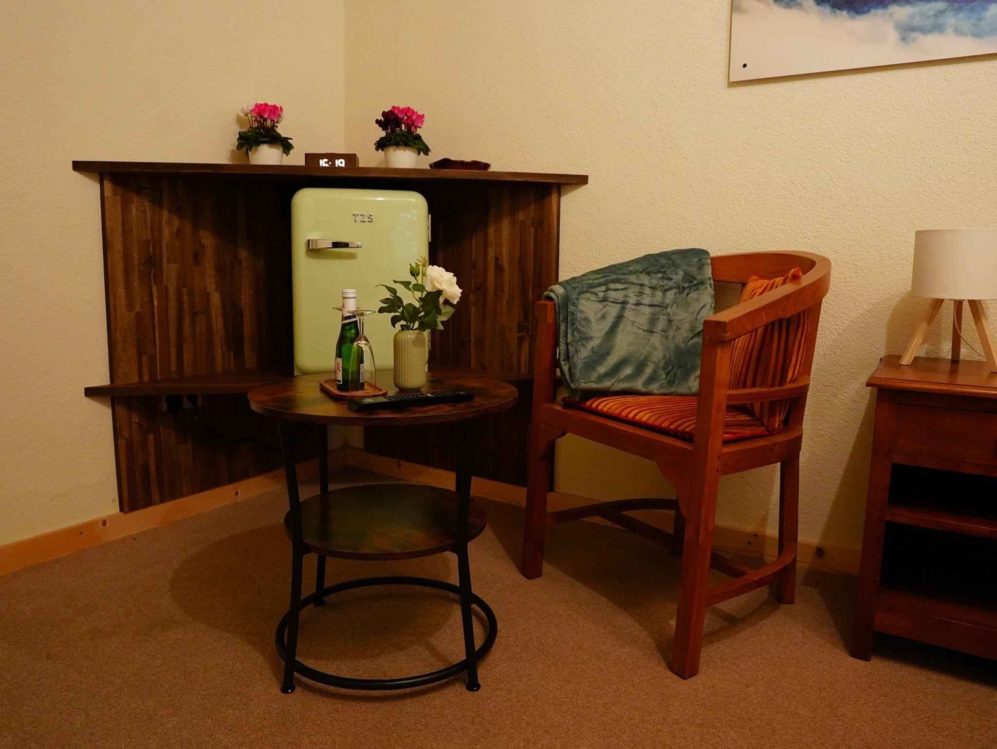 Das Zimmer Königstein ist mit einem Doppelbett und einer kleinen Sitzecke sowie Dusche und WC eingerichtet.