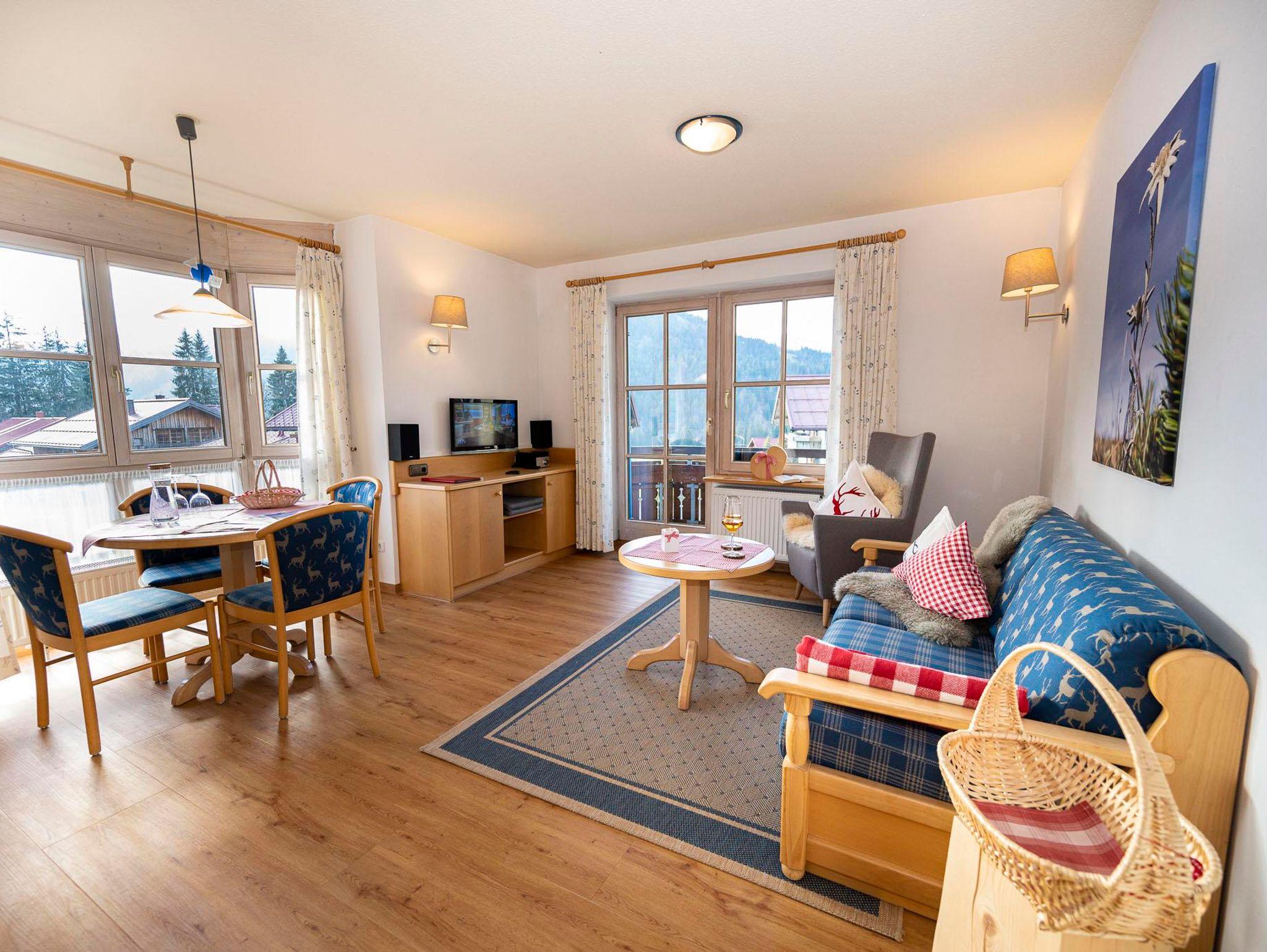 Helle Wohlfühlwohnung **** Buche: 4 Sterne Klassifiziert, im 1 OG/ca.45qm/2Pers. mit Ost-Südbalkon (m. Möblierung) freien Blick in die Oberallgäuer Alpen, ist im gemütlichen, hellen Landhausstil einger.,großer Wohnbereich mit Ausziehcouch und Sitzgarnitur, Essecke und Küche m.Spülmaschine, Cerankochfeld, Mikrowelle, Kühlschrank mit Gefrierfach und Backofen. Schönes Schlafzimmer mit Balkon zur Ostseite und Schranksafe. Bad hat zwei Waschbecken/DU/WC/Fenster. Sat-TV, Hifi-Anlage, kostenfreies Internet
