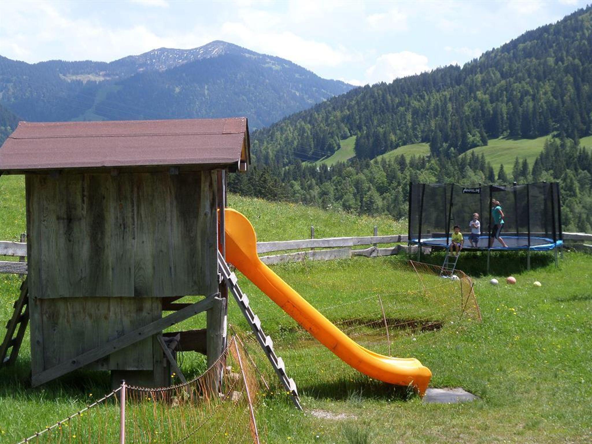 Unsere Streicheltiere und Spielfahrzeuge entführen Ihre Kinder in die Welt des Bauernhofes, während Sie auf der Sonnenterasse bei Kuhglockengeläut den traumhaften Ausblick auf die Berggipfel genießen und den Duft der umliegenden Almwiesen atmen.