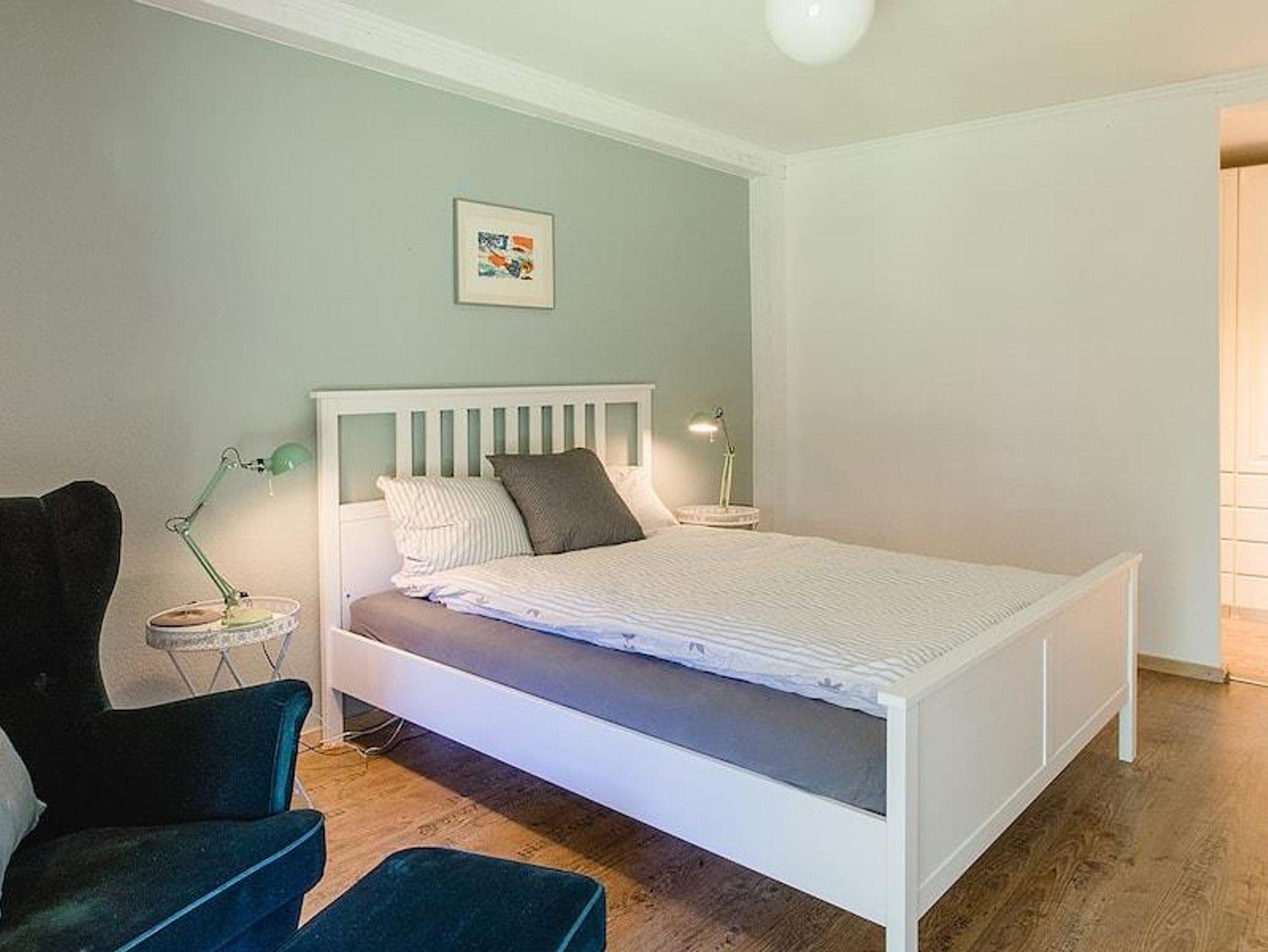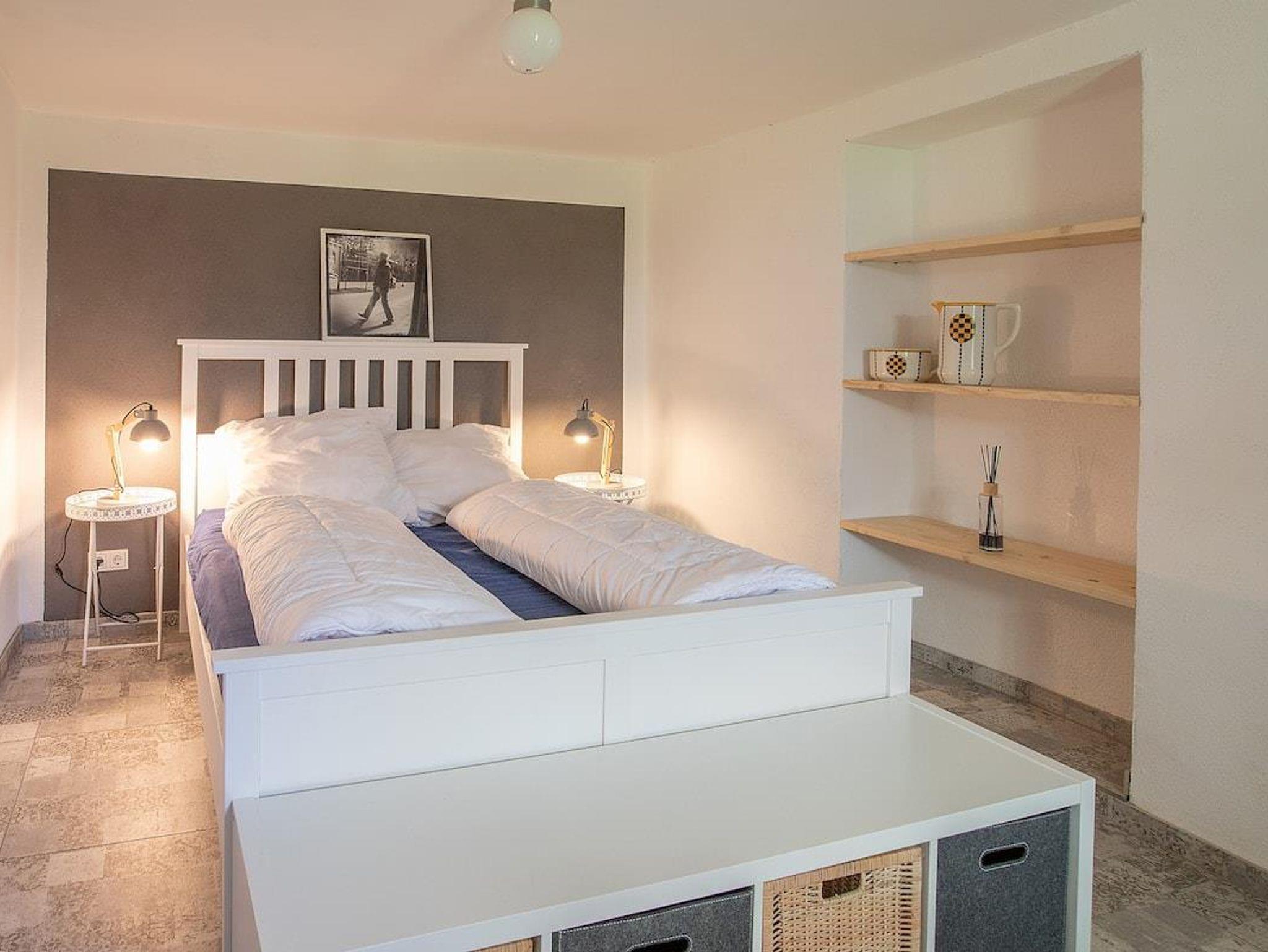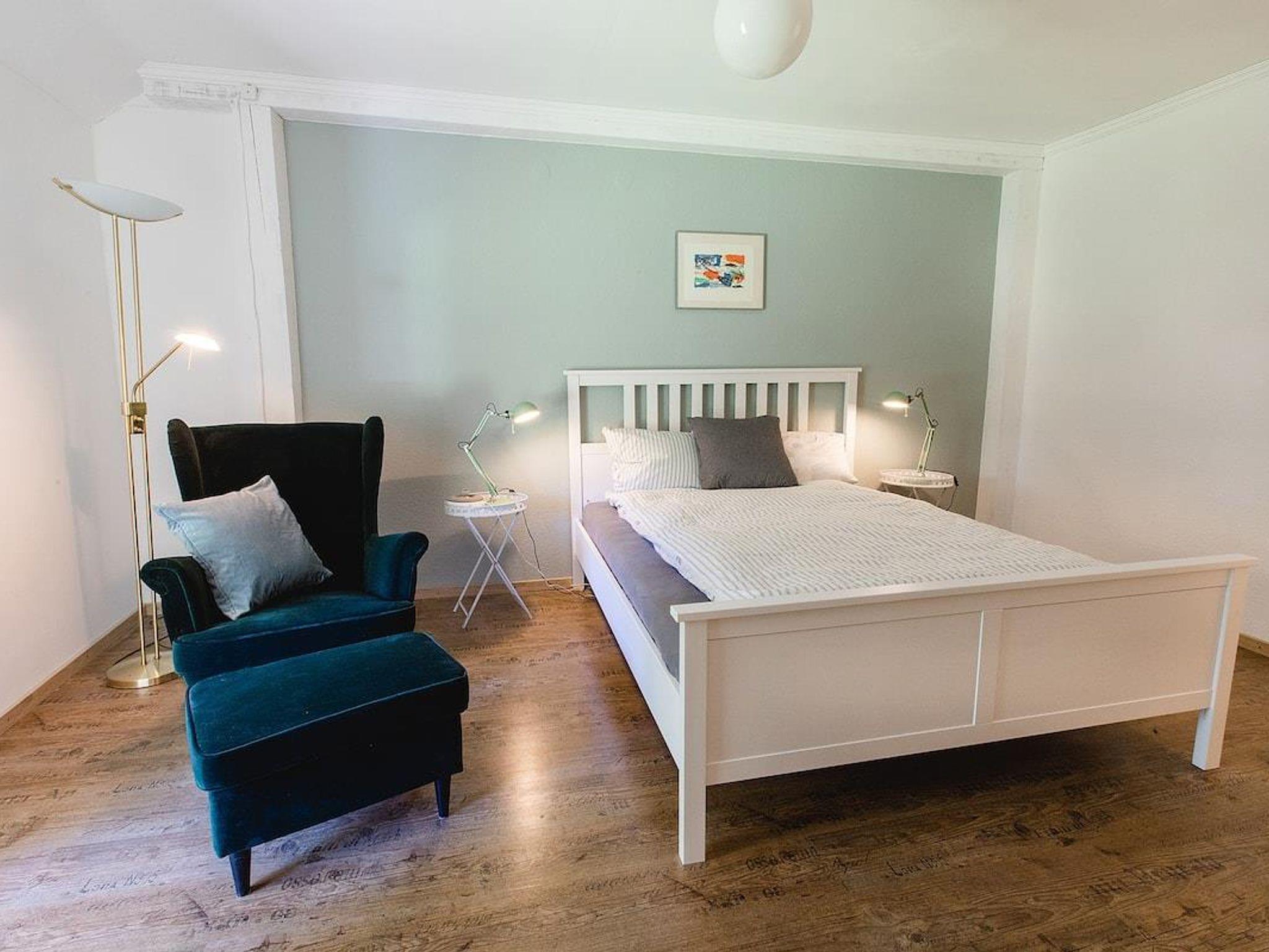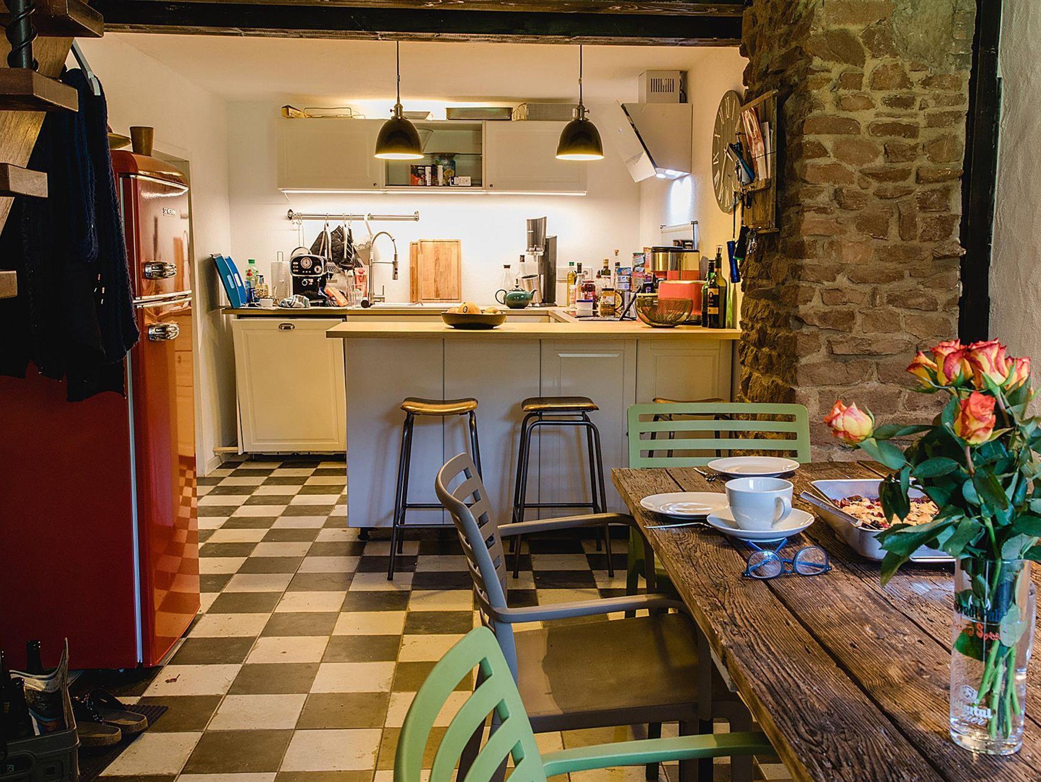 Erdgeschoss: Offene Küche (Fußbodenheizung); Esstisch für 8 Personen, Ofen, Kaffeemaschine, Backofen, Spülmaschine, Kühlschrank, 1. Schlafzimmer mit Doppelbett (Fußbodenheizung), Badezimmer mit Badewanne oder Dusche, Toilette