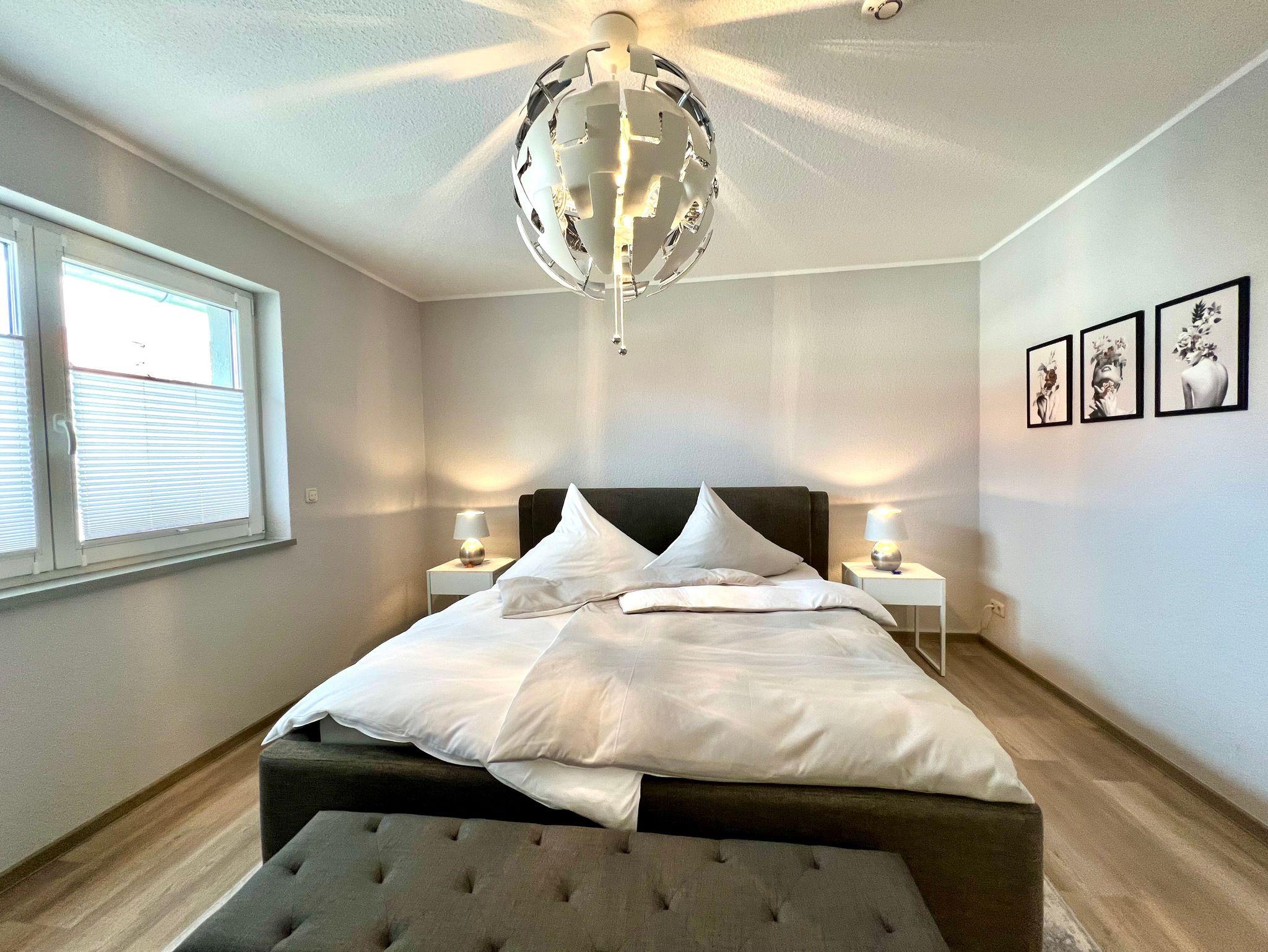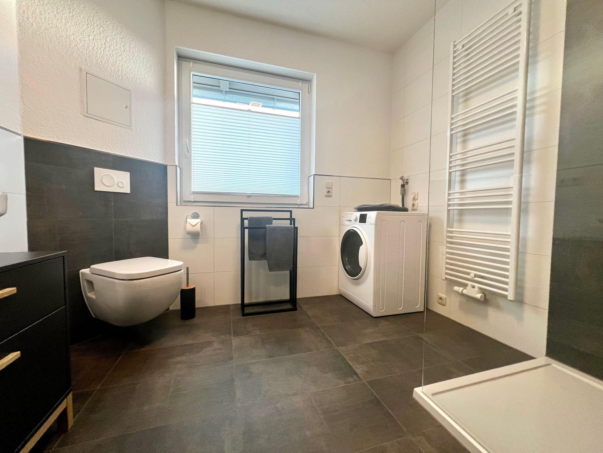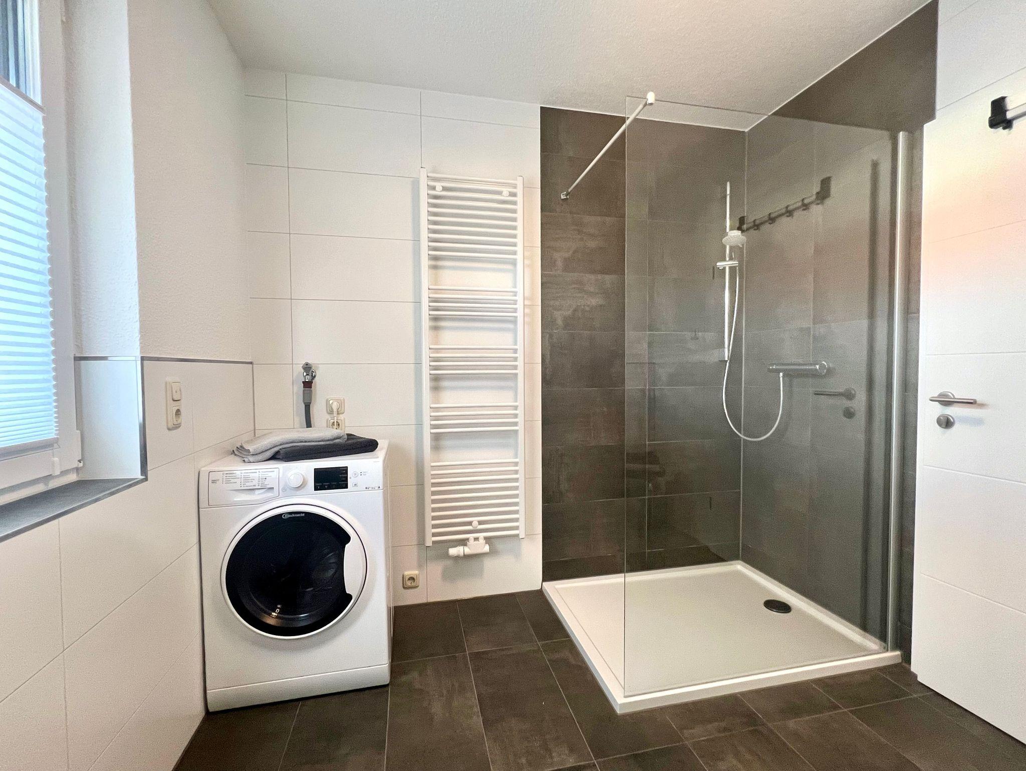 Im Schlafzimmer steht ein komfortables Doppelbett sowie ein Kleiderschrank. Im Duschbad befindet sich außerdem eine Waschtrockner.