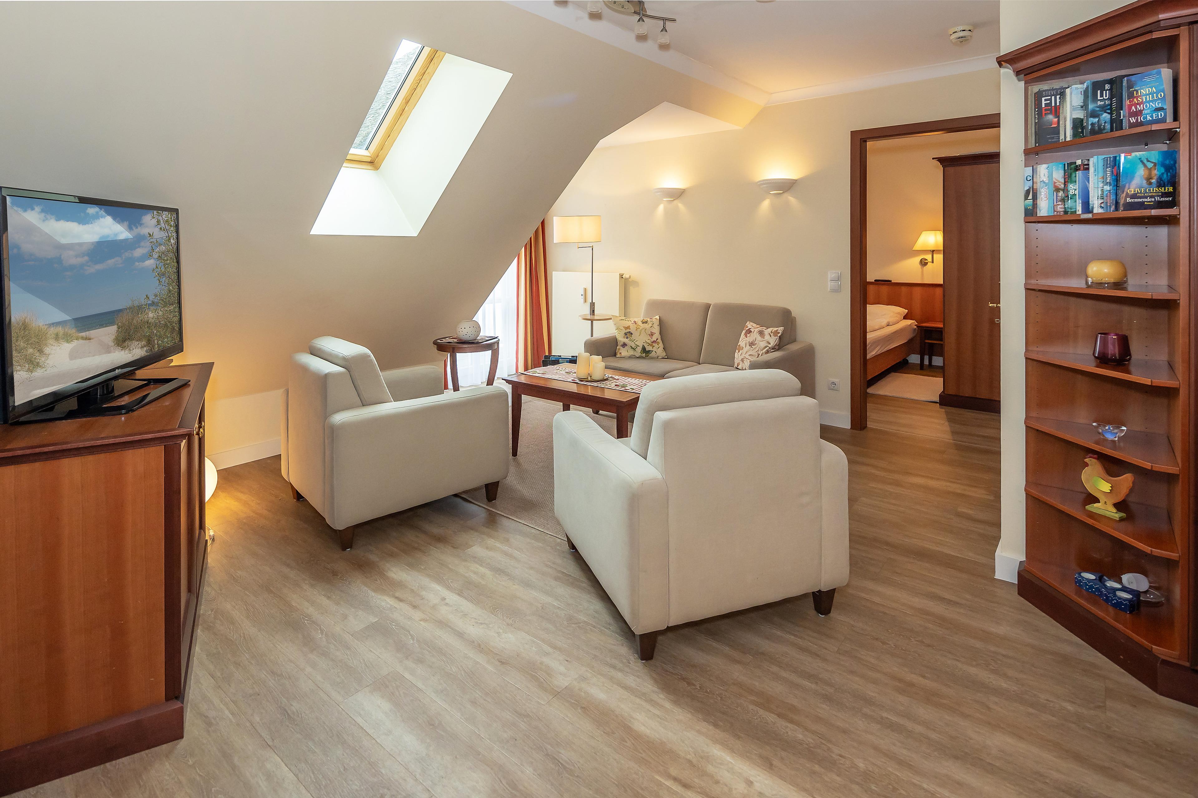 Unsere Gäste können den gesamten 1500 m2 großen Spa-und Wellnessbereich mit diversen Saunen, Aromadampfkabine, Eisgrotte ,Ruheräumen , Innenpool , Außenschwimmteich und Liegewiesen am Achterwasser im naheliegenden Hotel optional als kleine Serviceleistung hinzubuchen. Hier an der Rezeption des Wellnessbereiches können Sie auch unkompliziert Massagen oder sonstige Anwendungen buchen. Im naheliegenden Asia Pavillon werden sogar Thaimassagen und diverse andere Anwendungen angeboten. Im Hotel an der Rezeption können Sie Brot oder Brötchen bestellen und auch diverse Zeitungen käuflich erwerben. Dank eines vorhandenen eigenen Miniofens mit Grillvorrichtung können Sie auch Ihre Brötchen selbst aufbacken. Gegen entsprechendes Entgelt können Sie auch natürlich das Frühstück im Hotel einnehmen, sowie alle weiteren Lokalitäten -Steakhus , Alte Schule (Italienische Küche )- des Hotels aufsuchen.
