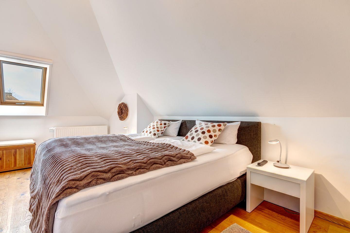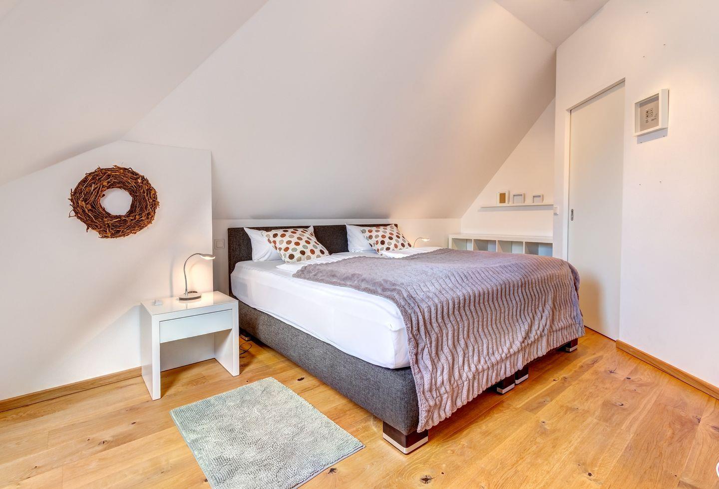 Die Wohnung verfügt über ein gemütliches Schlafzimmer mit einem komfortablen Box-Spring-Doppelbett, das für erholsame Nächte sorgt. Eine Galerie mit einer Schlafcouch bietet Platz für bis zu 4 Personen und sogar ein Kleinkind kann hier bequem untergebracht werden.