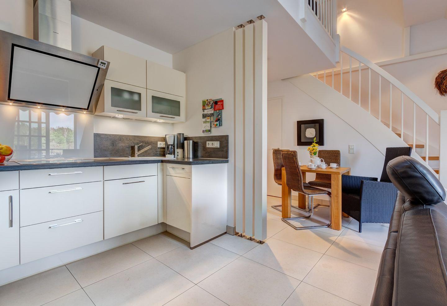 Die vollwertige Küche ist harmonisch in den Wohnbereich integriert und bietet Ihnen alle Annehmlichkeiten, um sich selbst zu versorgen und köstliche Mahlzeiten zuzubereiten.