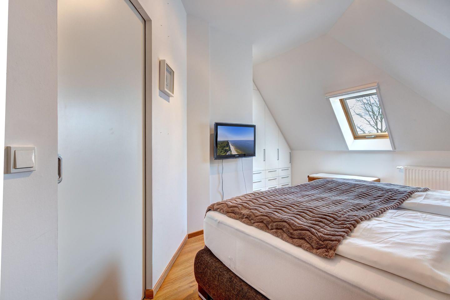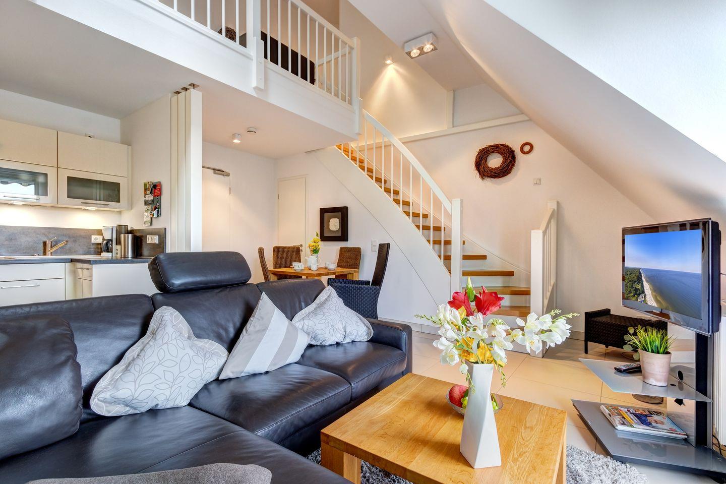 Diese 62 Quadratmeter große Wohnung bietet Ihnen ein einzigartiges Wohnambiente. Der Wohn-Essbereich erstreckt sich bis zum offenen Giebel und öffnet sich zu einem Balkon mit malerischem Blick auf das Achterwasser. Ein gemütliches Schlafzimmer mit einem komfortablen Box-Spring-Doppelbett und eine Galerie mit einer Schlafcouch bietet Platz für bis zu 4 Personen mit Kleinkind.