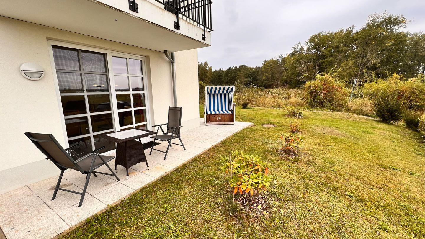 Schöner Urlaub zu zweit! Charmante 2-Raum-Wohnung mit vollwertigem Schlafzimmer und einer Größe von ca. 45m². Vollwertige Einbauküche mit Geschirrspüler und Mikrowellengerät. Mit der Terrasse im Erdgeschoß mit einem Blick in Richtung Achterwasser eignet sich die Wohnung perfekt für 2 Personen.
