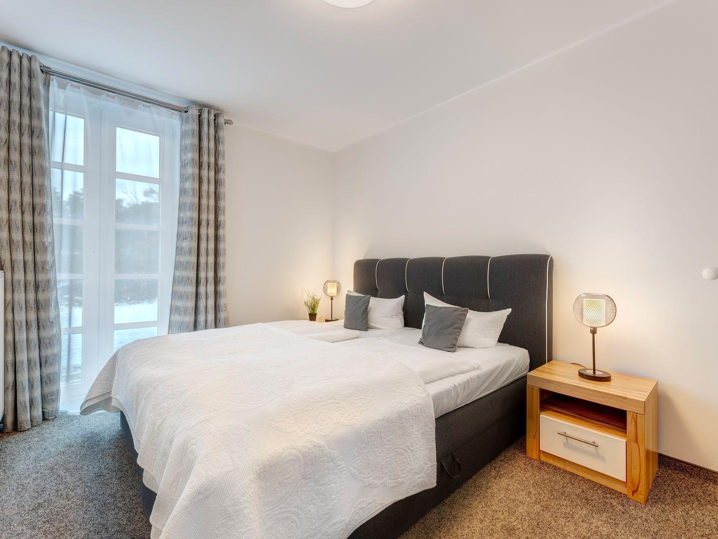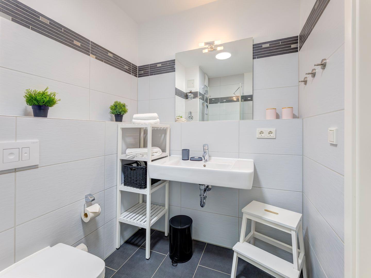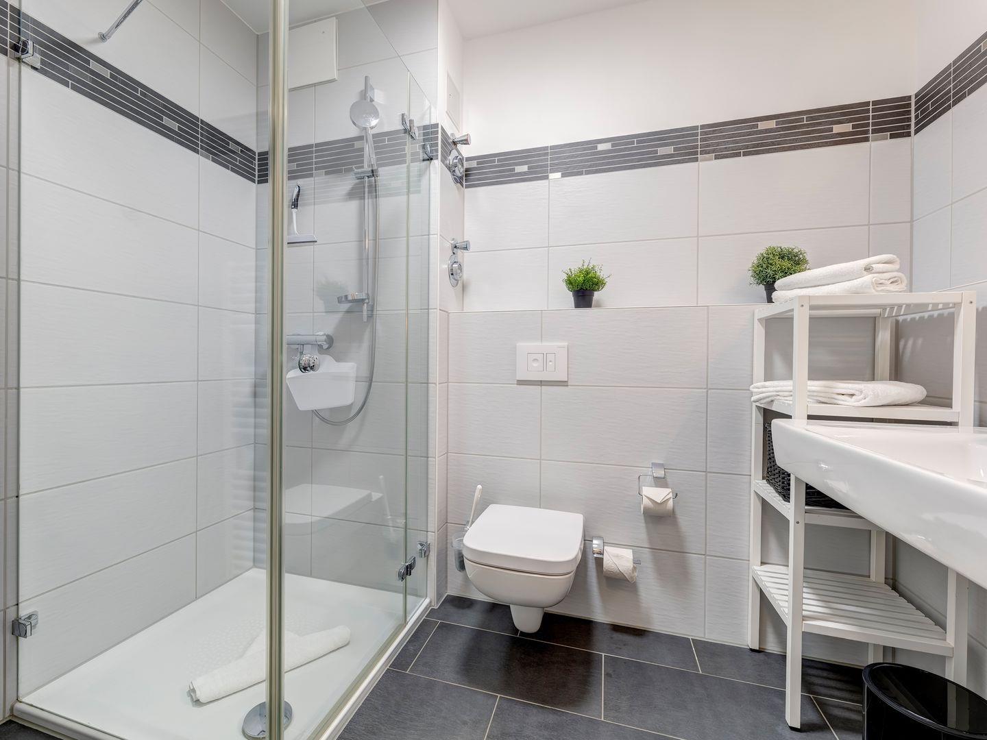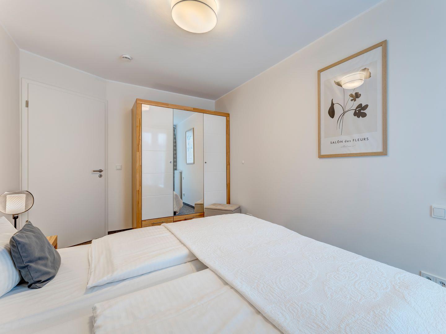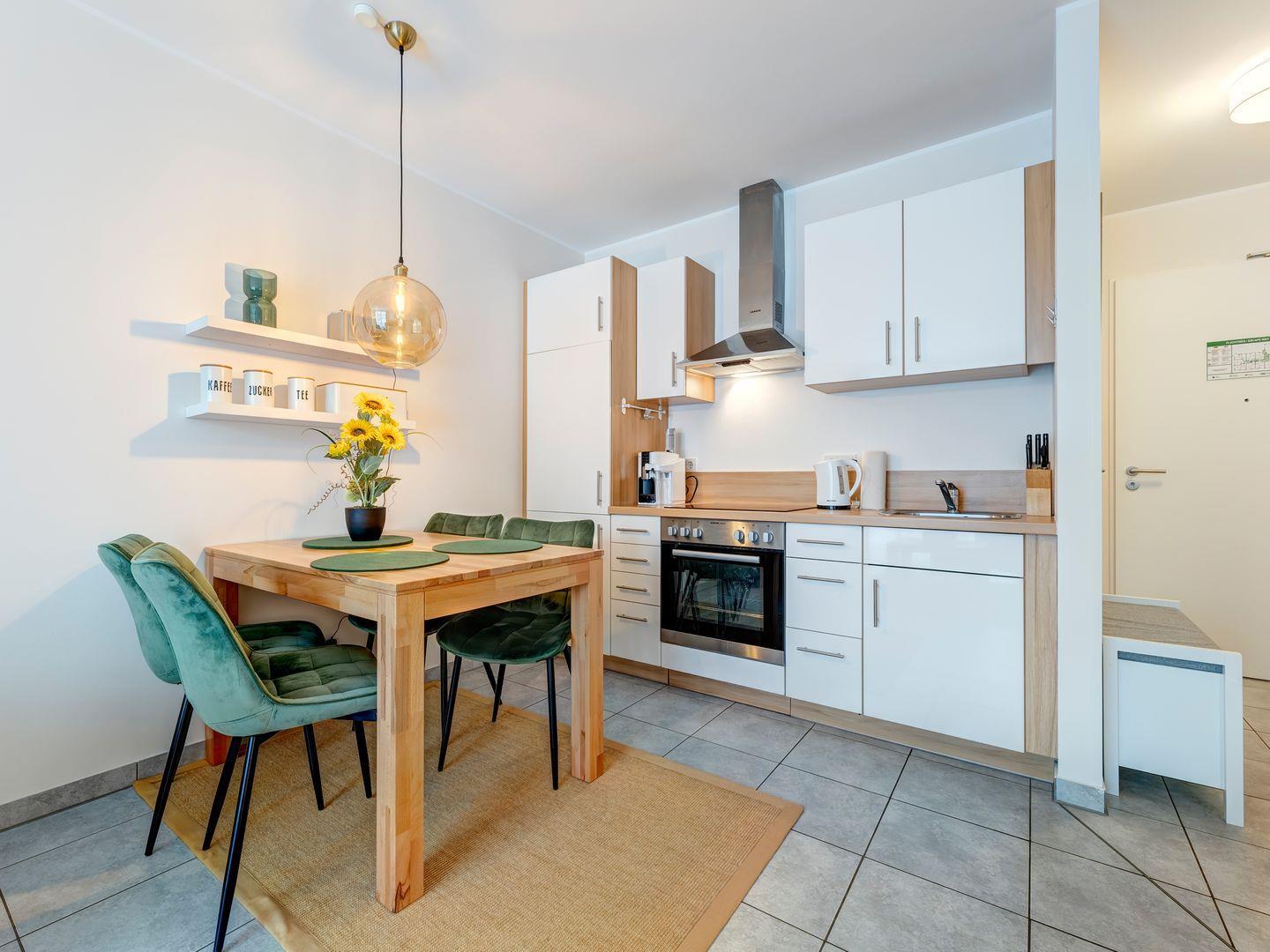 Mit einer umfassenden Küchenausstattung, u.a. mit Geschirrspüler, Herd/Backofen, Kühlschrank/Gefrierfach, zusätzlicher Pad-Kaffeemaschine, Wasserkocher, Toaster etc. können Sie sich nach Herzenslust selbst verköstigen. Daneben verfügt die Wohnung über ein hochwertiges Badezimmer mit barrierefreier Dusche sowie ein gemütliches Schlafzimmer mit großem Boxspringbett und geräumigem Kleiderschrank.