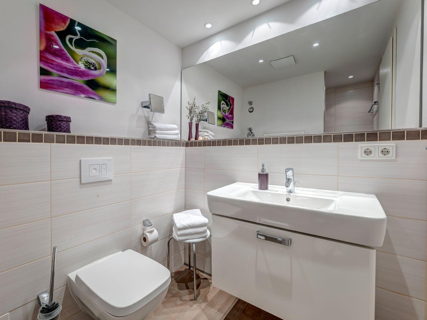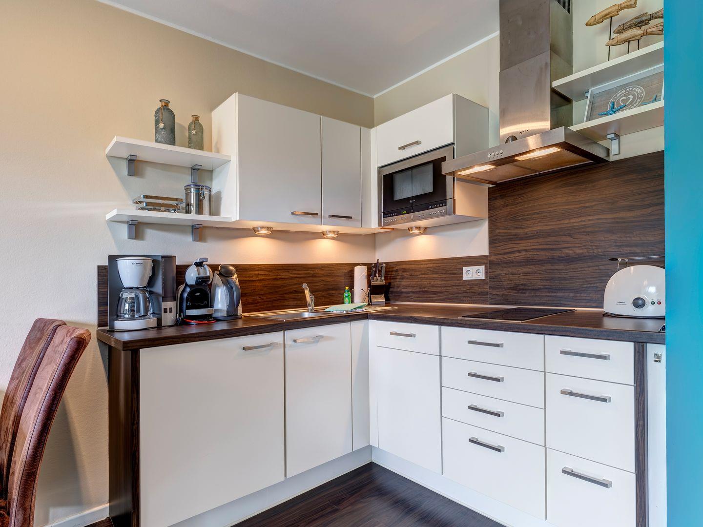 Mit etwas Glück können Sie hier Fischreiher beim aktiven Jagen beobachten oder sogar Biber bei ihrer Tätigkeit erleben. Die offene Küche ist hochwertig ausgestattet und lädt dazu ein, kulinarische Köstlichkeiten zuzubereiten. Das Badezimmer verwöhnt Sie mit einer sehr geräumigen offenen Dusche, einem stilvollen Waschtisch mit Unterschrank und Kosmetikeinschüben, einem Handtuchheizkörper, Fußbodenheizung, Fön und Kosmetikspiegel.