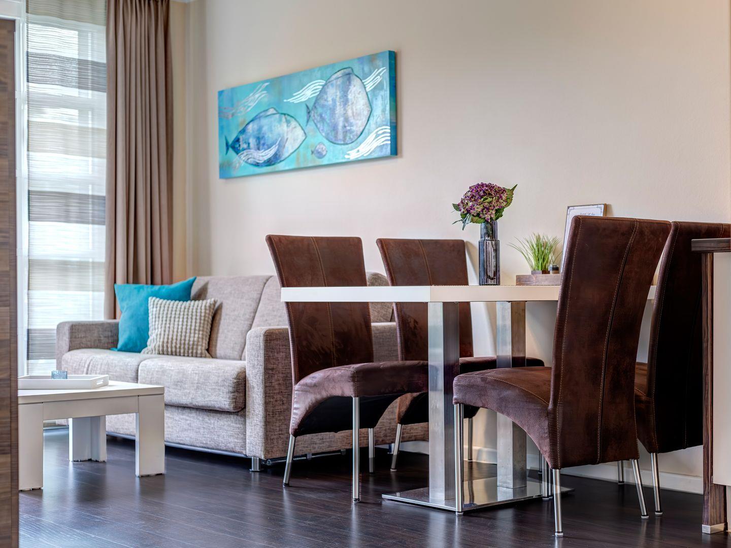 Das vollwertige Schlafzimmer mit einem komfortablen Doppelbett sowie eine hochwertige, leicht ausklappbare Couch garantieren qualitativ gleichwertige Schlafmöglichkeiten für einen erholsamen Schlaf. Der gemütliche Wohn-/Essbereich mit offener Küche sowie der modernen Einrichtung wie z.B. Airfryer, öffnet sich zu einem Balkon, der dank seiner nordwestlichen Ausrichtung ab nachmittags von der Sonne verwöhnt wird. Genießen Sie nach Ihren Ausflügen oder sportlichen Aktivitäten einen idyllischen Blick auf den Fischteich und das Achterwasser bei einem Glas Wein.
