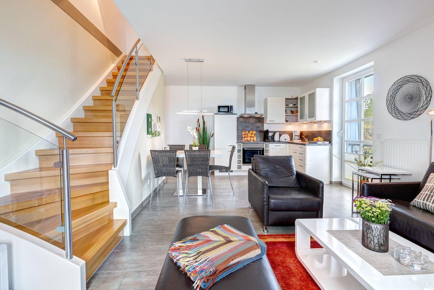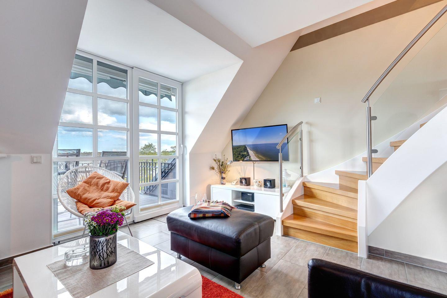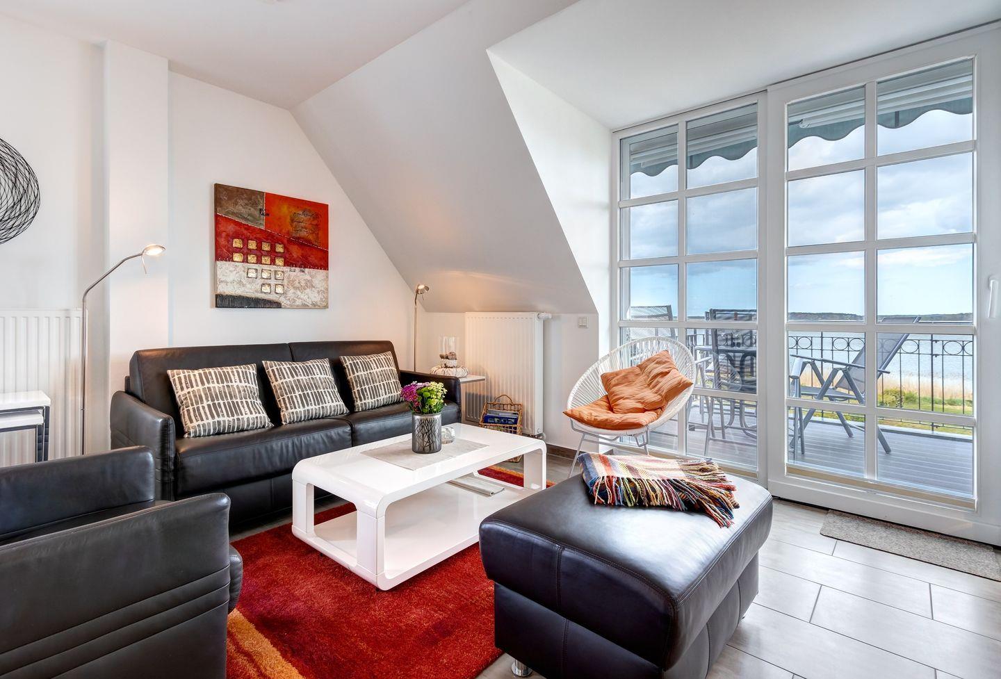 Der untere Bereich beeindruckt mit einem großzügigen Wohnzimmer, das nahtlos in eine offene Küche mit einem komfortablen Esstisch übergeht. Von hier aus öffnen sich die Türen zu einem malerischen Ausblick auf das Achterwasser. Der mit einer Markise ausgestattete Balkon lädt dazu ein, entspannte Urlaubsmomente im Freien zu genießen.